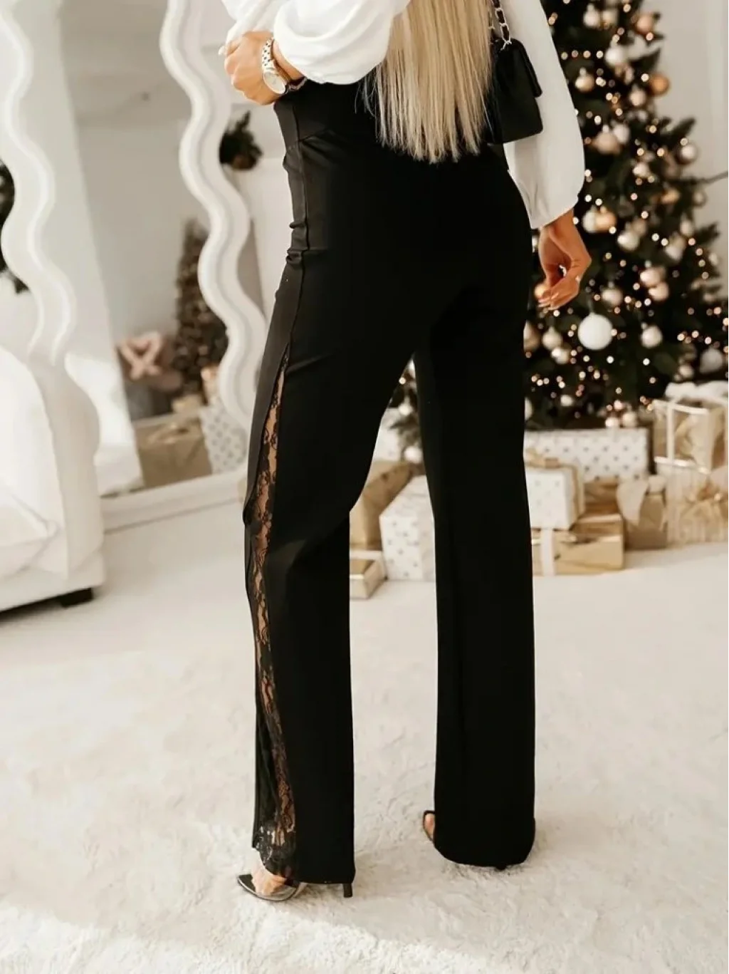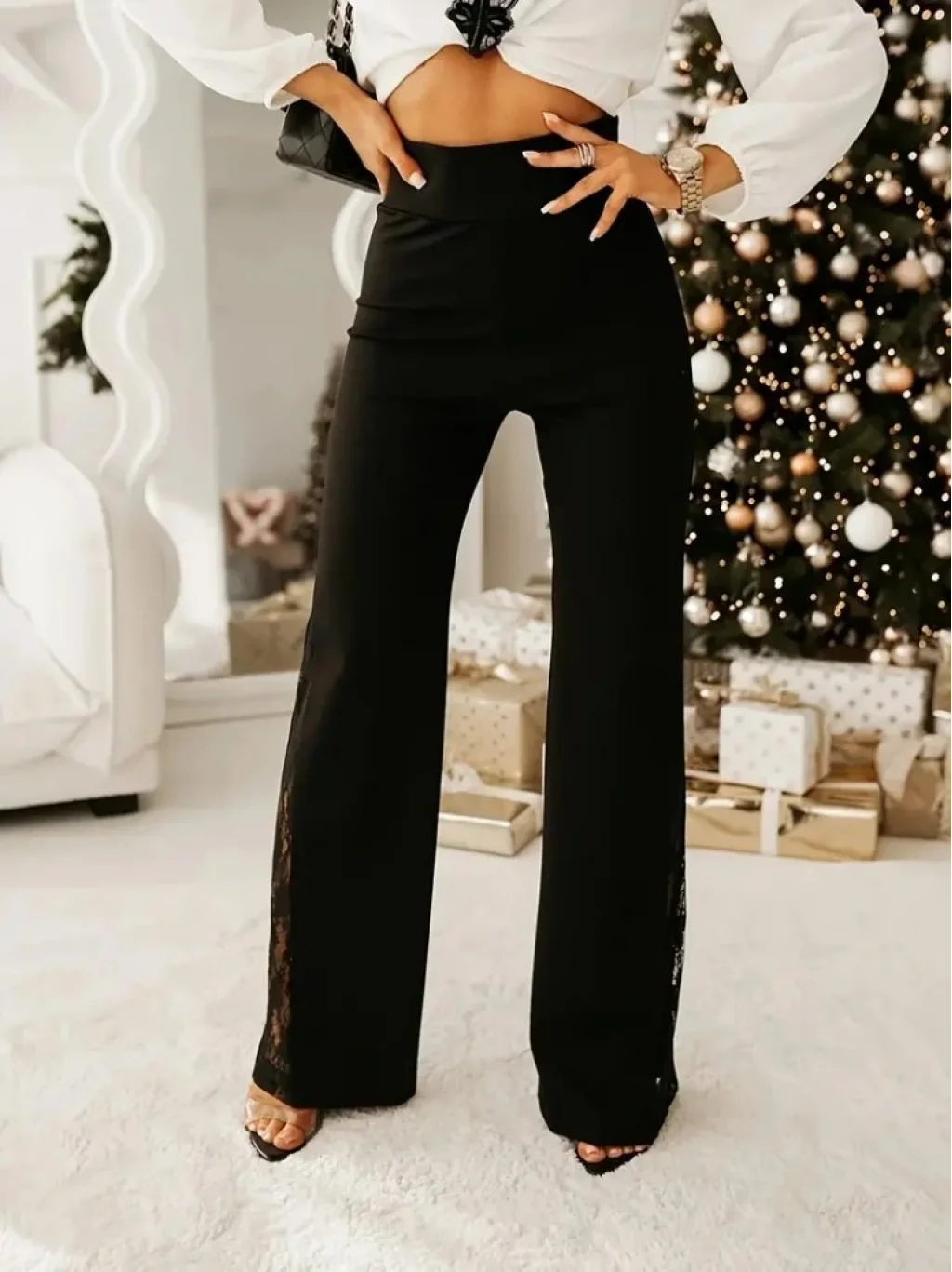 Kadın Yüksek Bel Yanlardan Dantelli Paçaya Doğru Geniş Kesim Detaylı Ithal Krep Pantolon