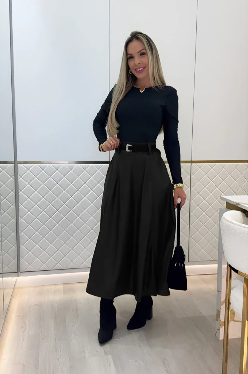 Kadın Yüksek Belli Maxi Deri Kemersiz Etek