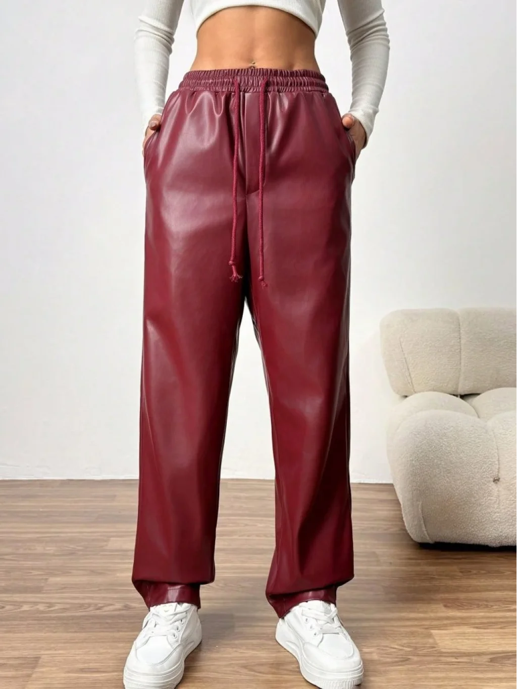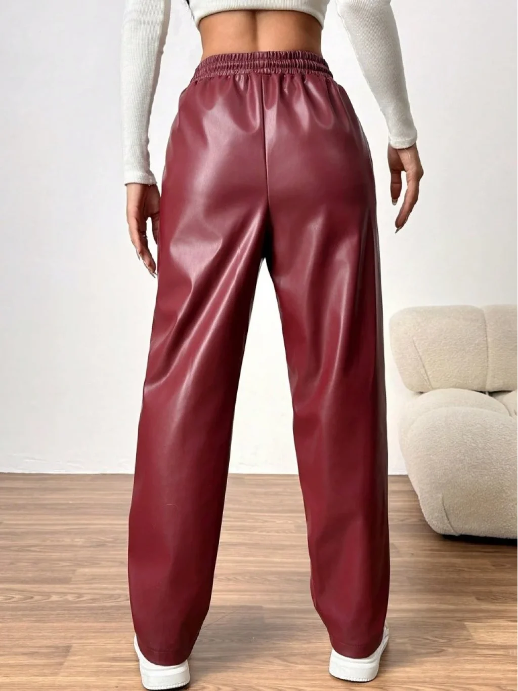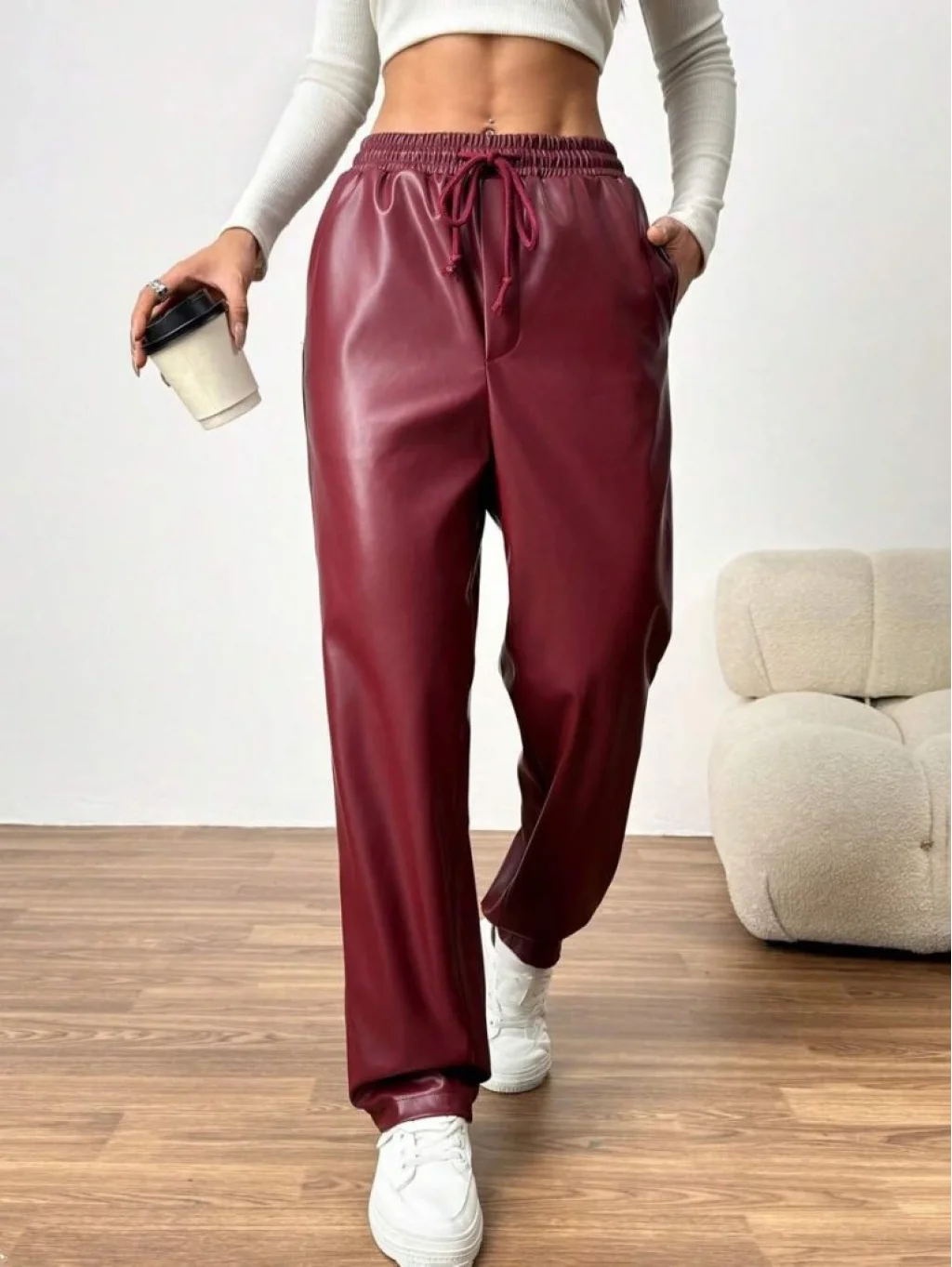 Kadın Yüksel Bel Bağcıklı Deri Pantolon