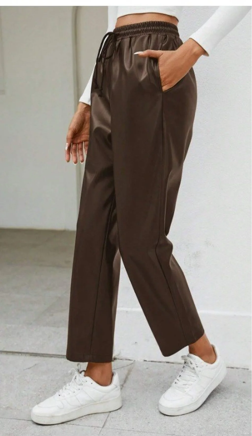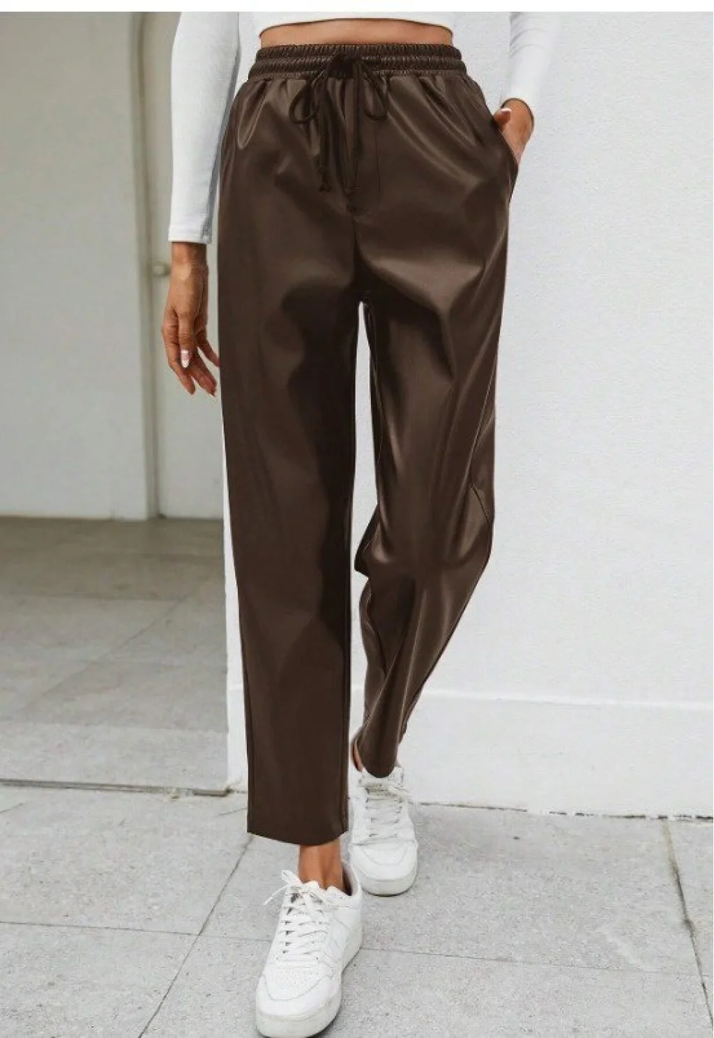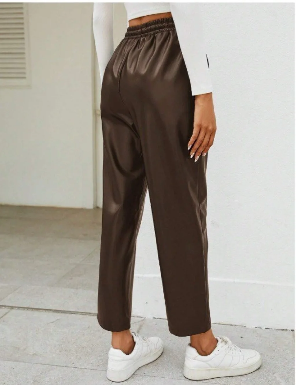 Kadın Yüksel Bel Bağcıklı Deri Pantolon