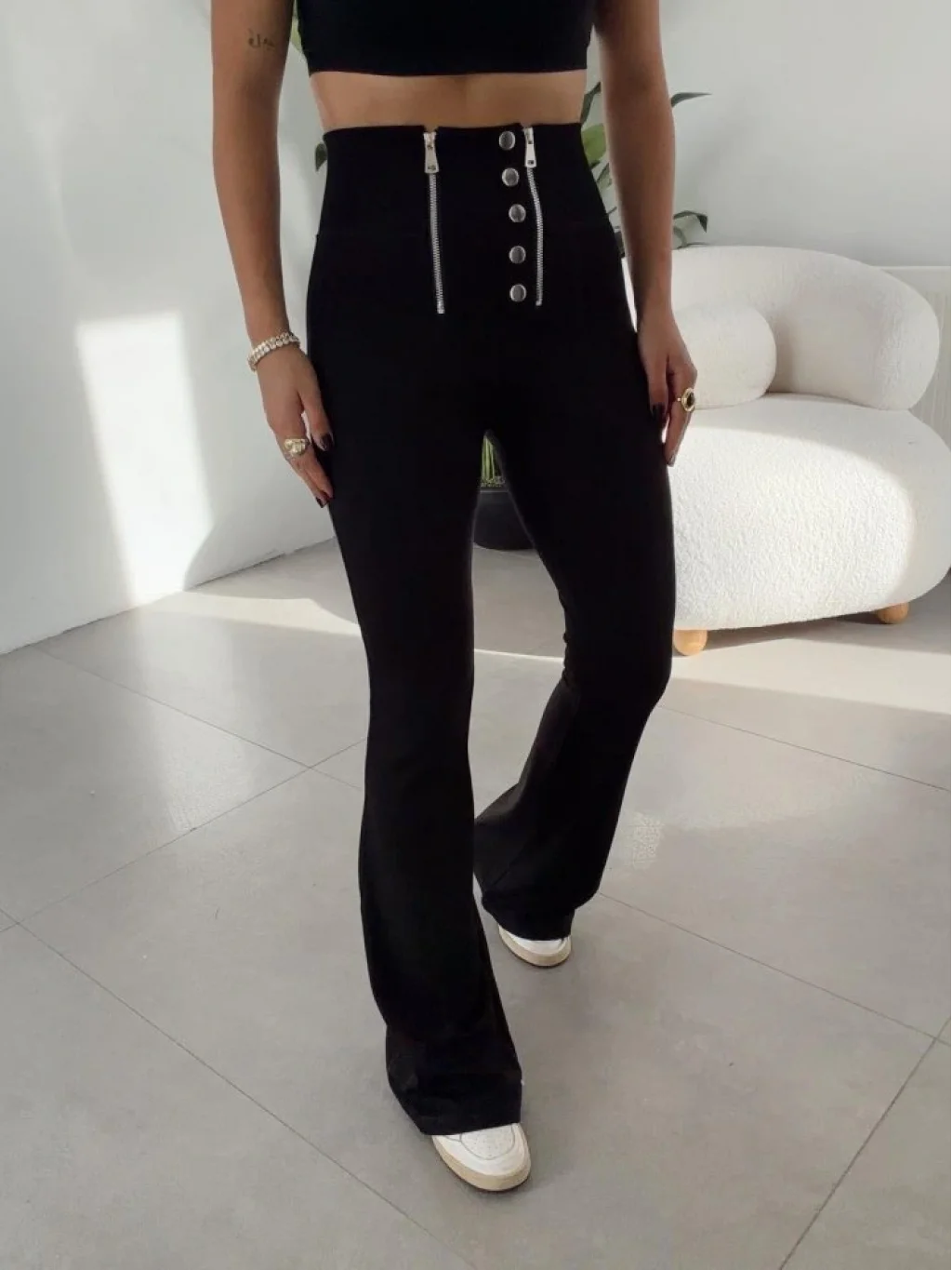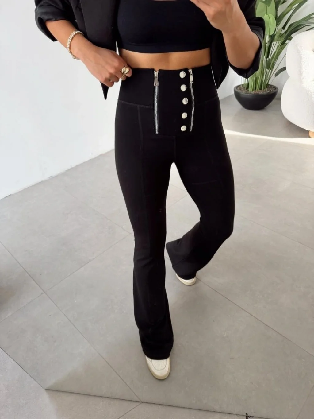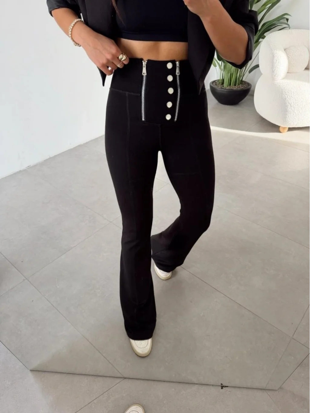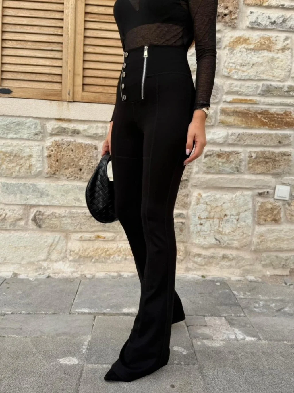 Kadın Yüksel Bel Düğme Ve Fermuar Detay çelik Kumaş Ispanyol Paça Tayt