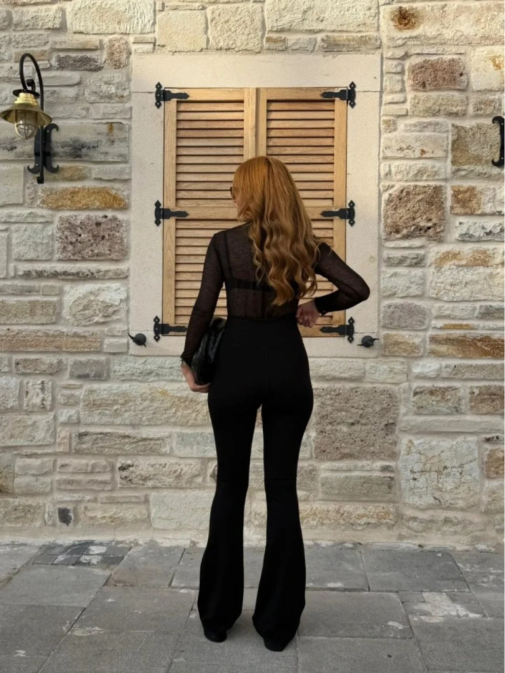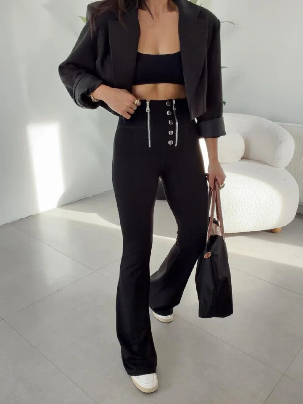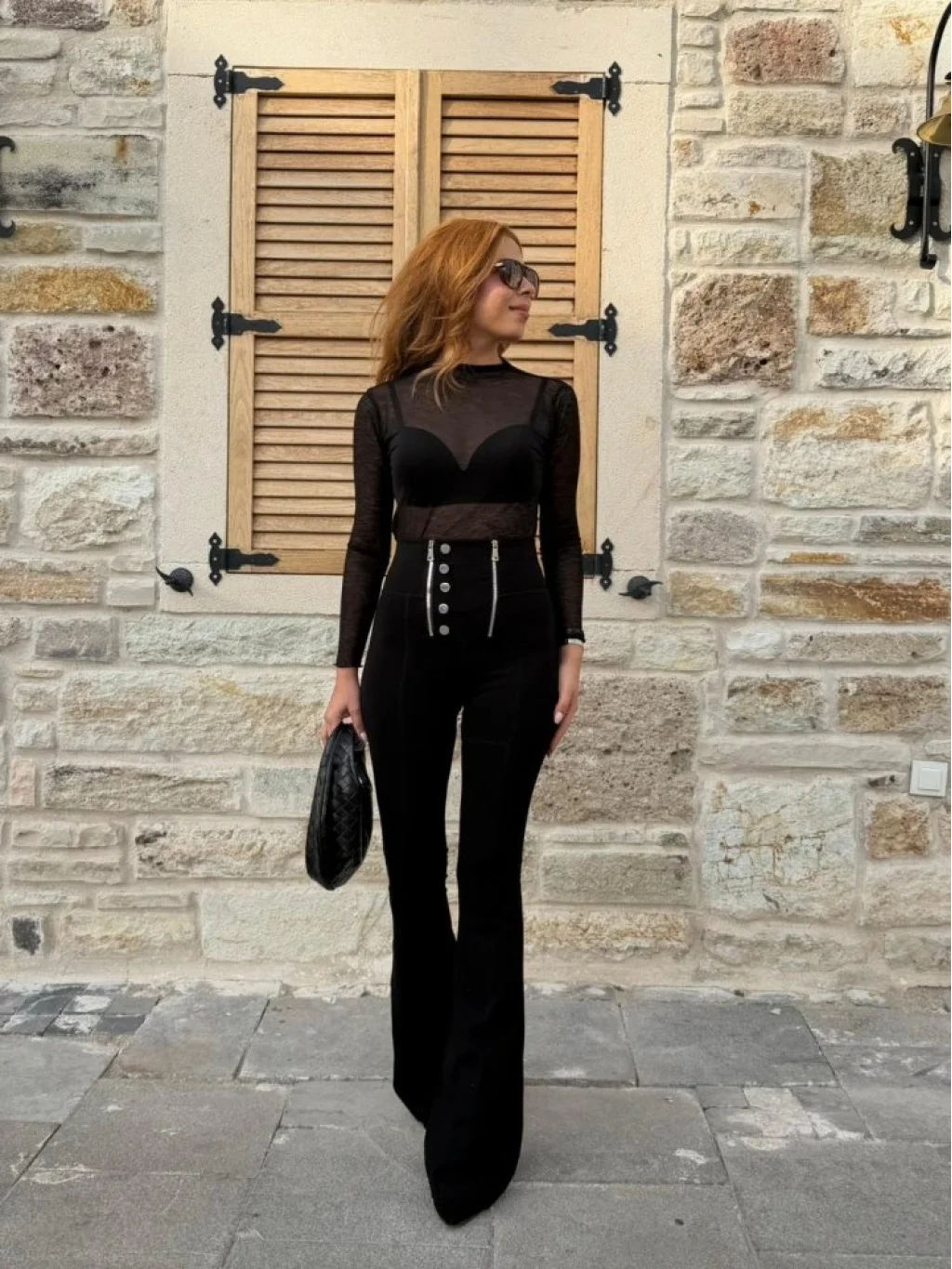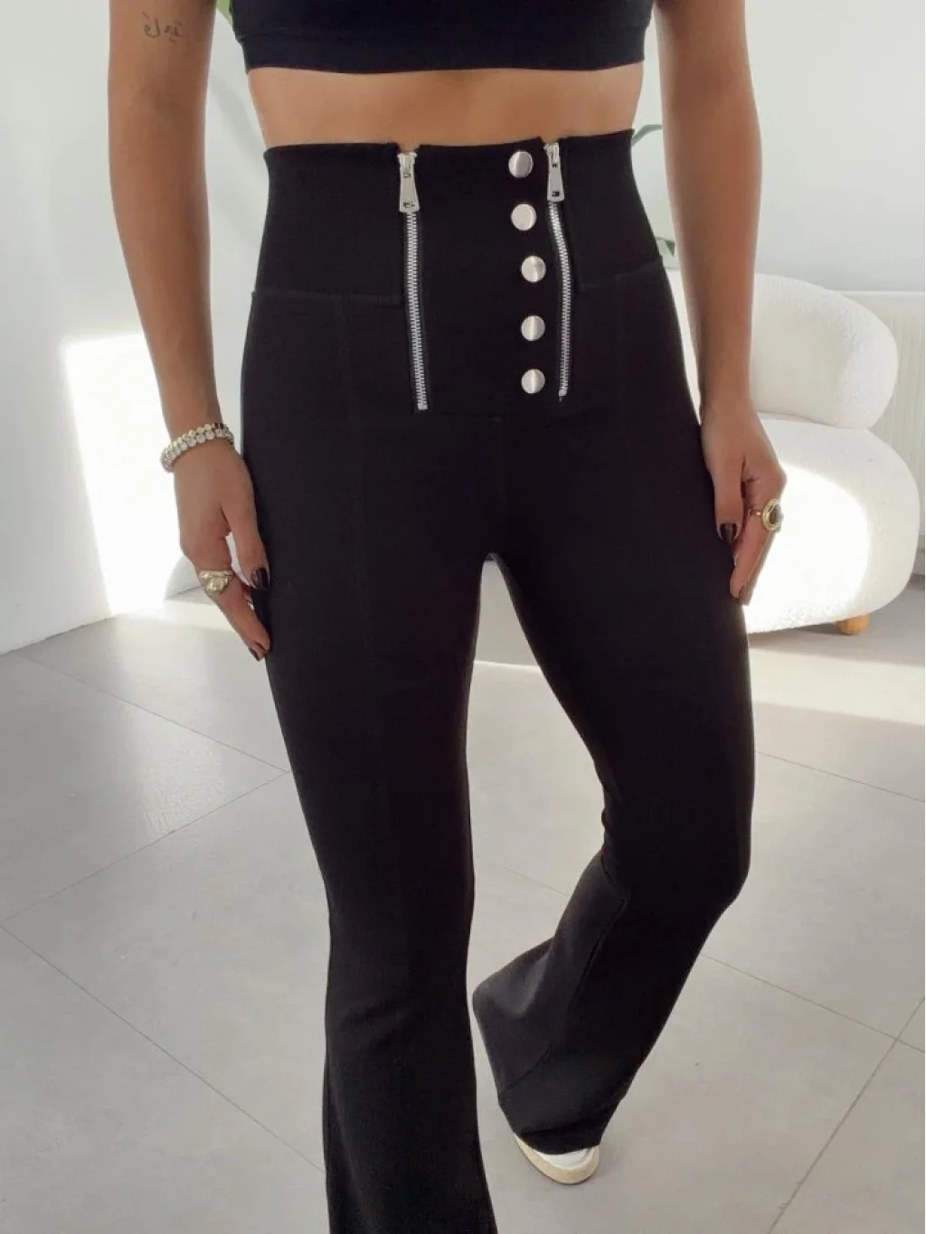 Kadın Yüksel Bel Düğme Ve Fermuar Detay çelik Kumaş Ispanyol Paça Tayt