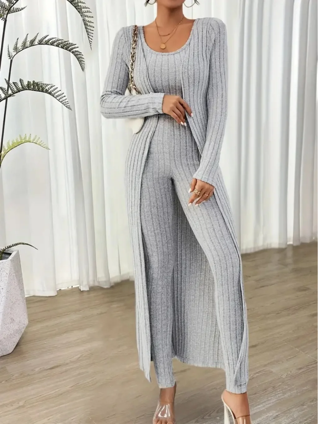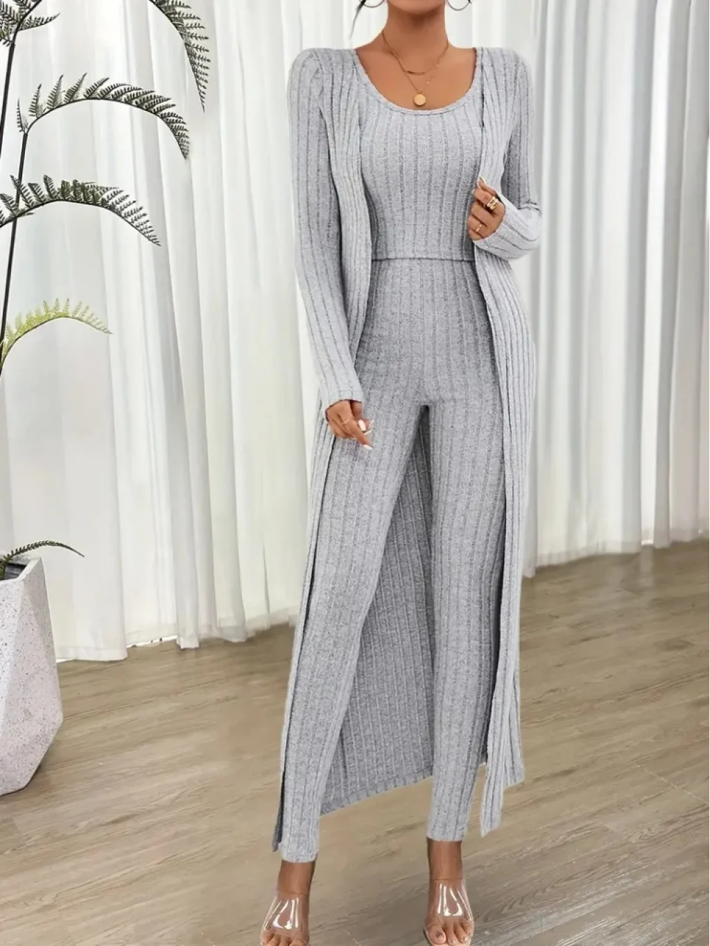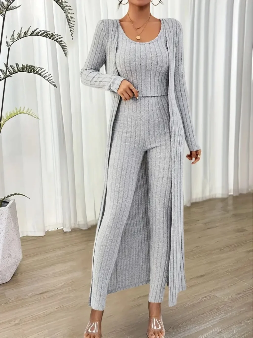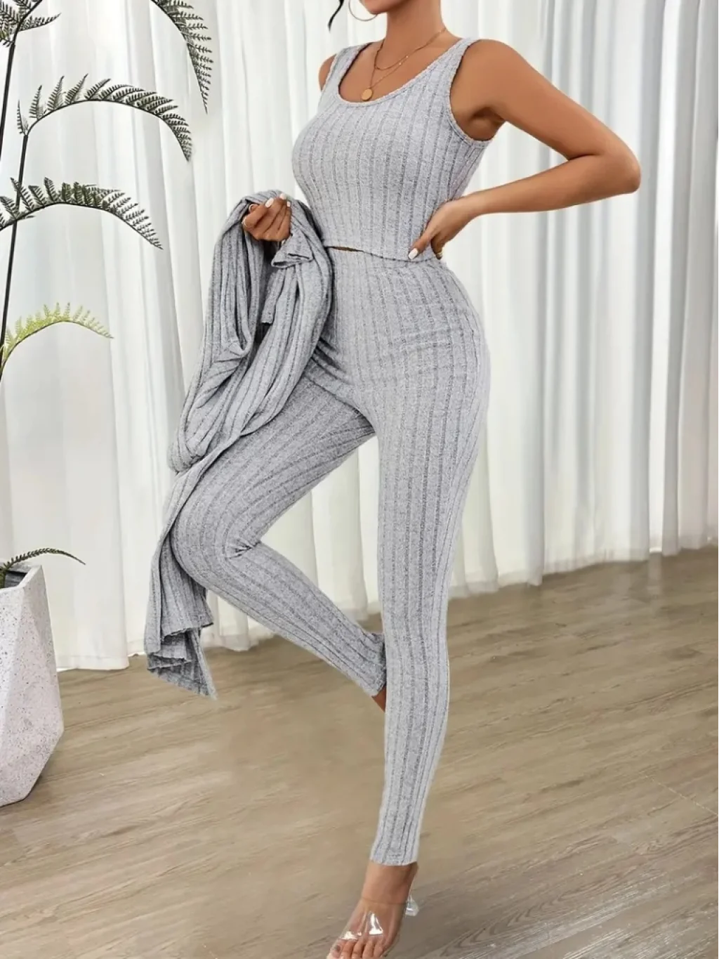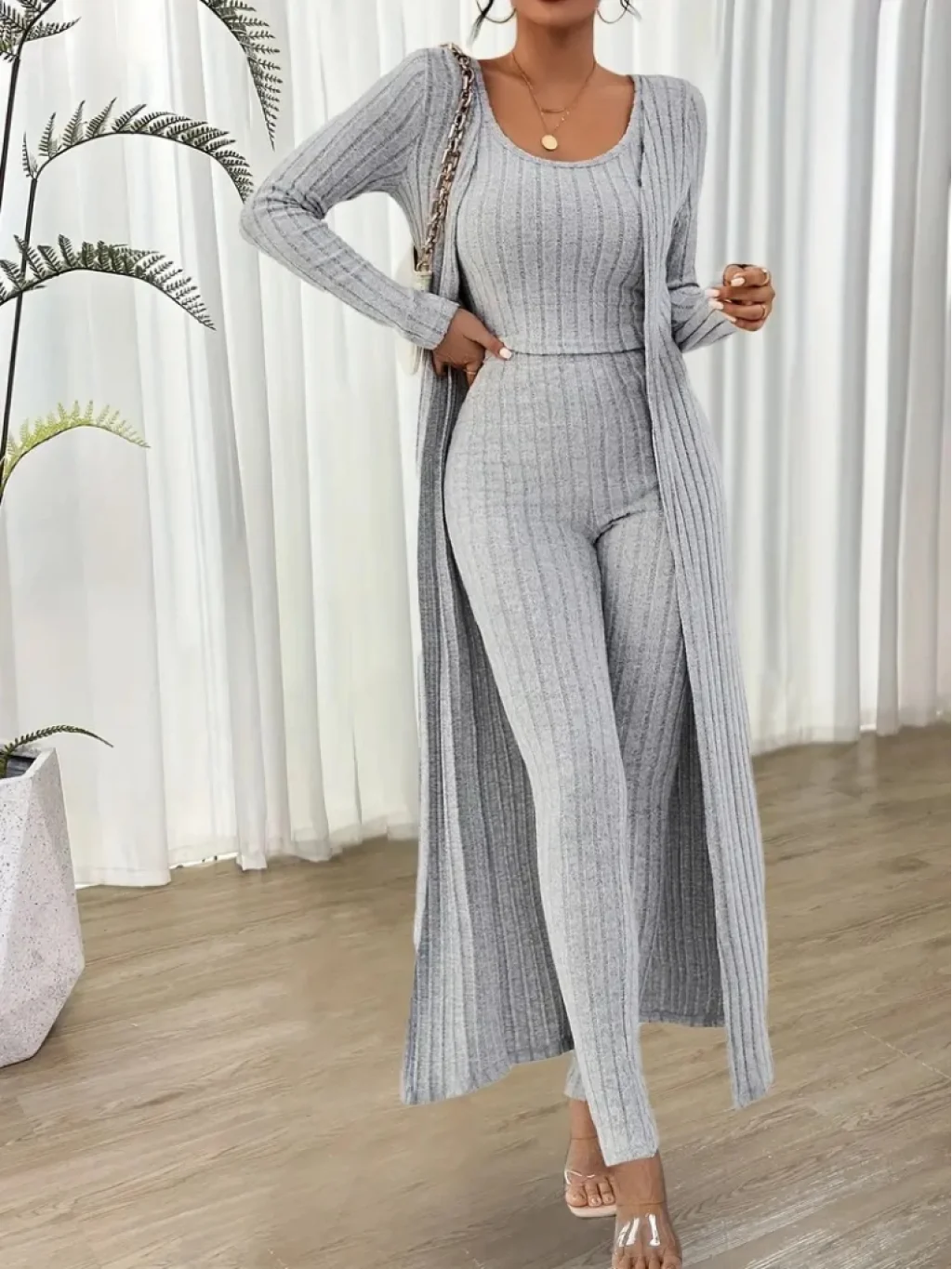 Kadın Yuvarlak Yaka Askılı Krop Bluz Yüksek Bel Tayt Ve Uzun Hırka şardonlu Kaşkorse üçlü Takım