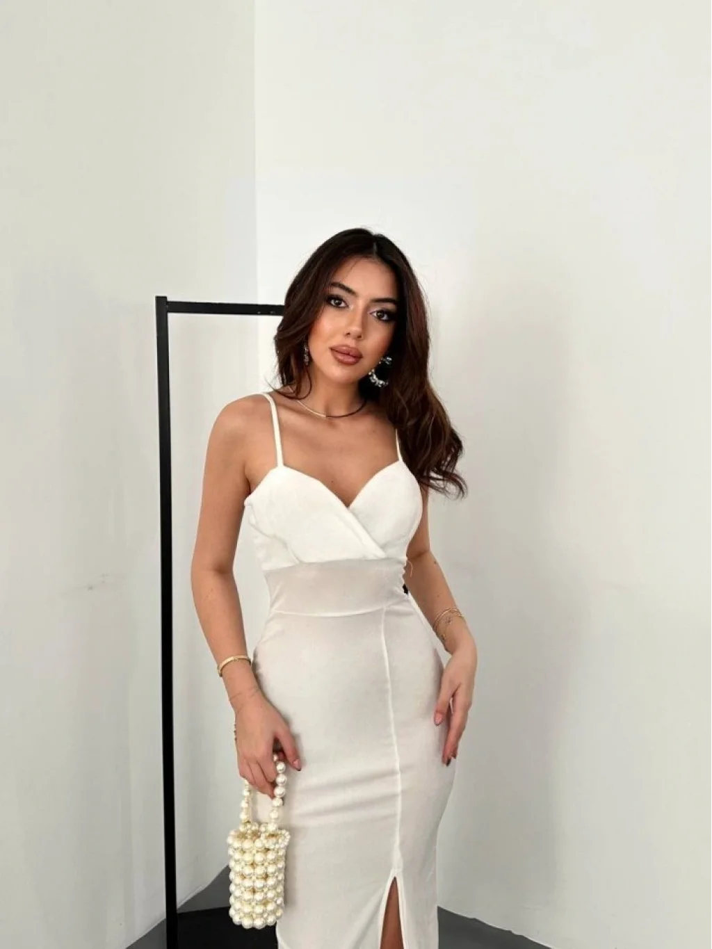 Kadınomuz Askılı Sırt Dekolteli Yırtmaç Detay Midi Boy Elbise Yırtmaç Detay Midi Boy Elbise