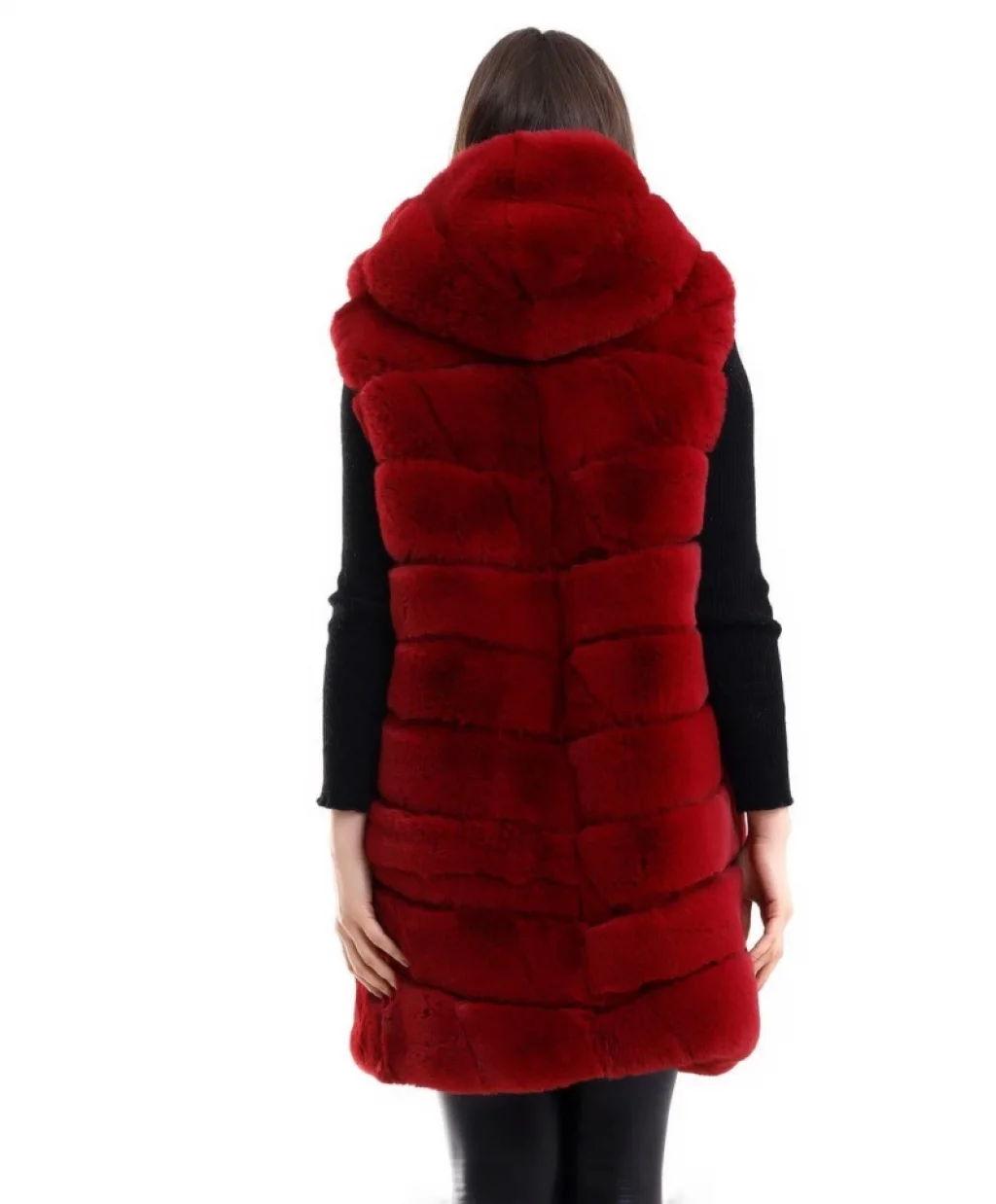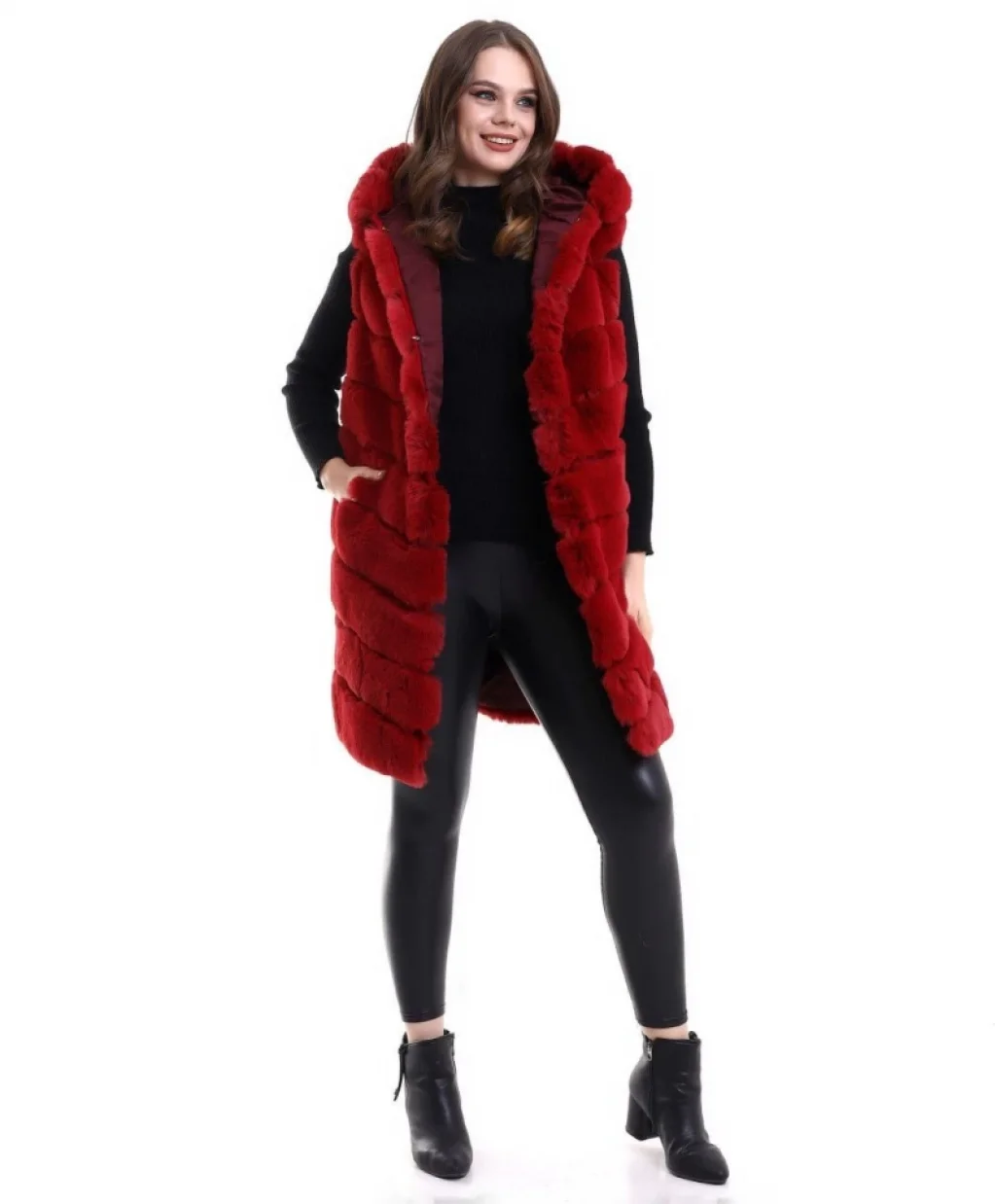 Kapşonlu Peluş Kürk Yelek Premium Kalite, Tam Astarlı, Uzun Model - Kırmızı