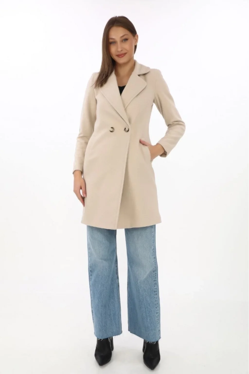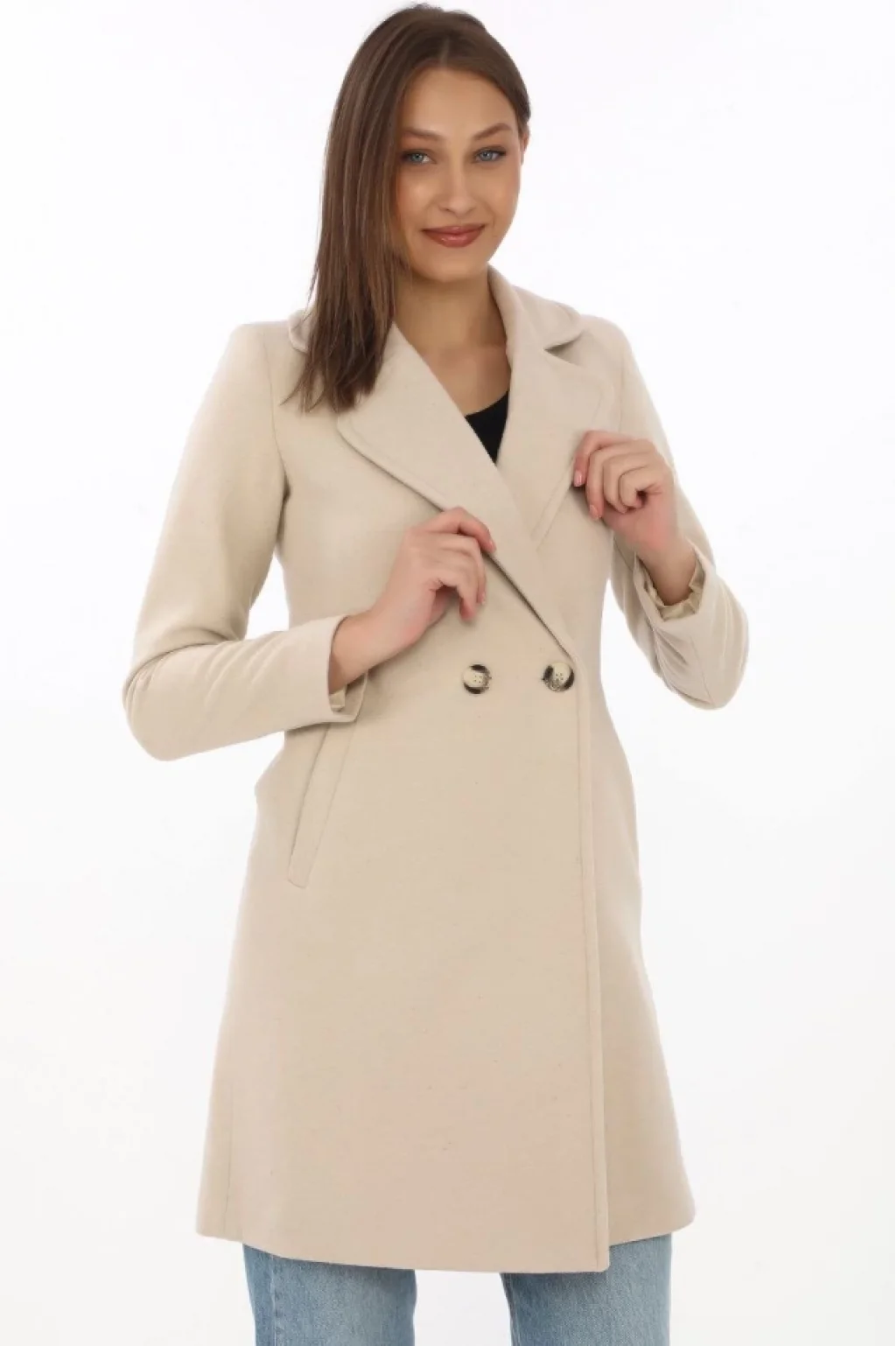 Kaşe Kaban – Siyah Yünlü Dokuma, Kruvaze Yaka, Astarlı, Cepli, Kuşaklı Uzun Boy Tesettür Uyumlu Kışlık Şık Kaban - Bej
