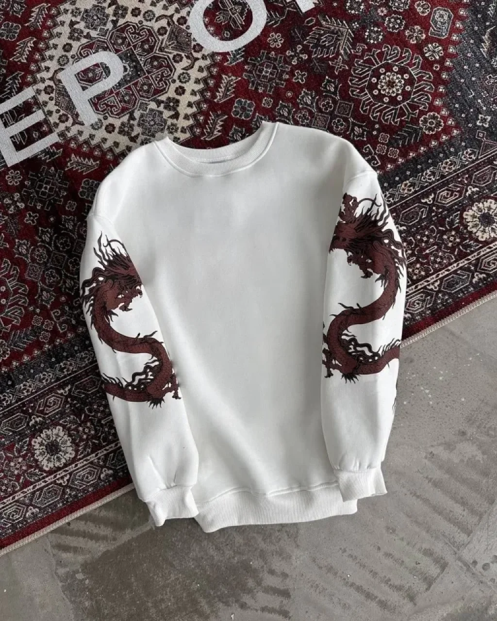 Kışlık Bisiklet Yaka Baskılı SweatShirt - Beyaz