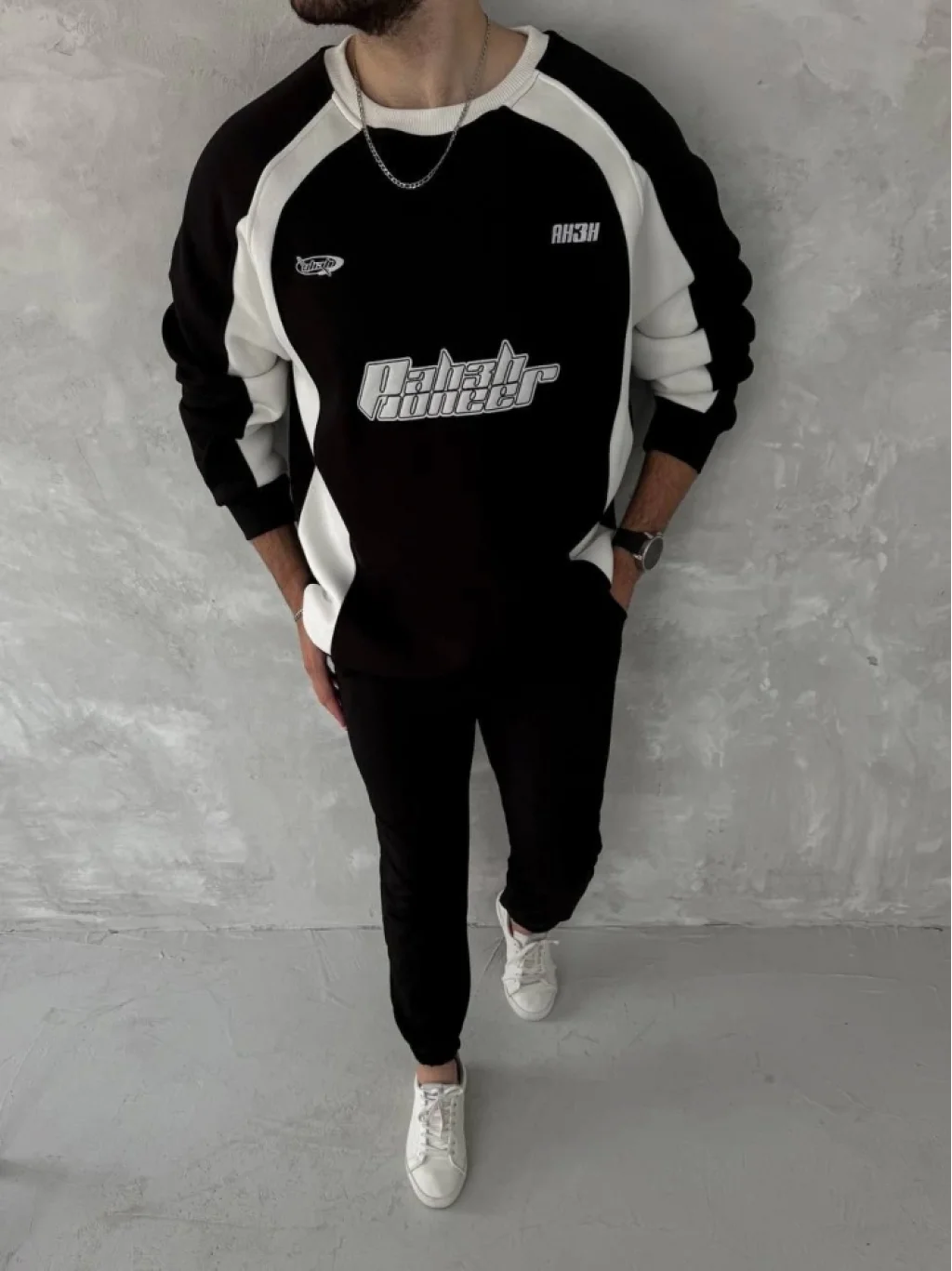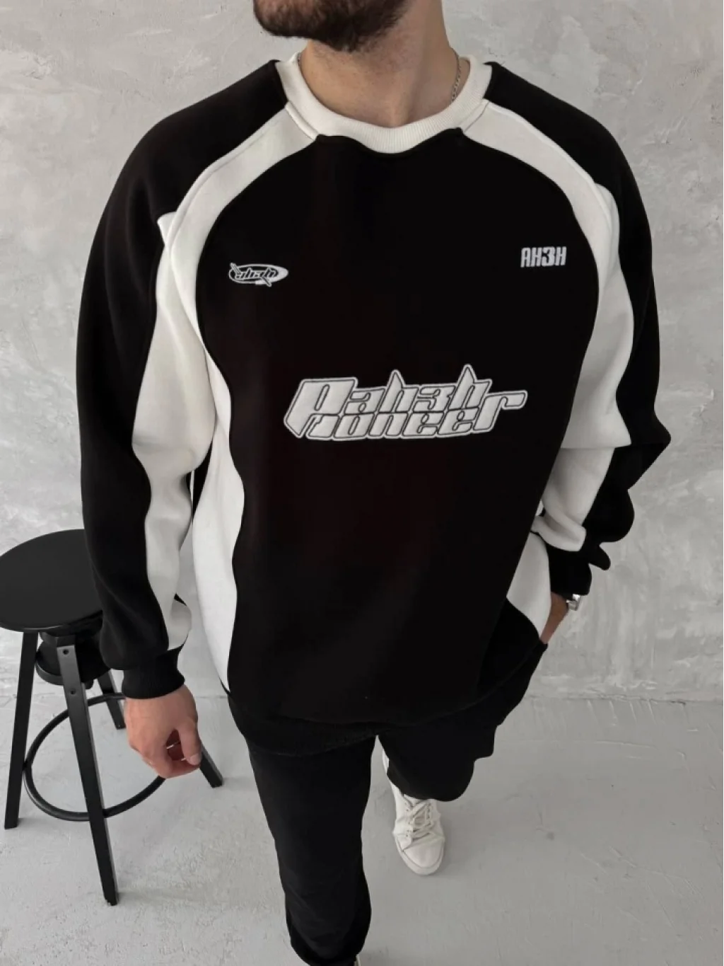 Kışlık Nakış İşlemeli Bisiklet Yaka Parçalı SweatShirt - Siyah