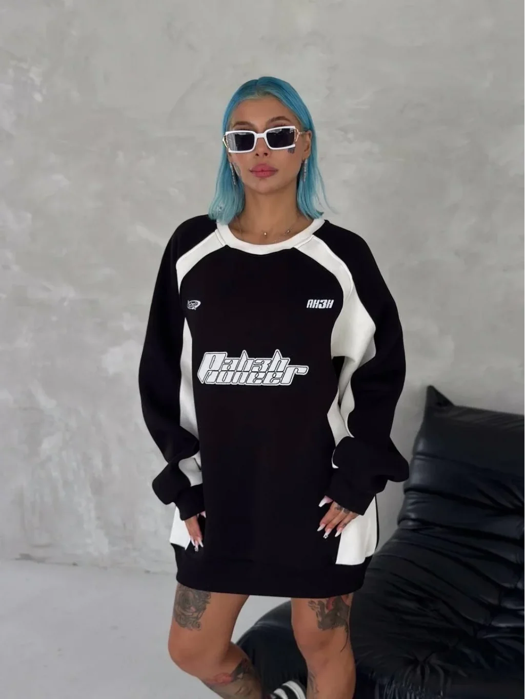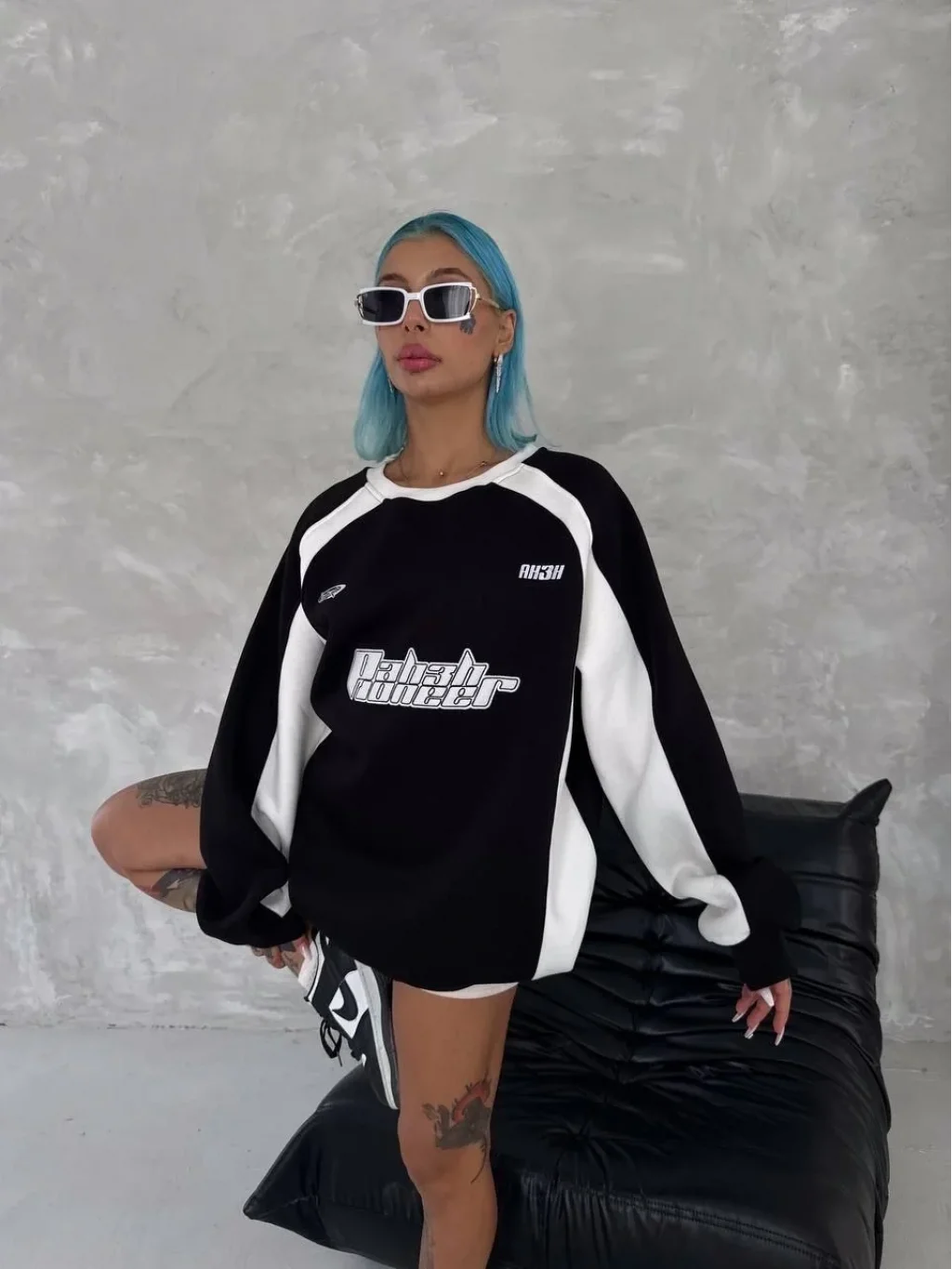 Kışlık Nakış İşlemeli Bisiklet Yaka Parçalı SweatShirt - Siyah