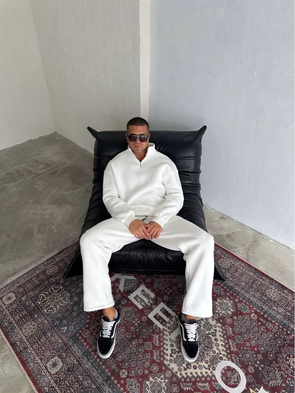 Kışlık Yarım Fermuarlı Üç İplik Eşofman Takım - Beyaz