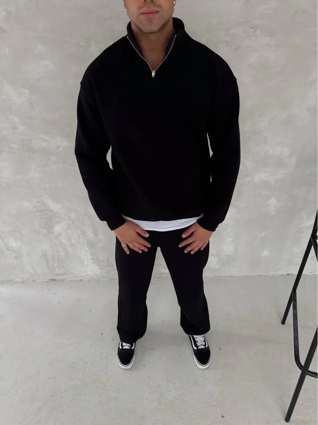 Kışlık Yarım Fermuarlı Üç İplik Eşofman Takım - Siyah