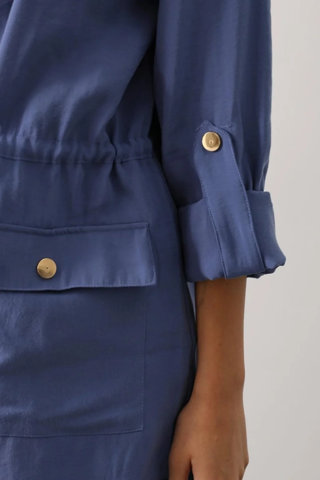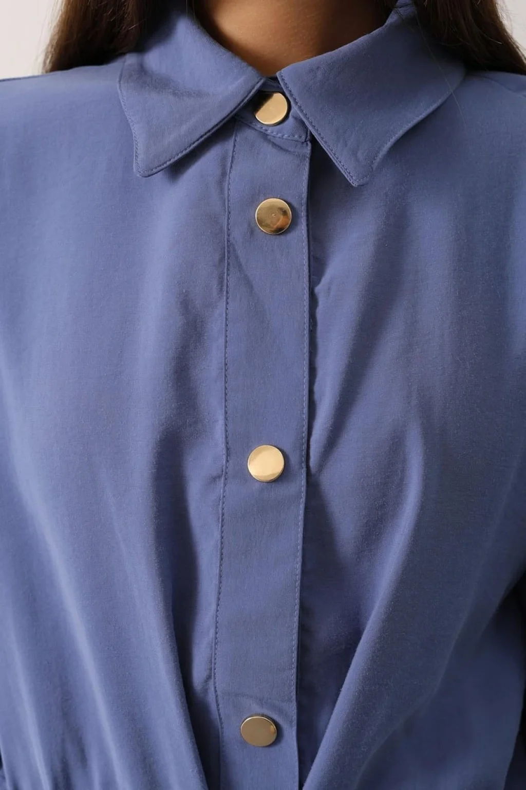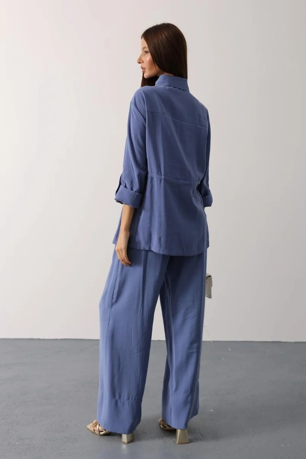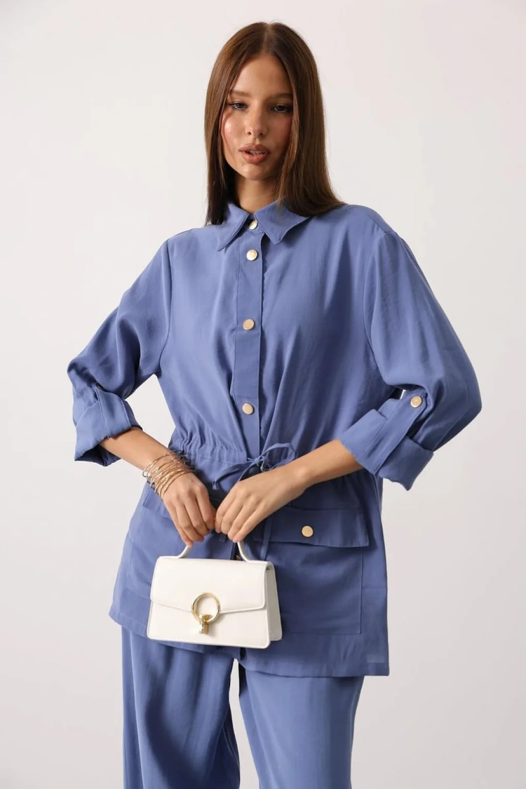 Marvella Gold Takım - İndigo, sade kesimi ve zarif detaylarıyla günlük şıklığı yeniden tanımlar. %85 modal ve %15 polyester karışımı kumaşıyla nefes alan, hafif ve dökümlü bir yapı sunar. Gold düğme detaylarıyla tasarıma sofistike bir dokunuş ekler.