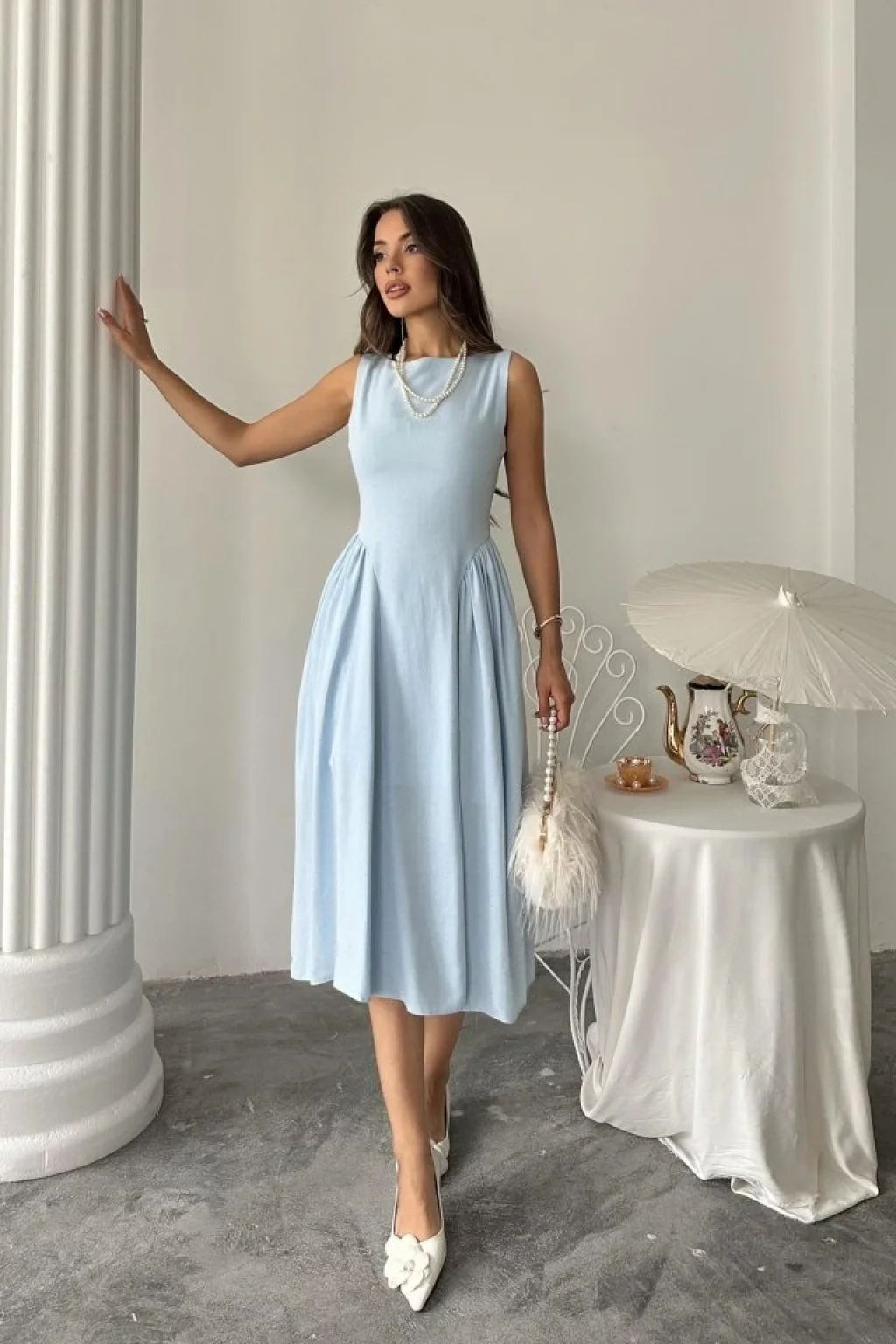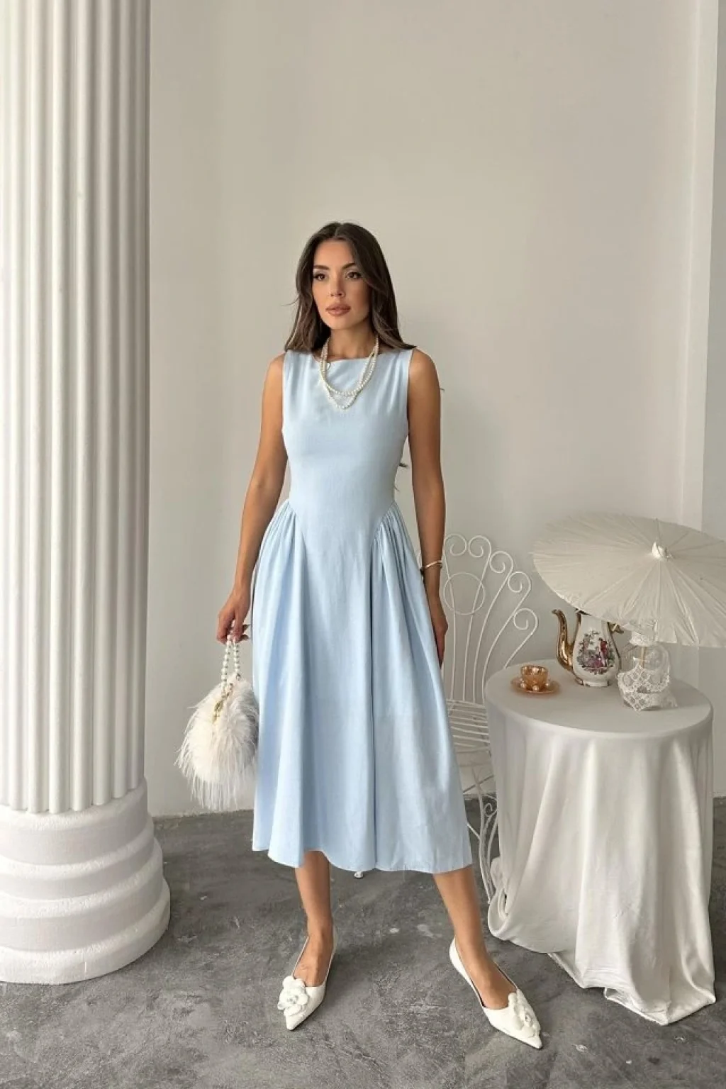 Mavi Yanları Büzgülü Midi Boy Keten Elbise