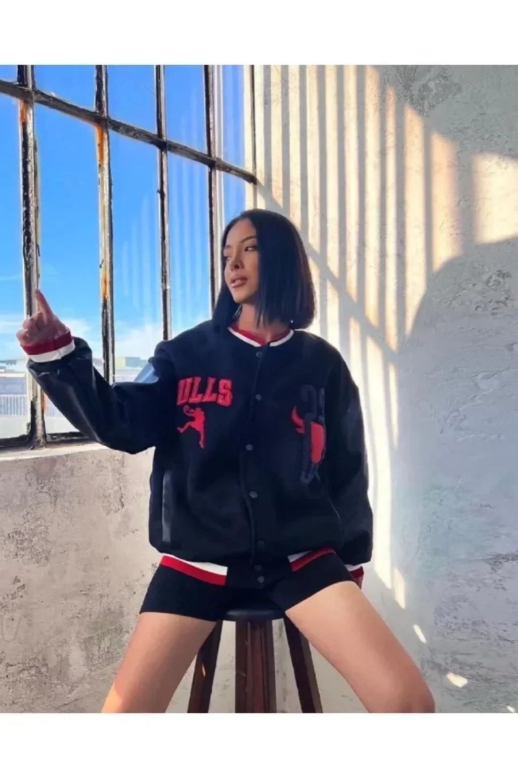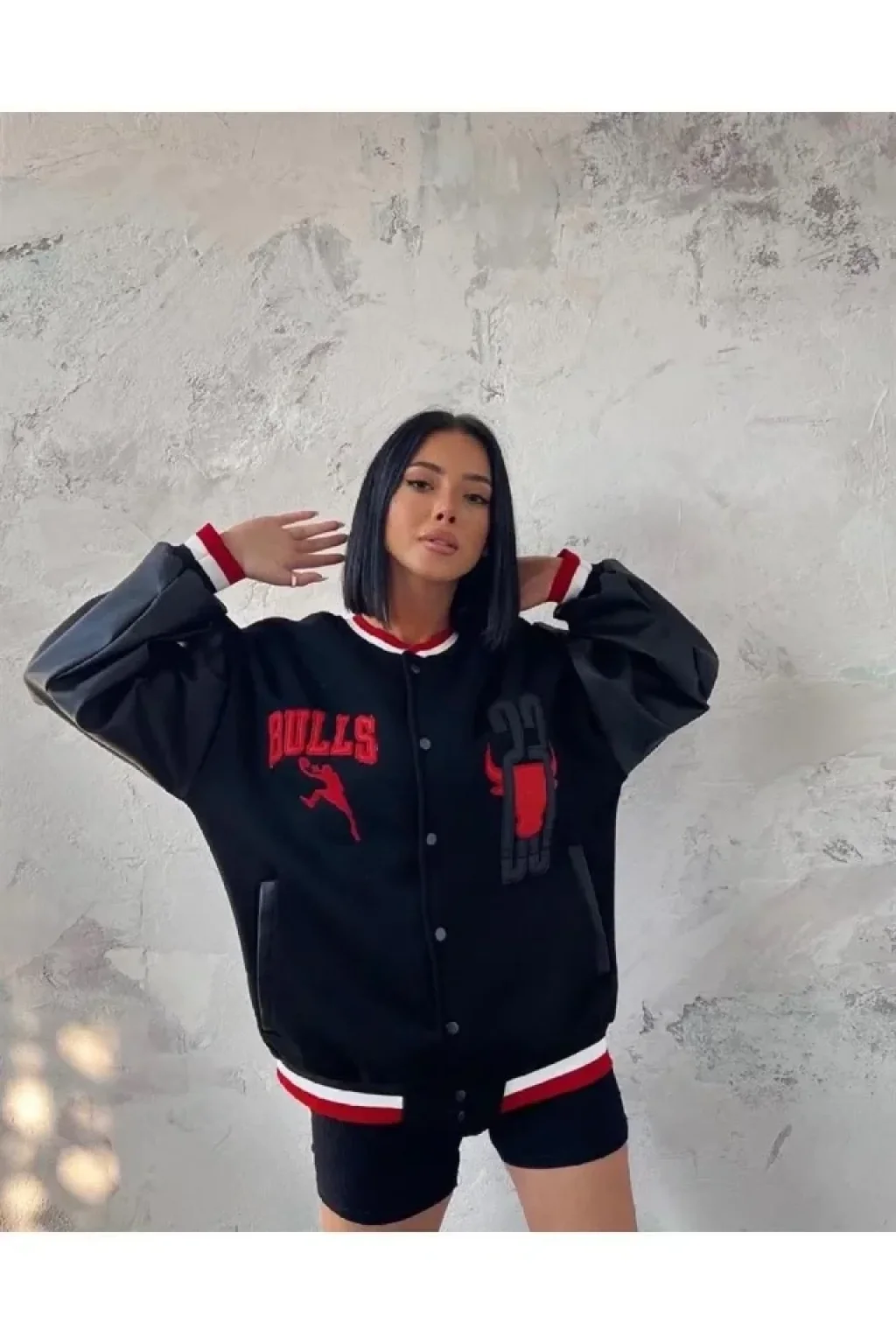 Nakışlı Kolları Deri Oversize Kolej Ceket - Siyah