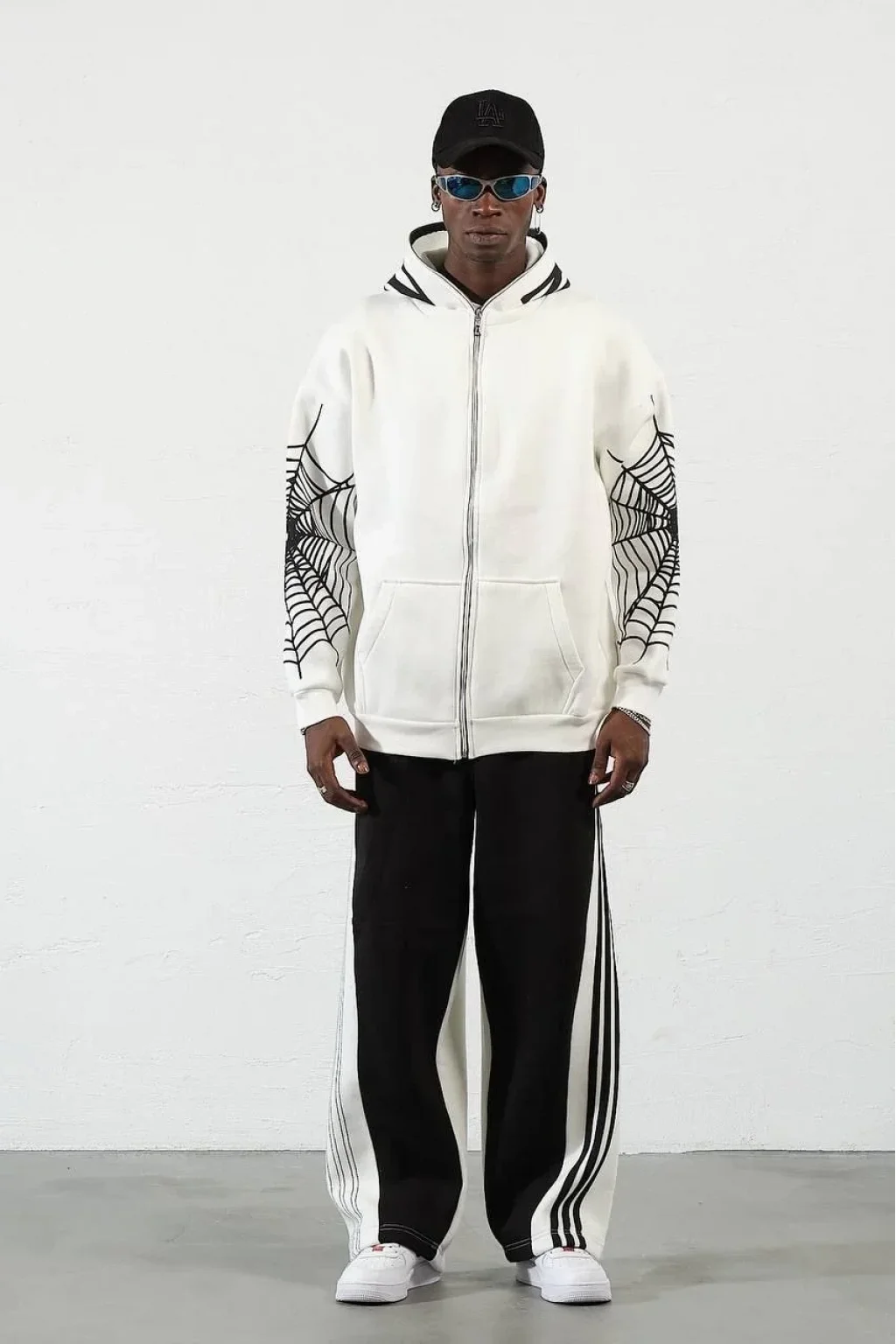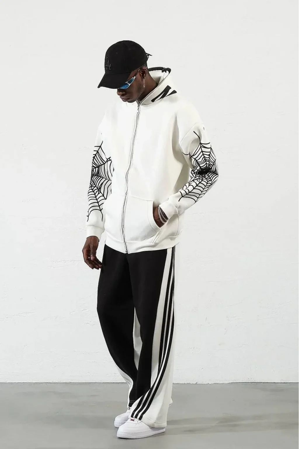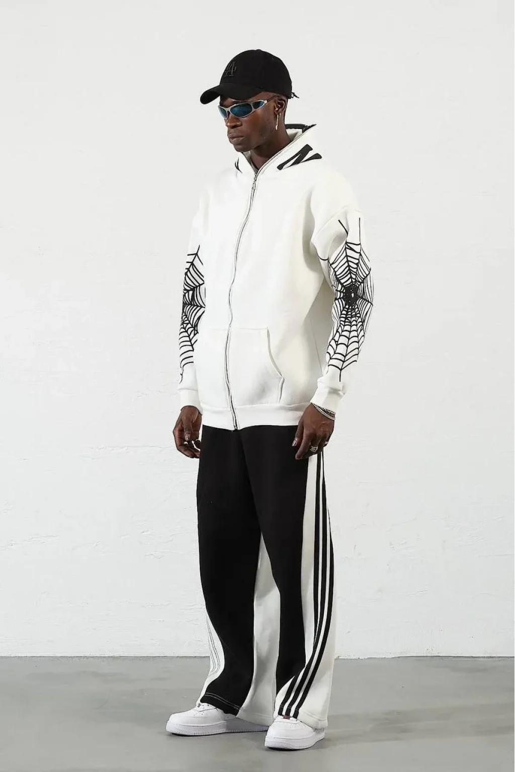 Örümcek Baskılı Zıp Fermuarlı Kapüşonlu Hırka - Beyaz