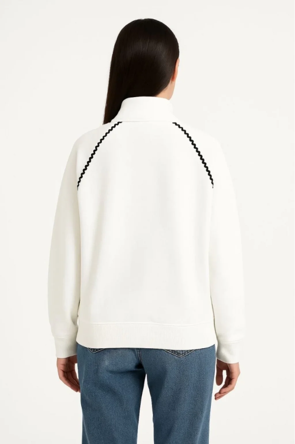 Oversize Dik Yaka Fermuarlı Sweatshirt - Zincir Nakışli Kanguru Cepli, - Beyaz