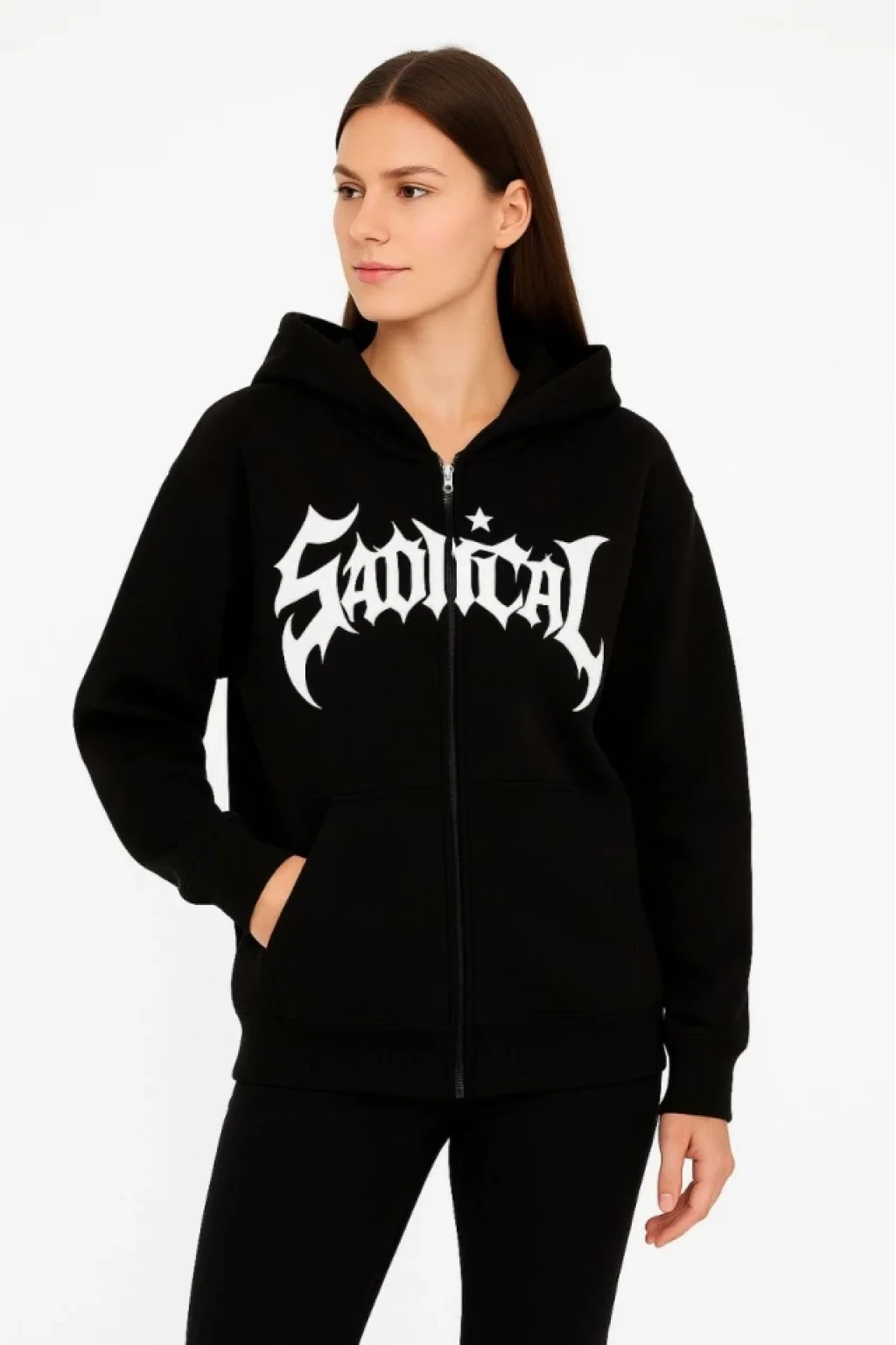 Oversize Kapüşonlu Sweatshirt Hoodie 3 İplik Şardonlu Pamuklu Kumaş, Önü Baskılı, Fermuarlı Rahat Kalıp, Kışlık Ve Sokak Stili Sweat - Siyah