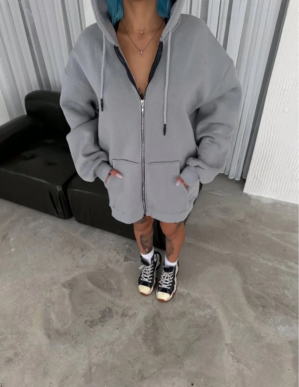 Oversize Tam Fermuarlı Uzun Kol Hırka - Gri
