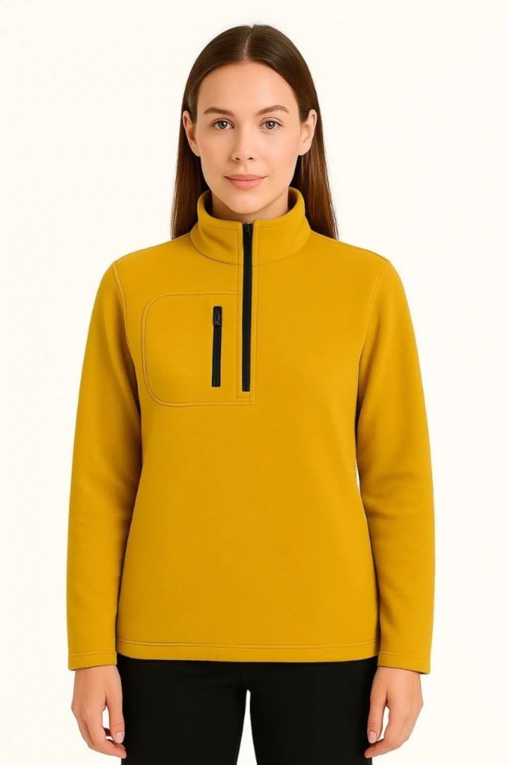 Polar Kazak – Dik Yaka, Yarım Fermuarlı, Fermuarlı Göğüs Cepli, Siyah Biyeli, Kışlık Rahat Regular Fit Günlük Model - Sarı
