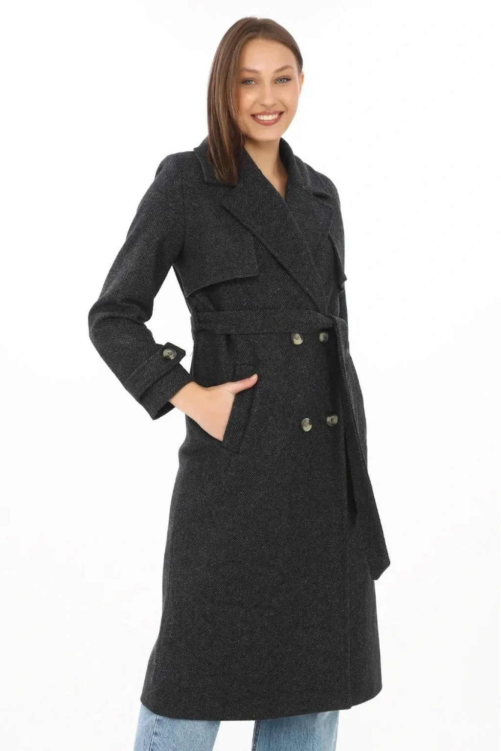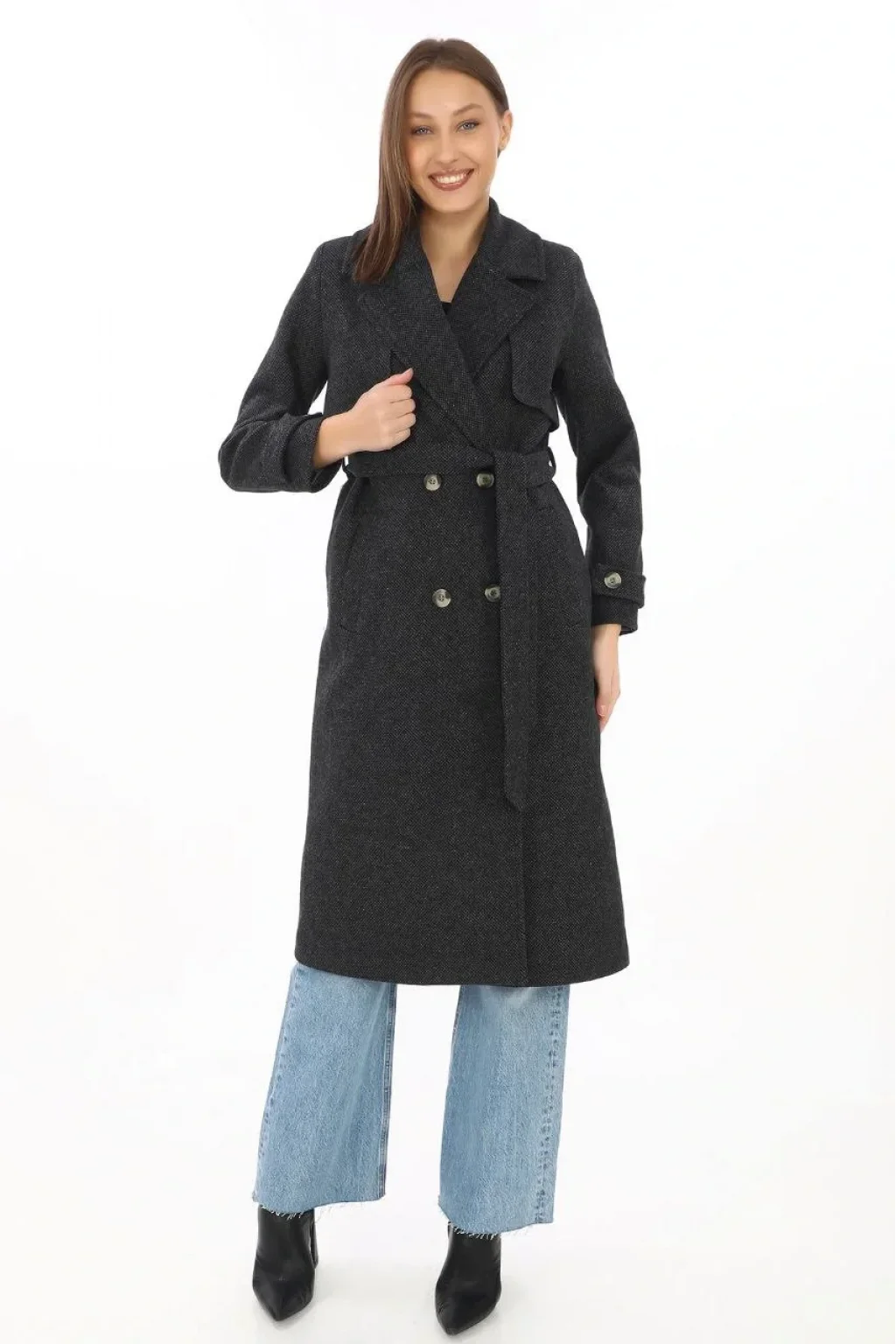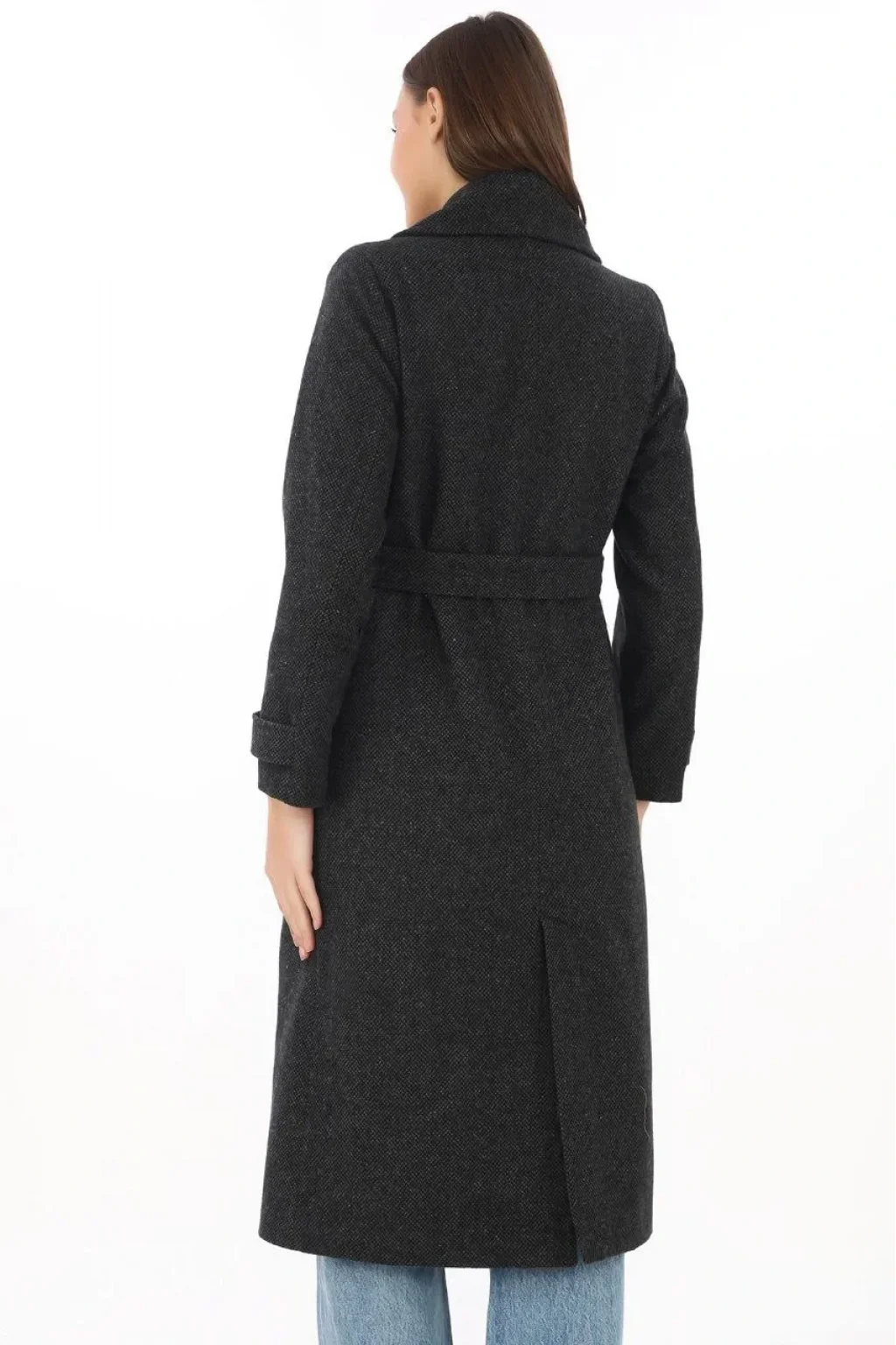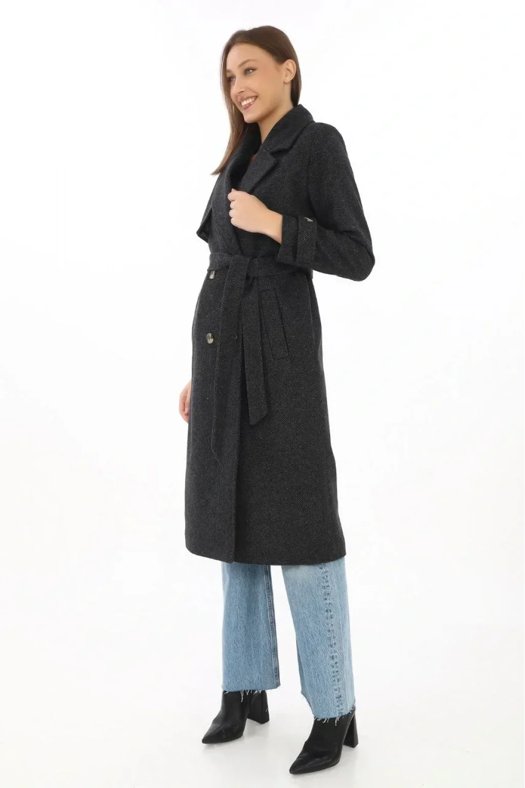 Premium Kadın Kaşe Kaban Uzun Boy, Balık Sırtı Yünlü Kaşmir Dokuma, Kruvaze Kuşaklı Astarlı - Siyah