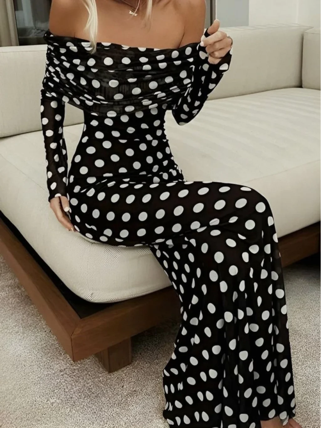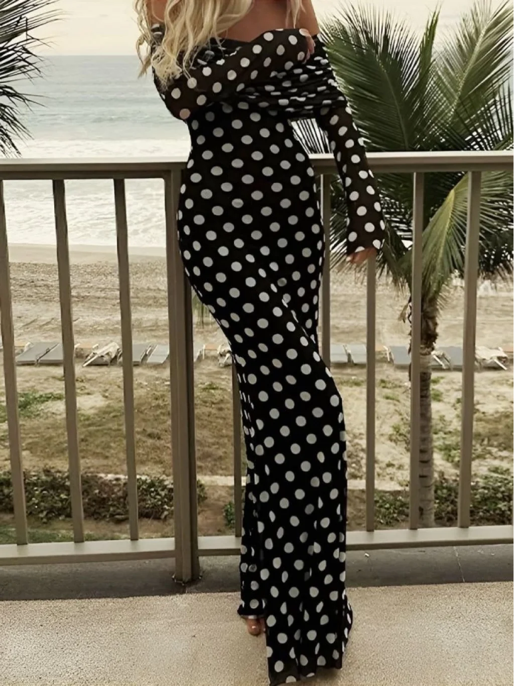 Puantiyeli Tül İçi Astarlı Madonna Yaka Maxi Boy Elbise