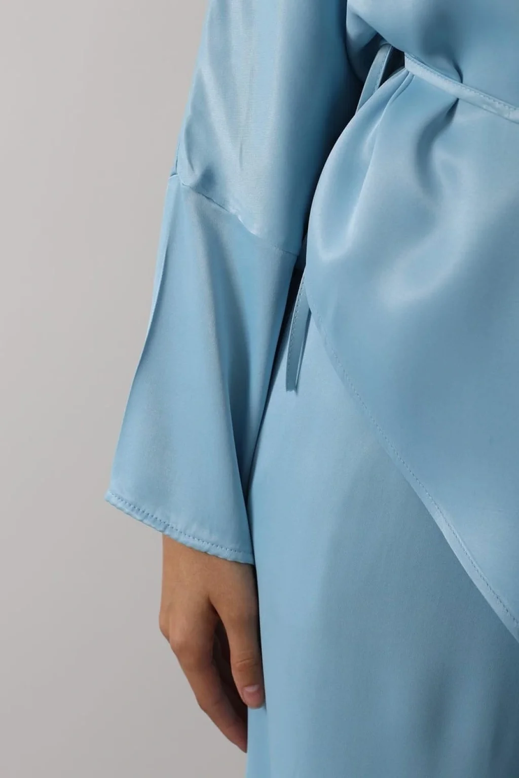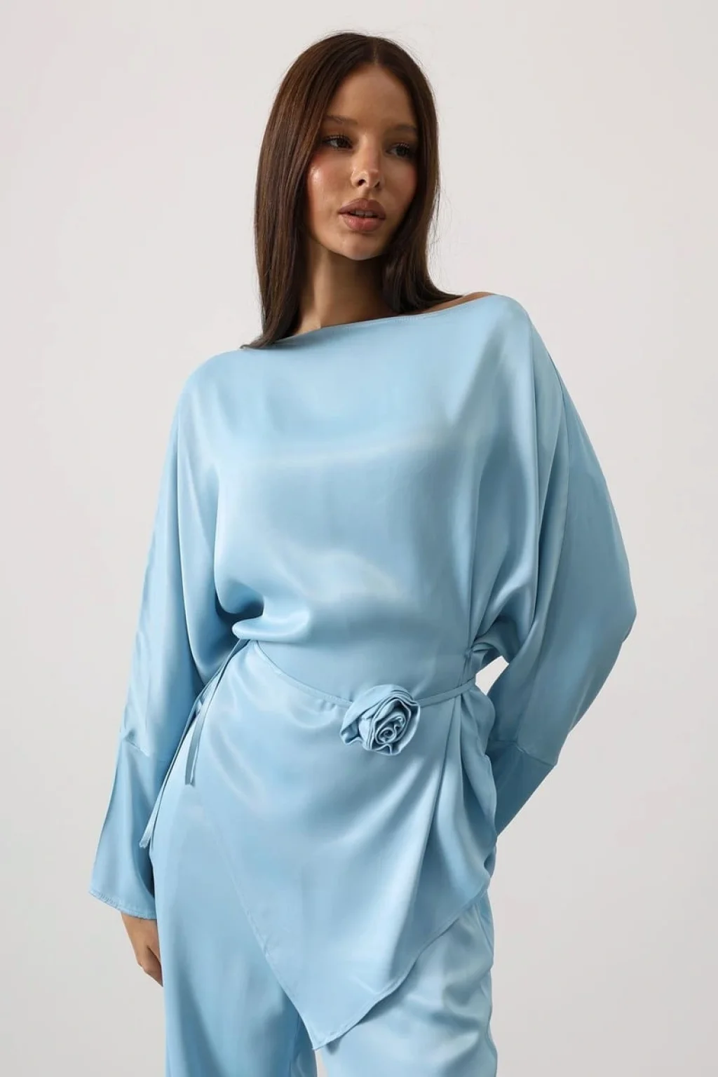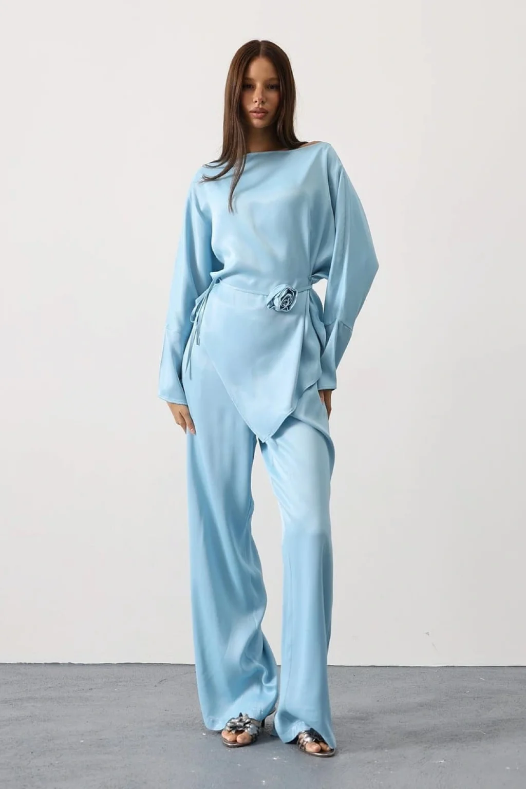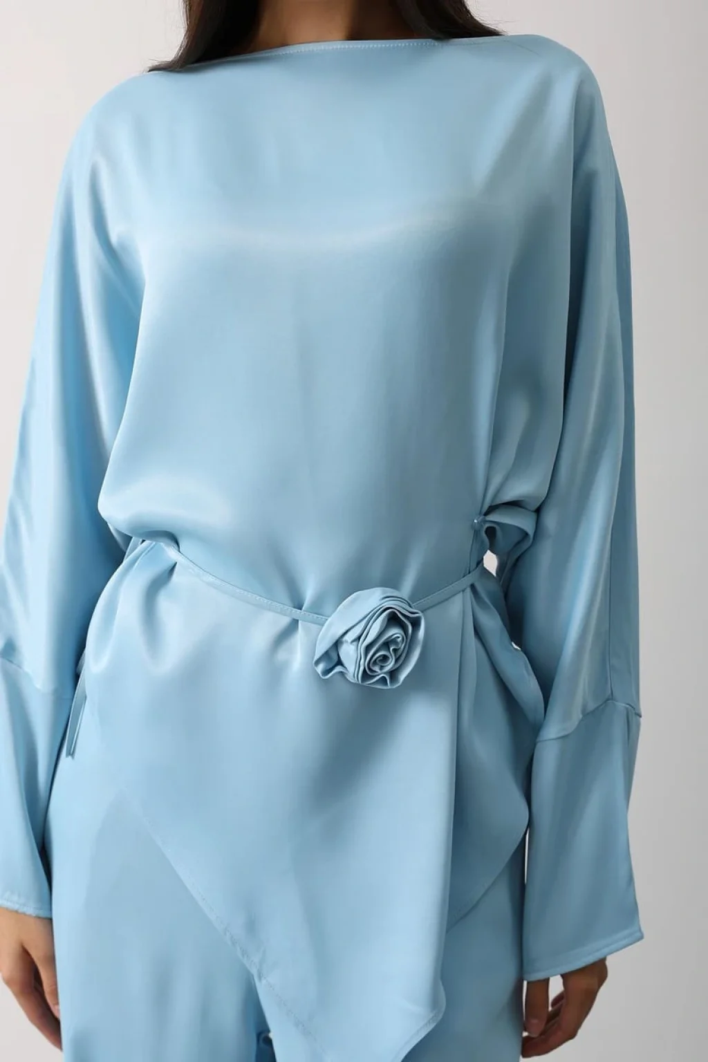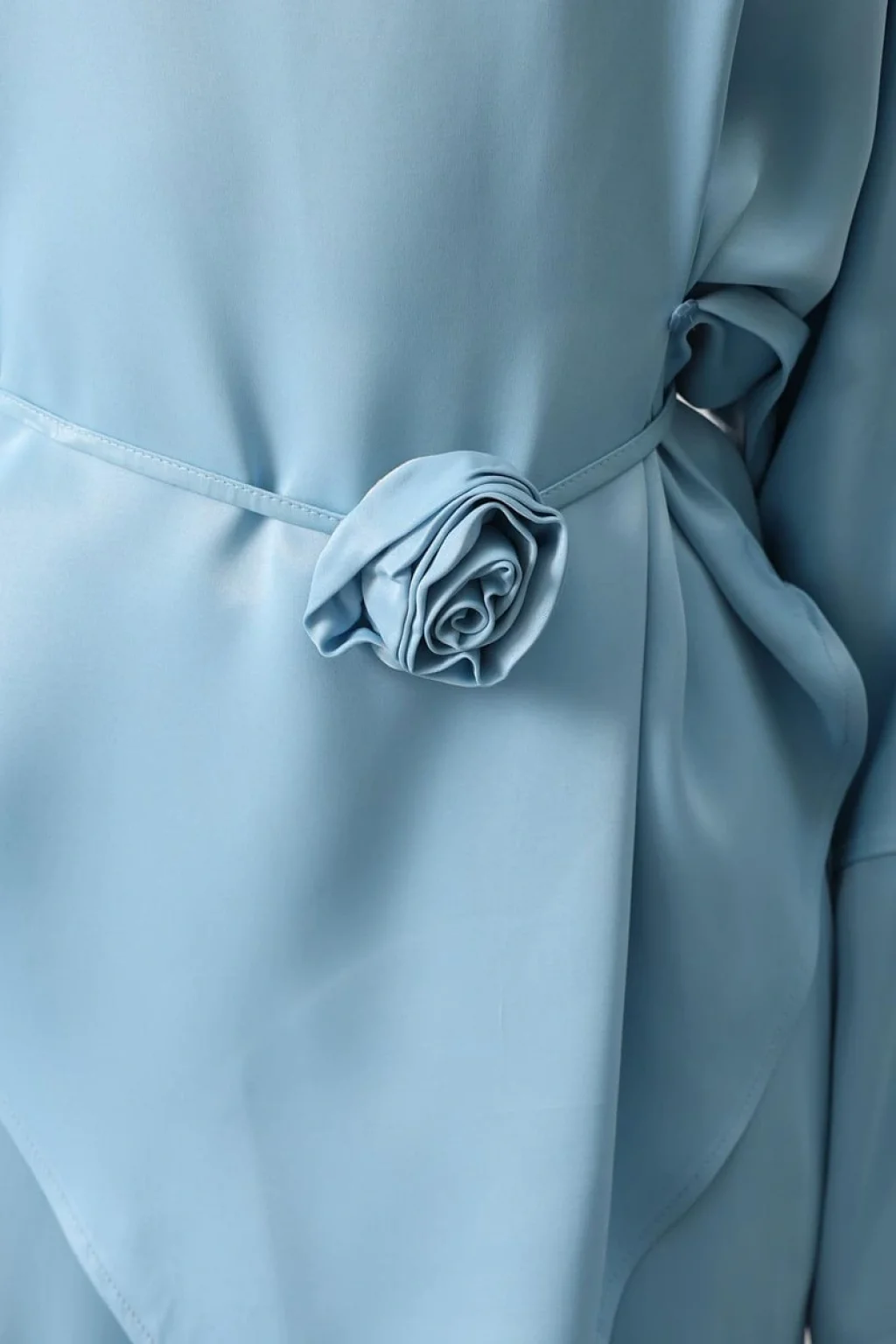 Rosalyn Saten Takım - Mavi, gül detaylı kemeri ve asimetrik kesimiyle klasik saten takımlara modern bir yorum kazandırıyor. %100 polyester kumaşıyla dökümlü ve pürüzsüz bir görünüm sunarken, zarif parlak dokusuyla ışığı yansıtan sofistike bir siluet oluşturur.