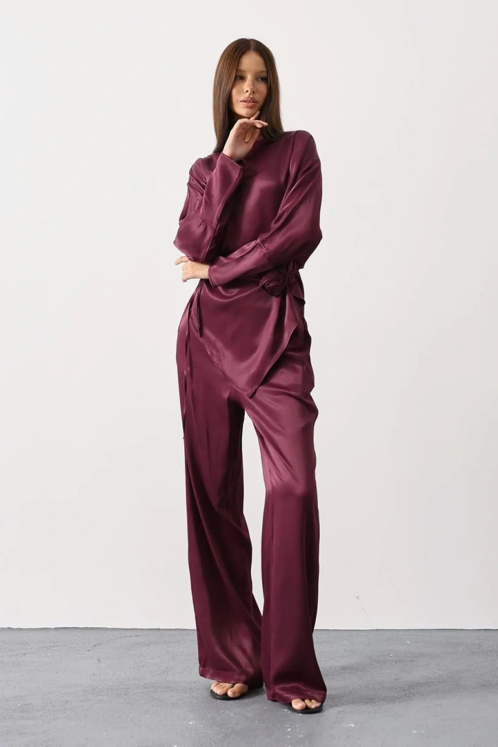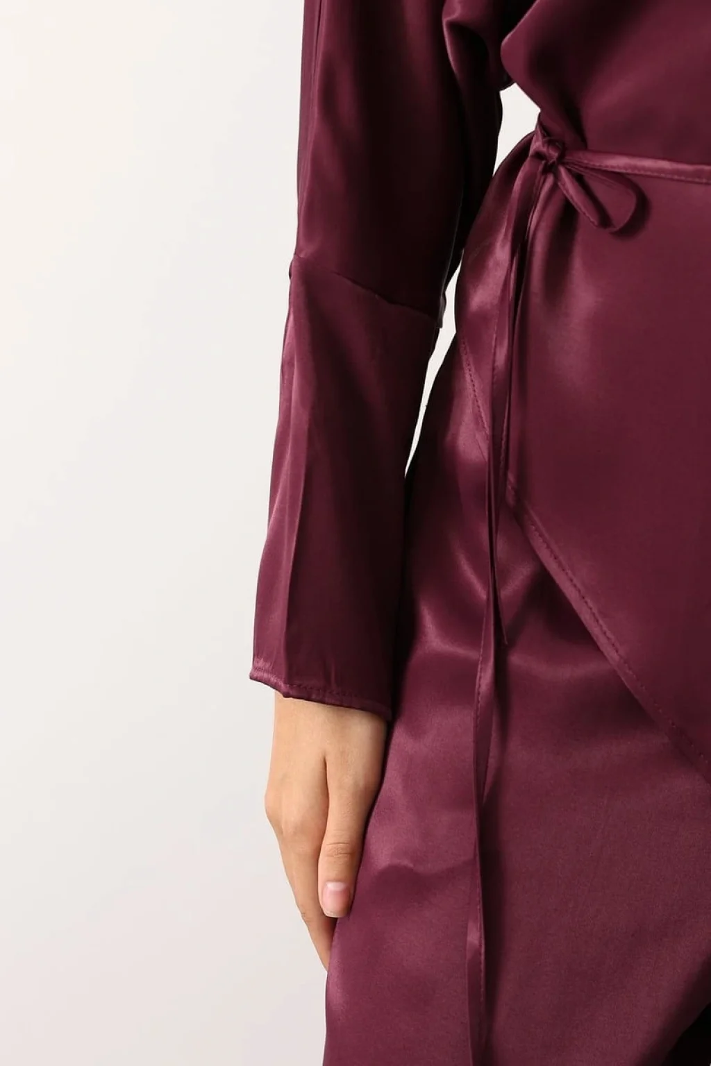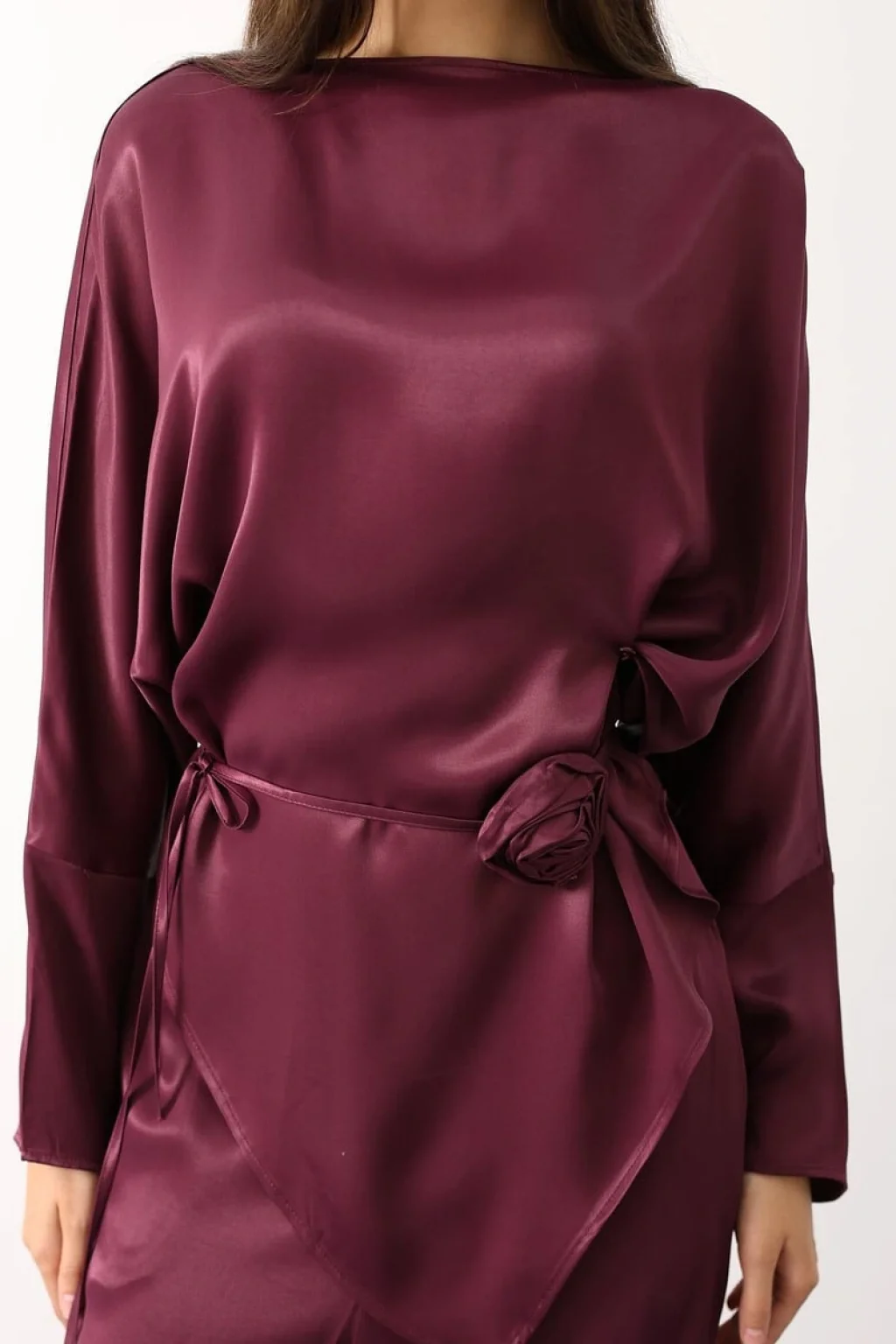 Rosalyn Saten Takım - Mürdüm, gül detaylı kemeri ve asimetrik kesimiyle klasik saten takımlara modern bir yorum kazandırıyor. %100 polyester kumaşıyla dökümlü ve pürüzsüz bir görünüm sunarken, zarif parlak dokusuyla ışığı yansıtan sofistike bir siluet oluşturur.