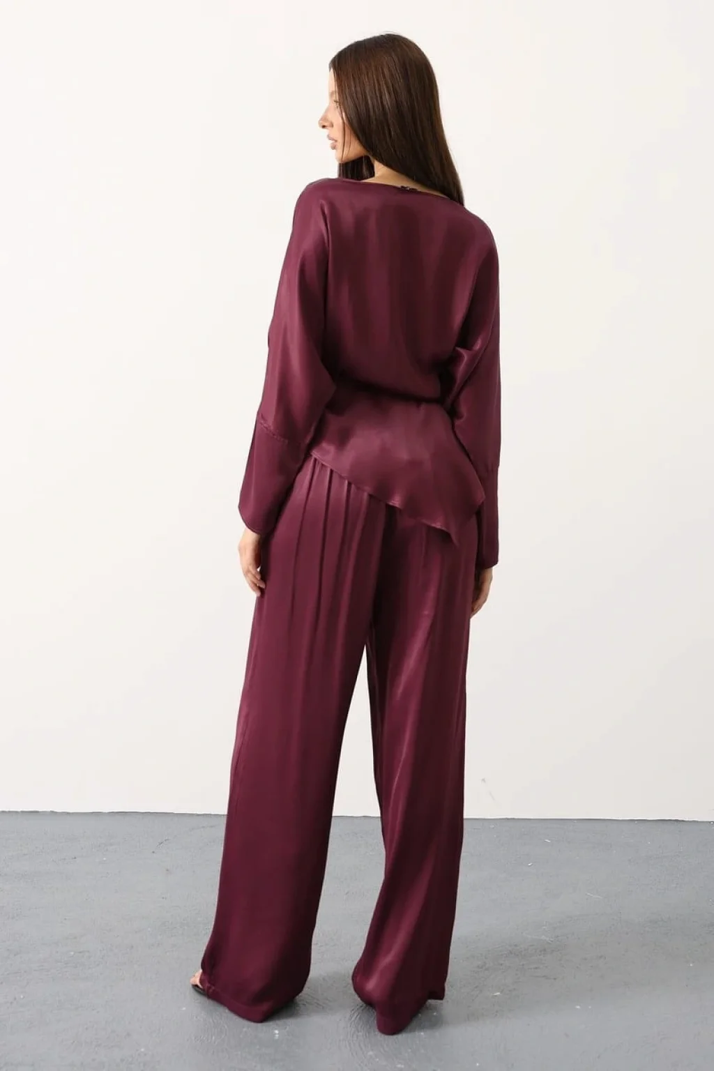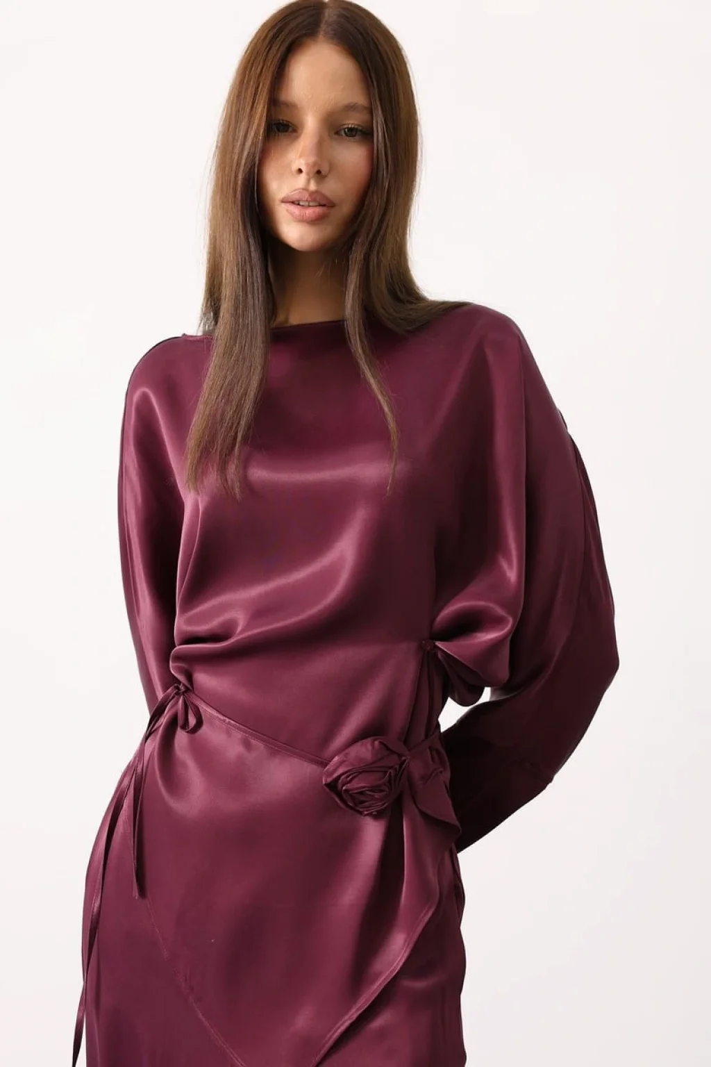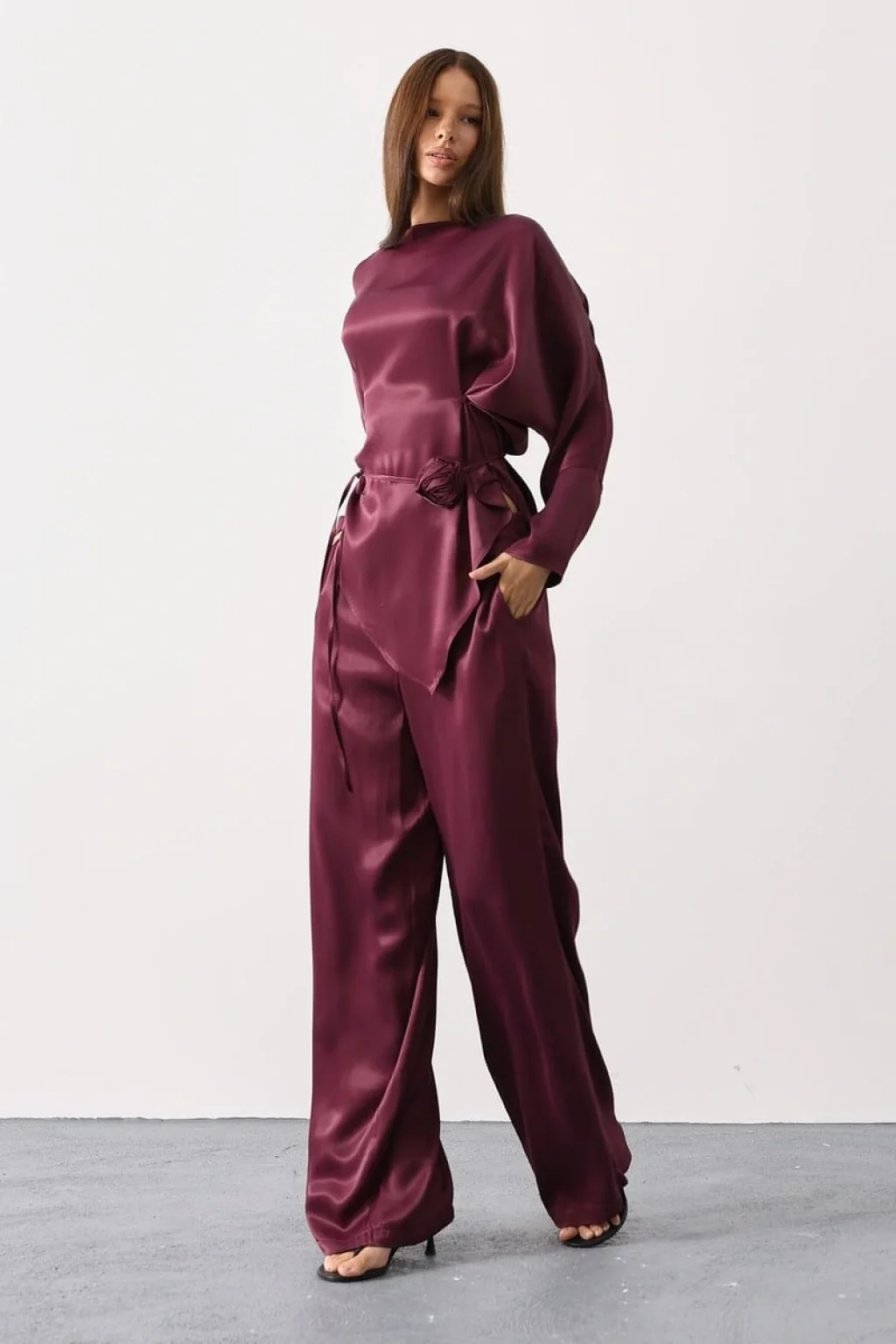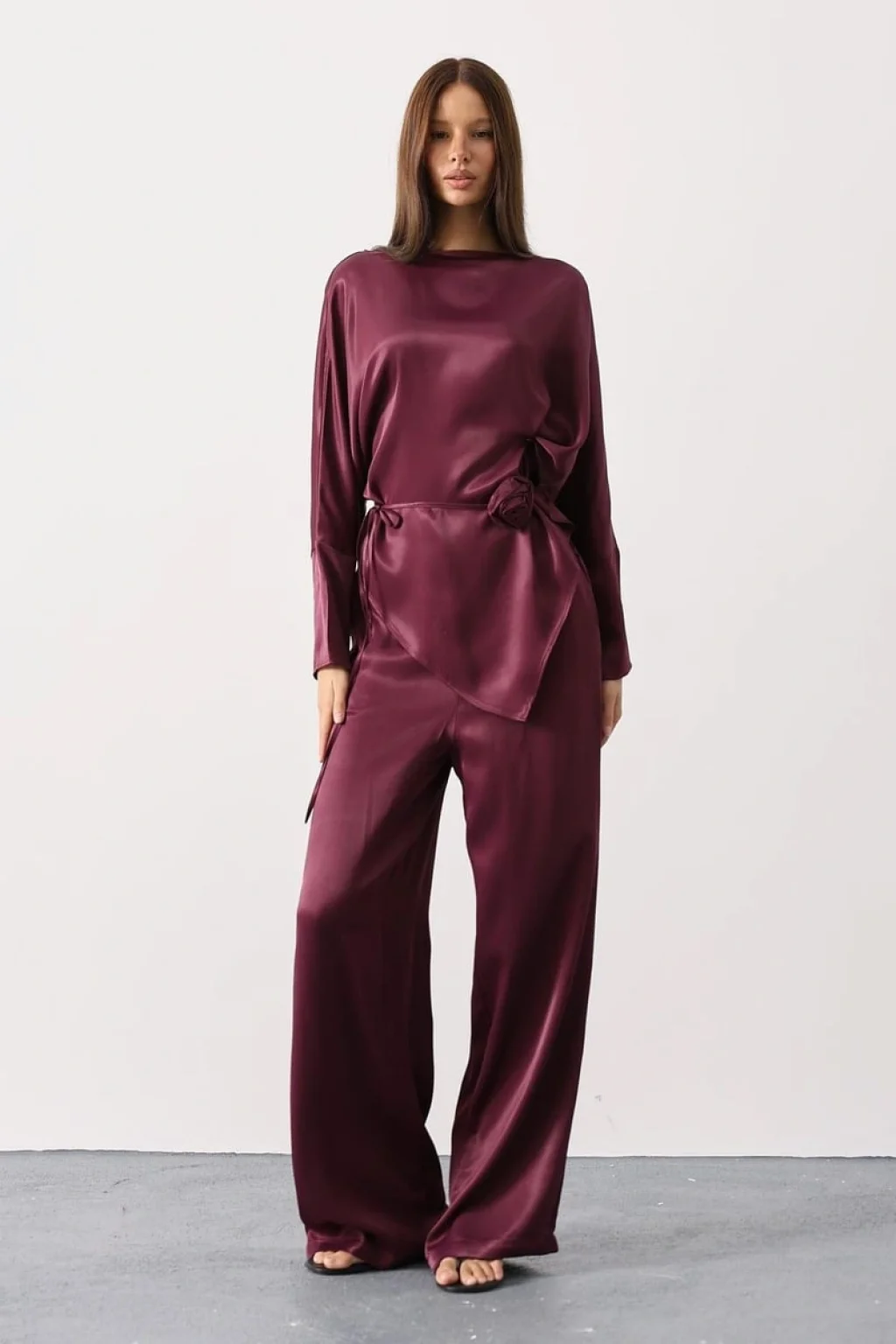 Rosalyn Saten Takım - Mürdüm, gül detaylı kemeri ve asimetrik kesimiyle klasik saten takımlara modern bir yorum kazandırıyor. %100 polyester kumaşıyla dökümlü ve pürüzsüz bir görünüm sunarken, zarif parlak dokusuyla ışığı yansıtan sofistike bir siluet oluşturur.