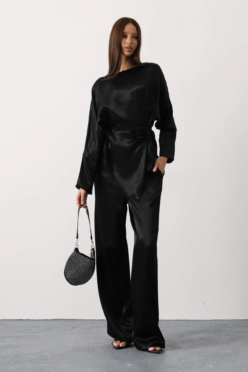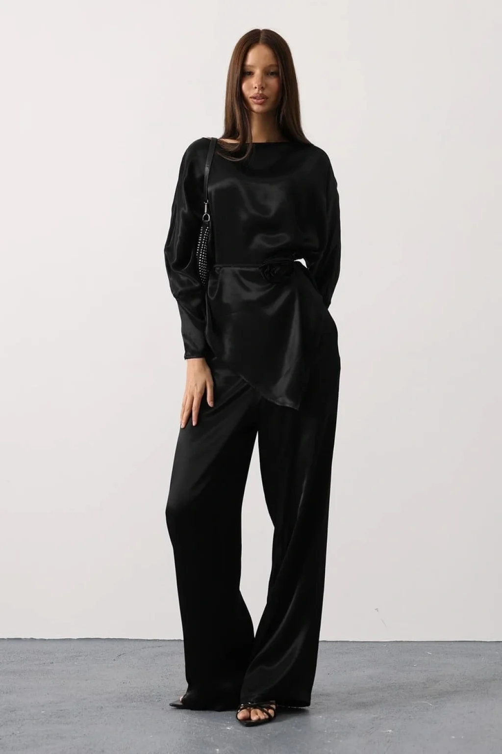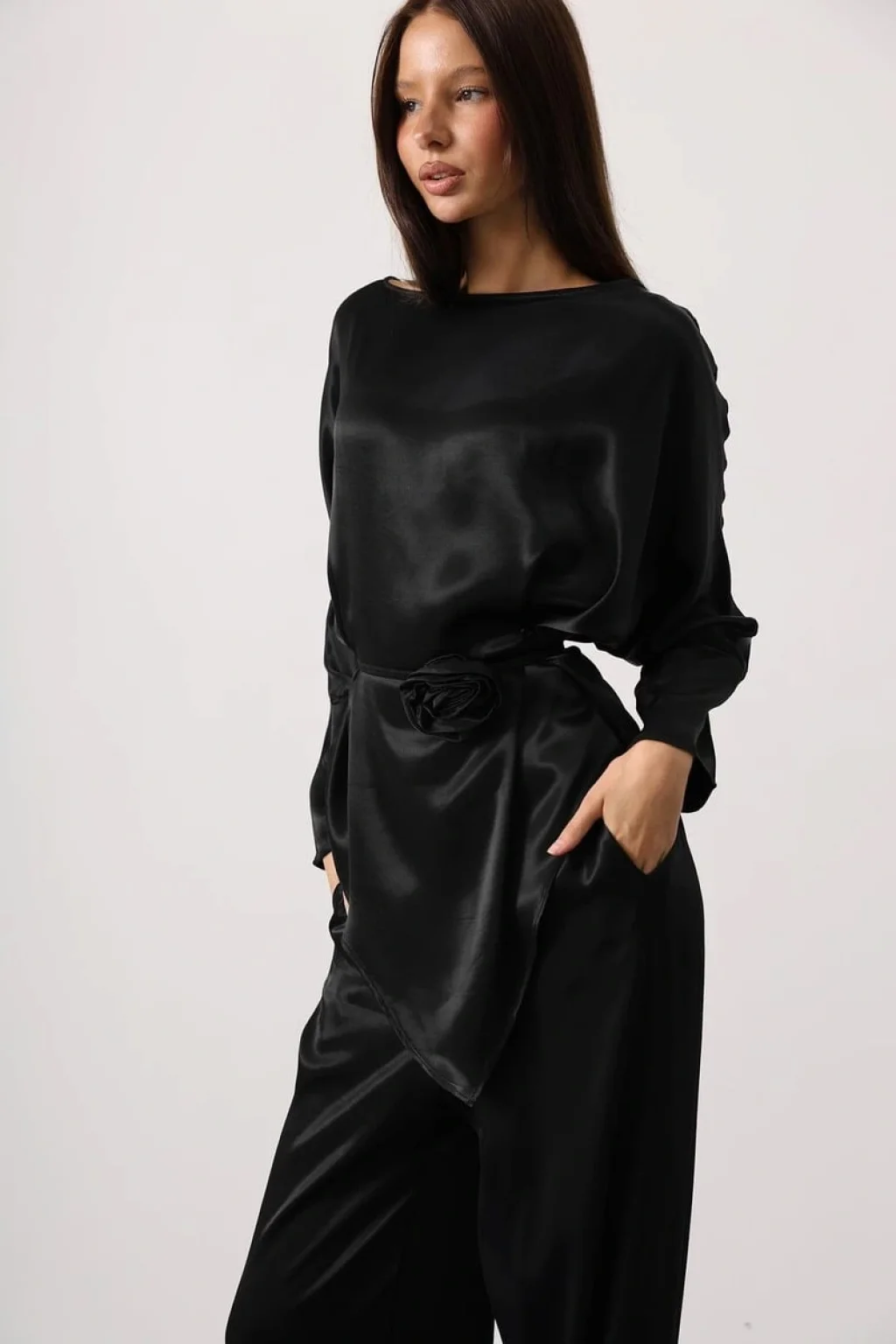 Rosalyn Saten Takım - Siyah, gül detaylı kemeri ve asimetrik kesimiyle klasik saten takımlara modern bir yorum kazandırıyor. %100 polyester kumaşıyla dökümlü ve pürüzsüz bir görünüm sunarken, zarif parlak dokusuyla ışığı yansıtan sofistike bir siluet oluşturur.
