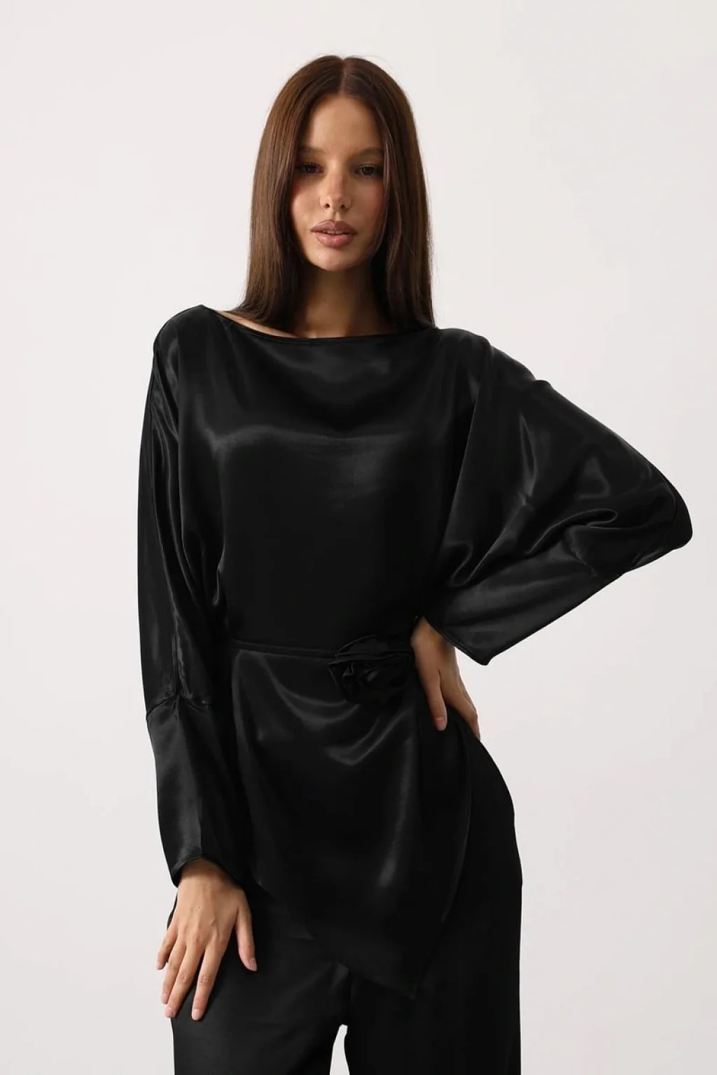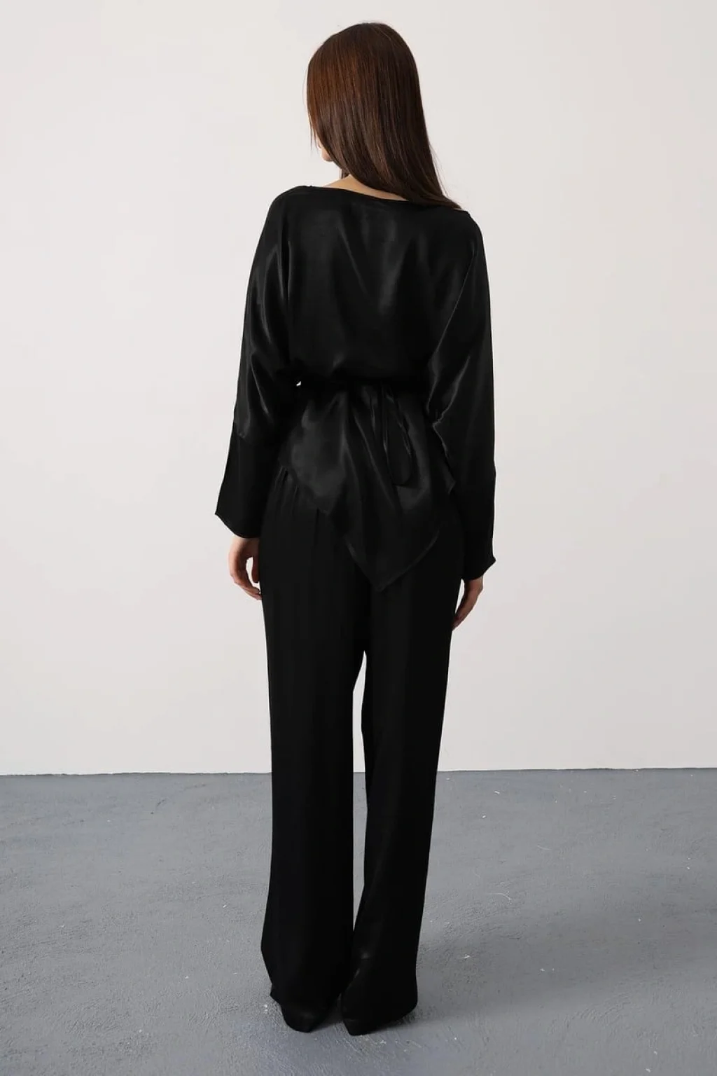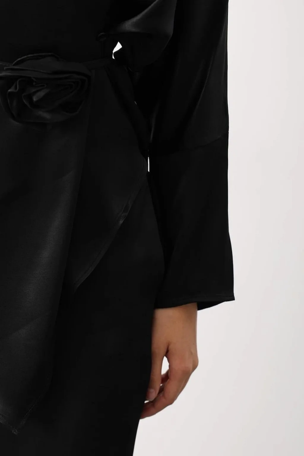 Rosalyn Saten Takım - Siyah, gül detaylı kemeri ve asimetrik kesimiyle klasik saten takımlara modern bir yorum kazandırıyor. %100 polyester kumaşıyla dökümlü ve pürüzsüz bir görünüm sunarken, zarif parlak dokusuyla ışığı yansıtan sofistike bir siluet oluşturur.