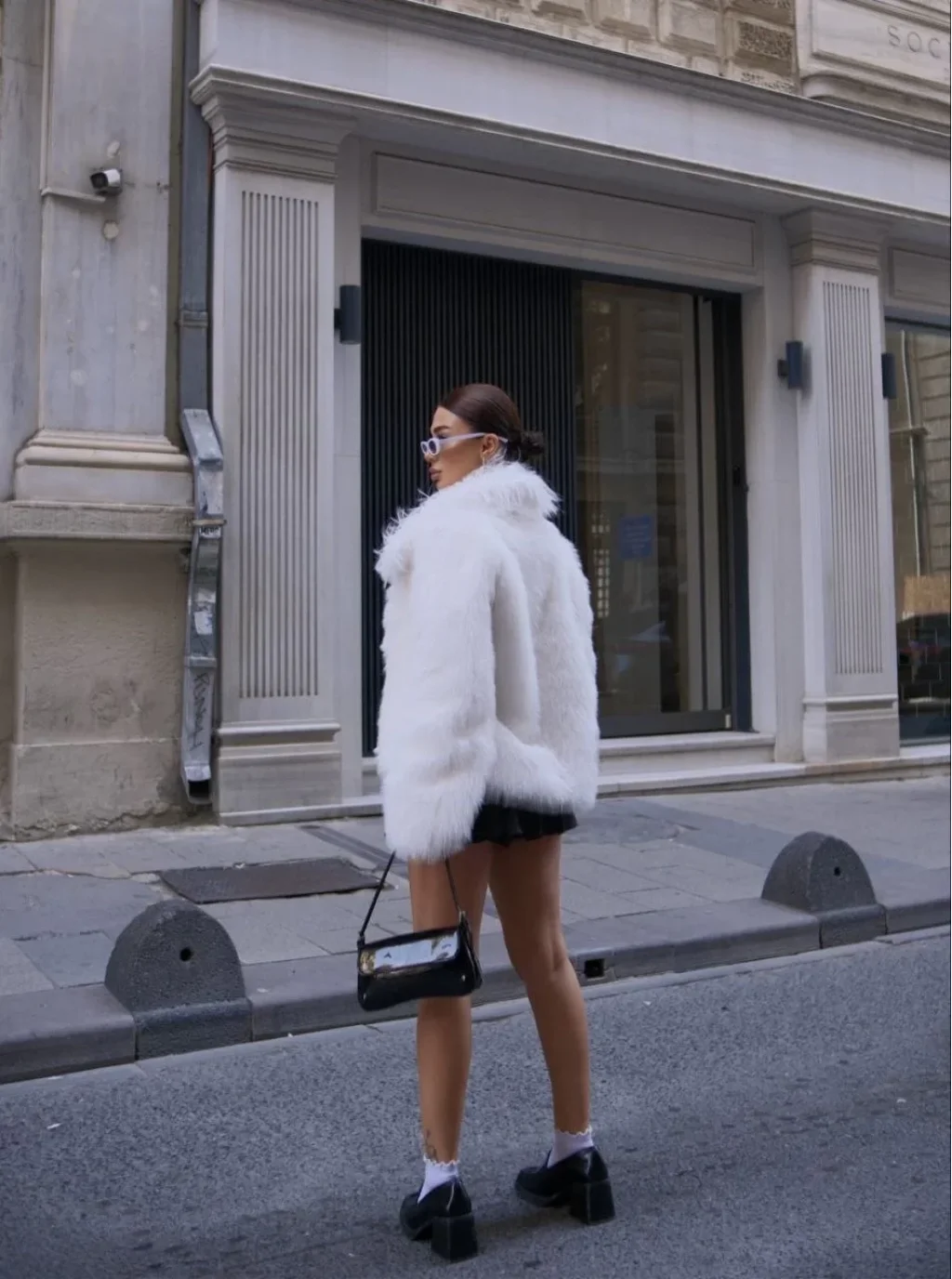 Salaş Sakallı Yumuşak Dokulu Yakalı Cepli Suni Kürk - Beyaz