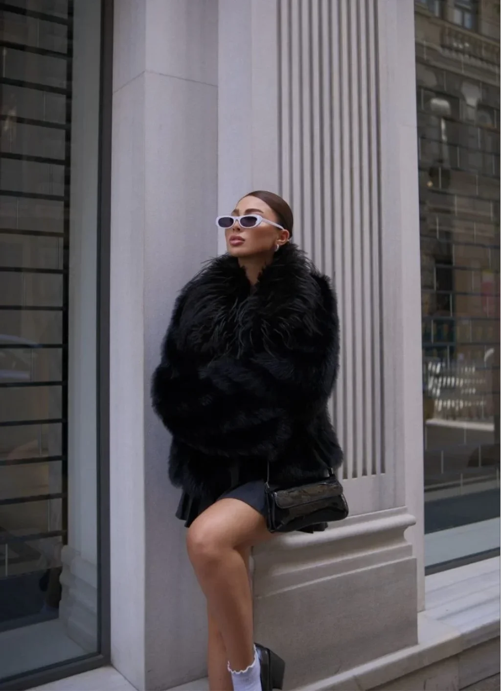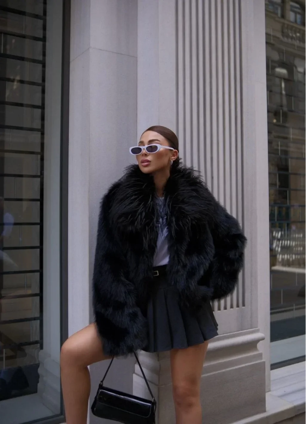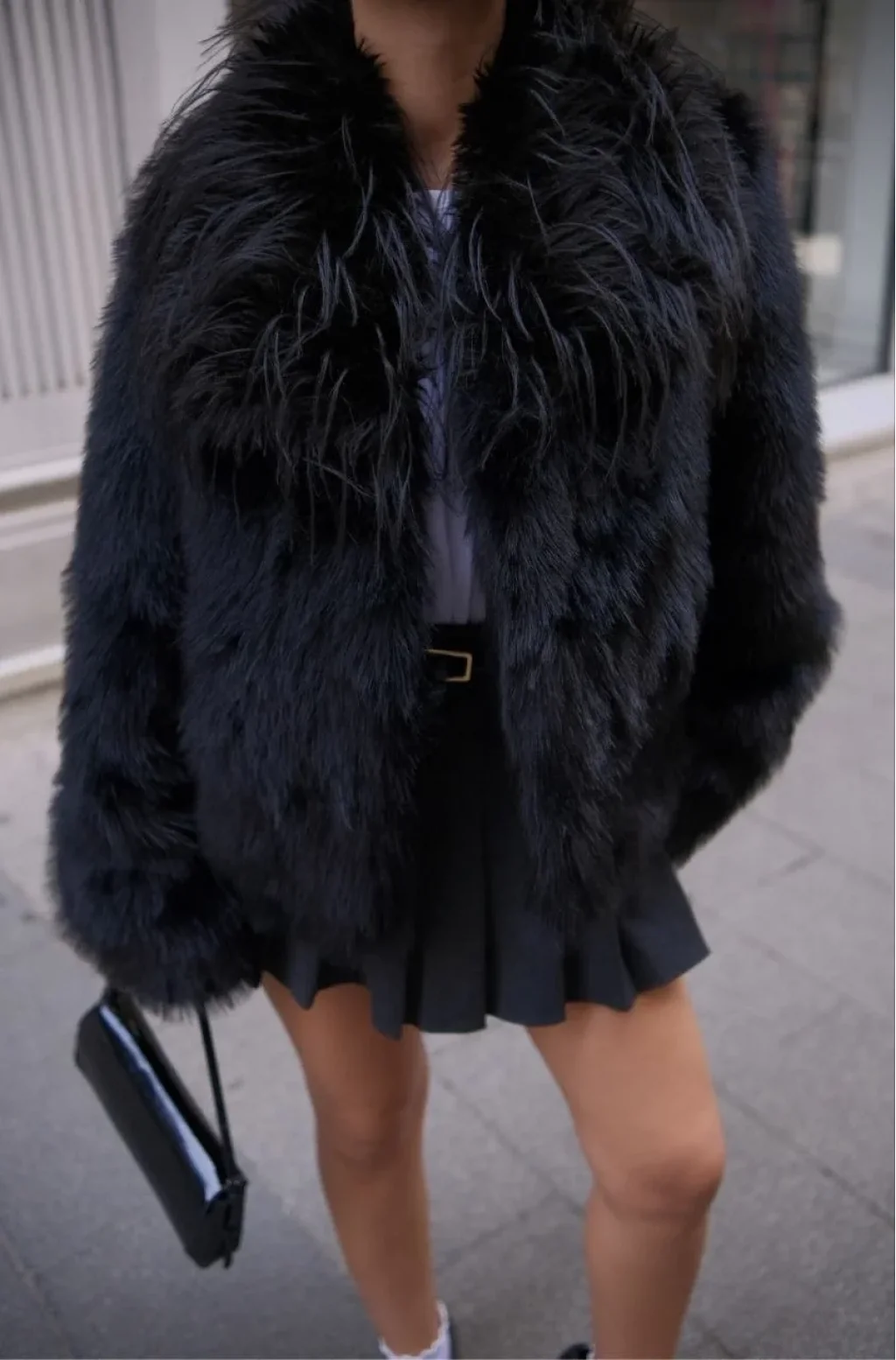 Salaş Sakallı Yumuşak Dokulu Yakalı Cepli Suni Kürk - Siyah