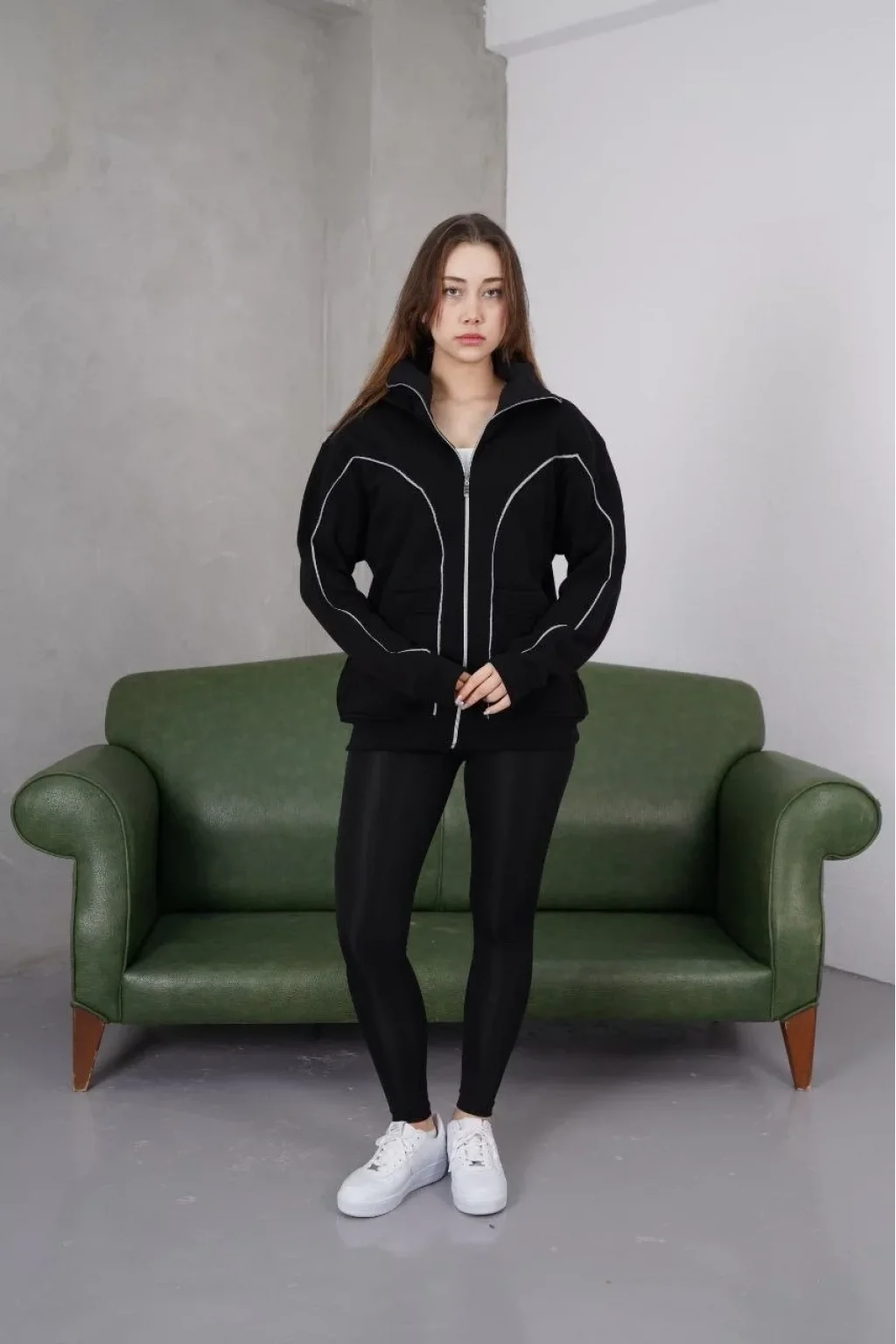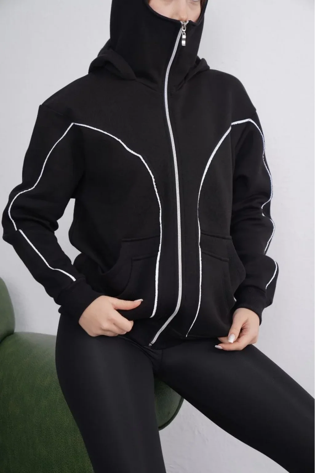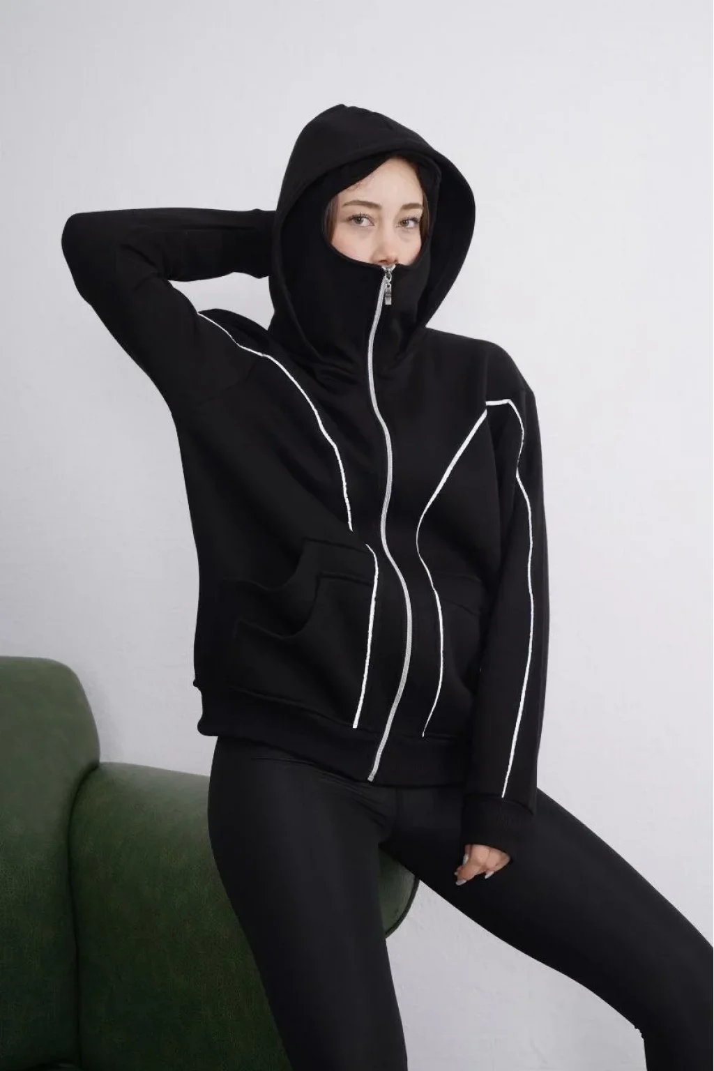Samuray Kapşonlu ZIP Fermuarlı Çift Kapşonlu Reflektörlü SweatShirt - Siyah