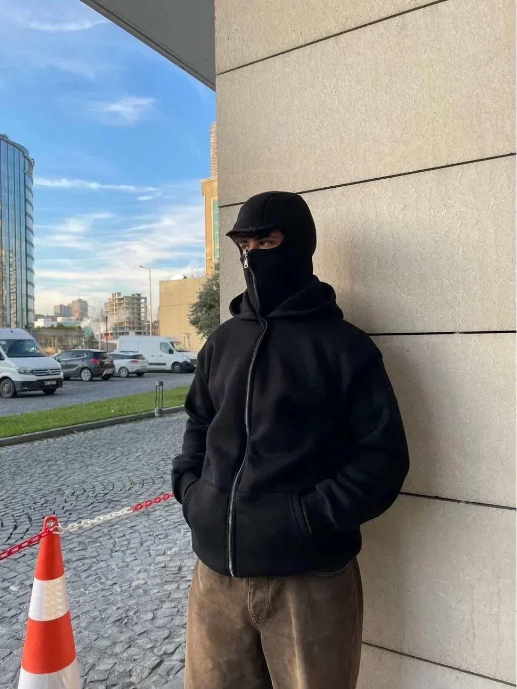 Samuray Ninja Çift Kapşonlu ZIP Fermuarlı Kanguru Çepli Tam Fermuarlı Hoodie Swetshirt - Siyah