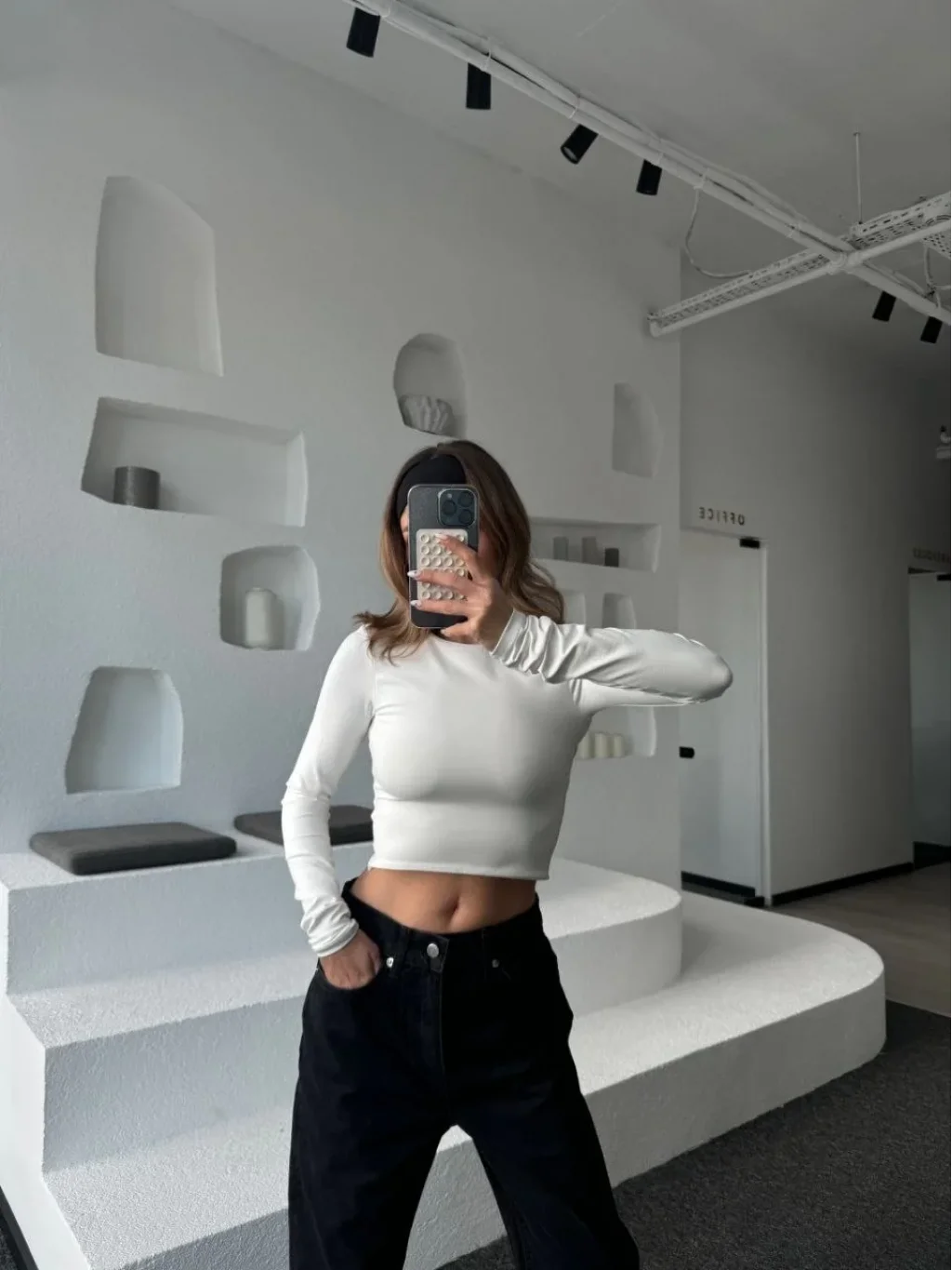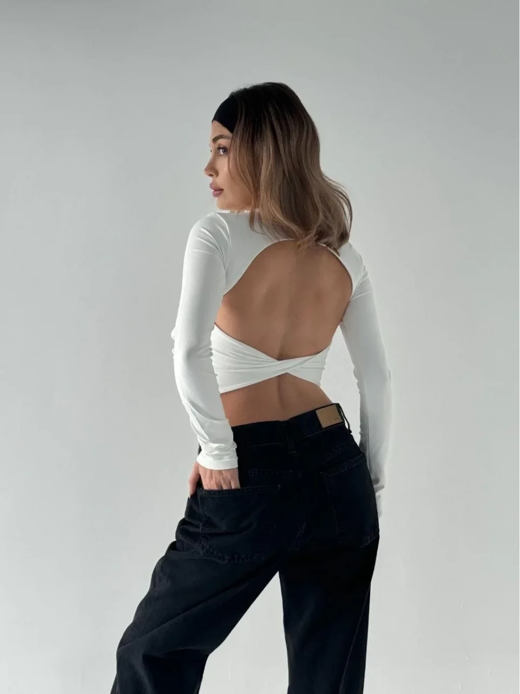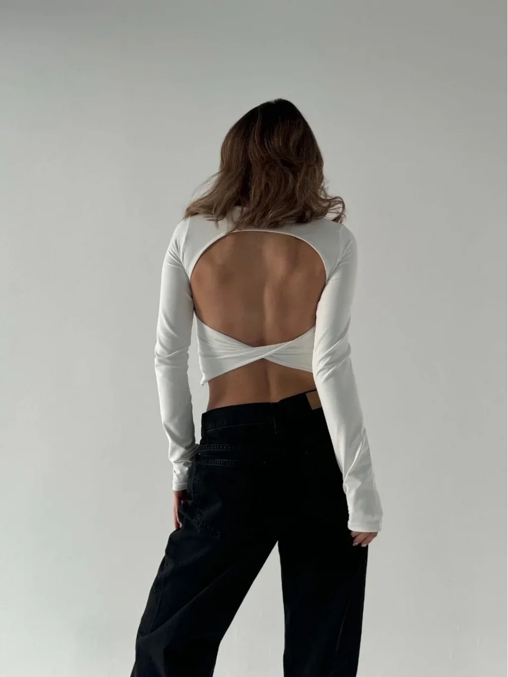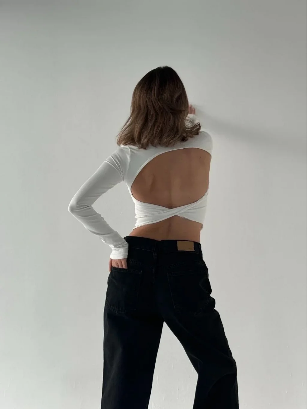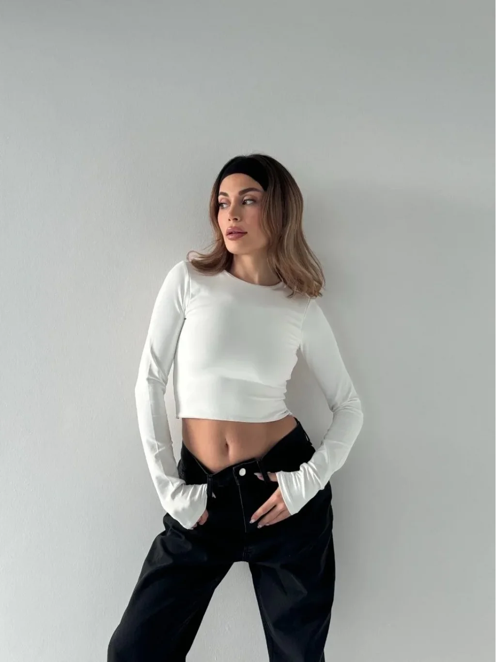 Sırt Dekoltelı Uzun Kollu Crop - Beyaz
