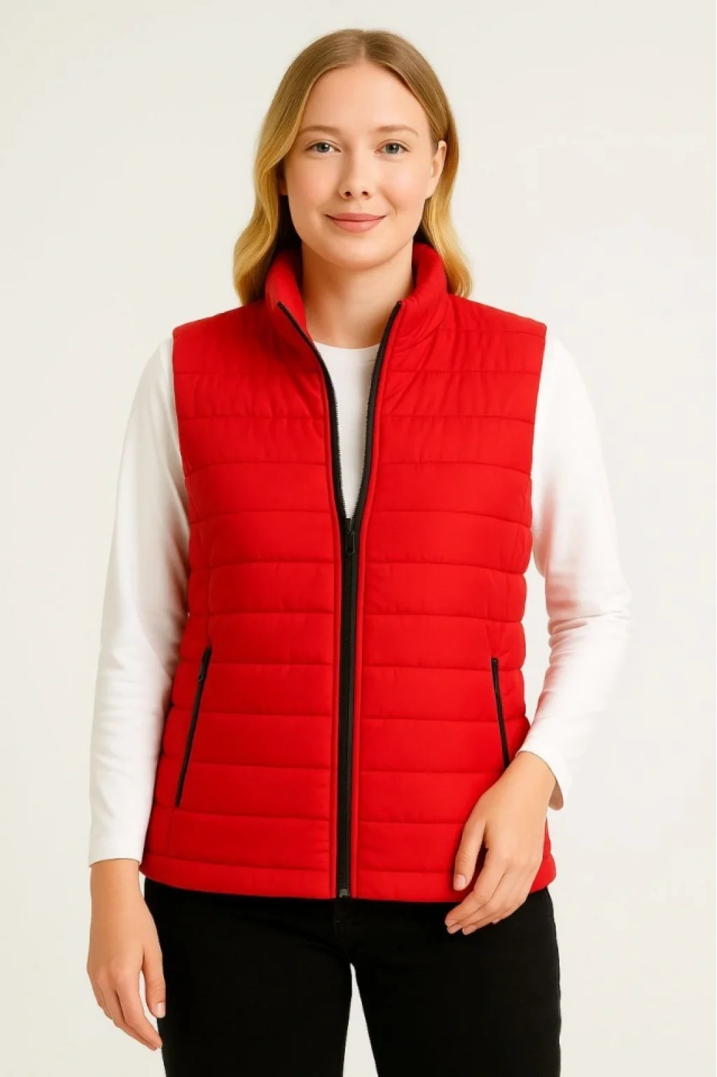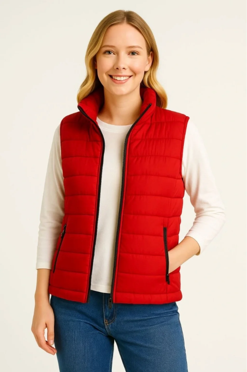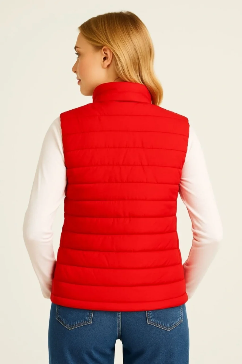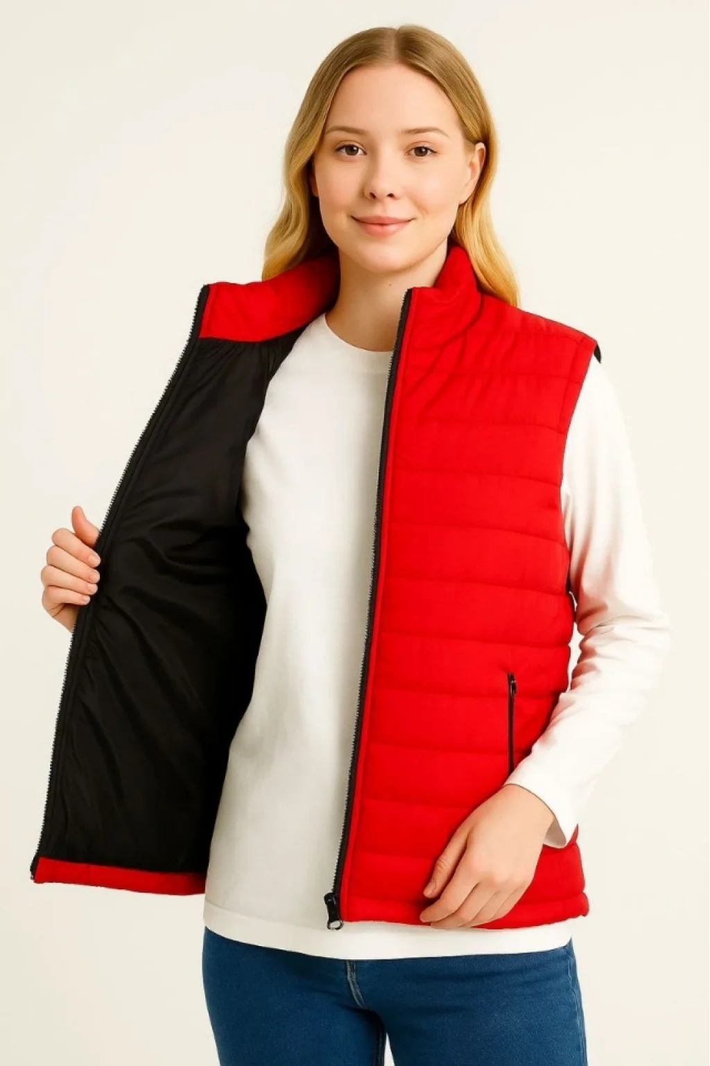 Şişme Fermuarlı Yelek Su Itici Kapitone Astarlı Kumaş Cepli Hafif Kışlık Spor Rahat Kalıp - Kırmızı