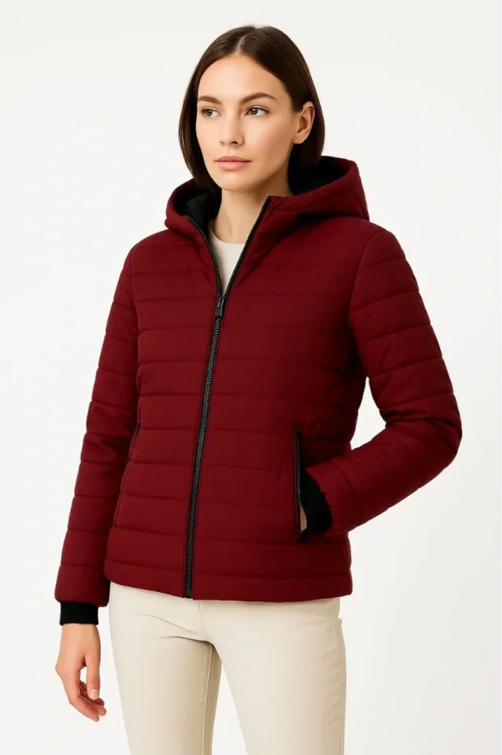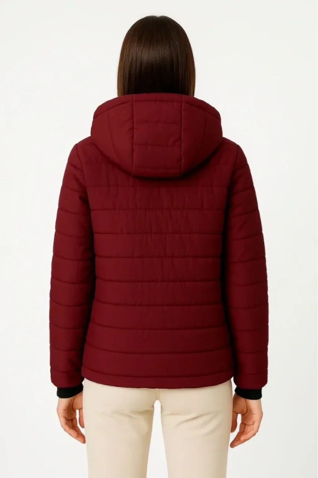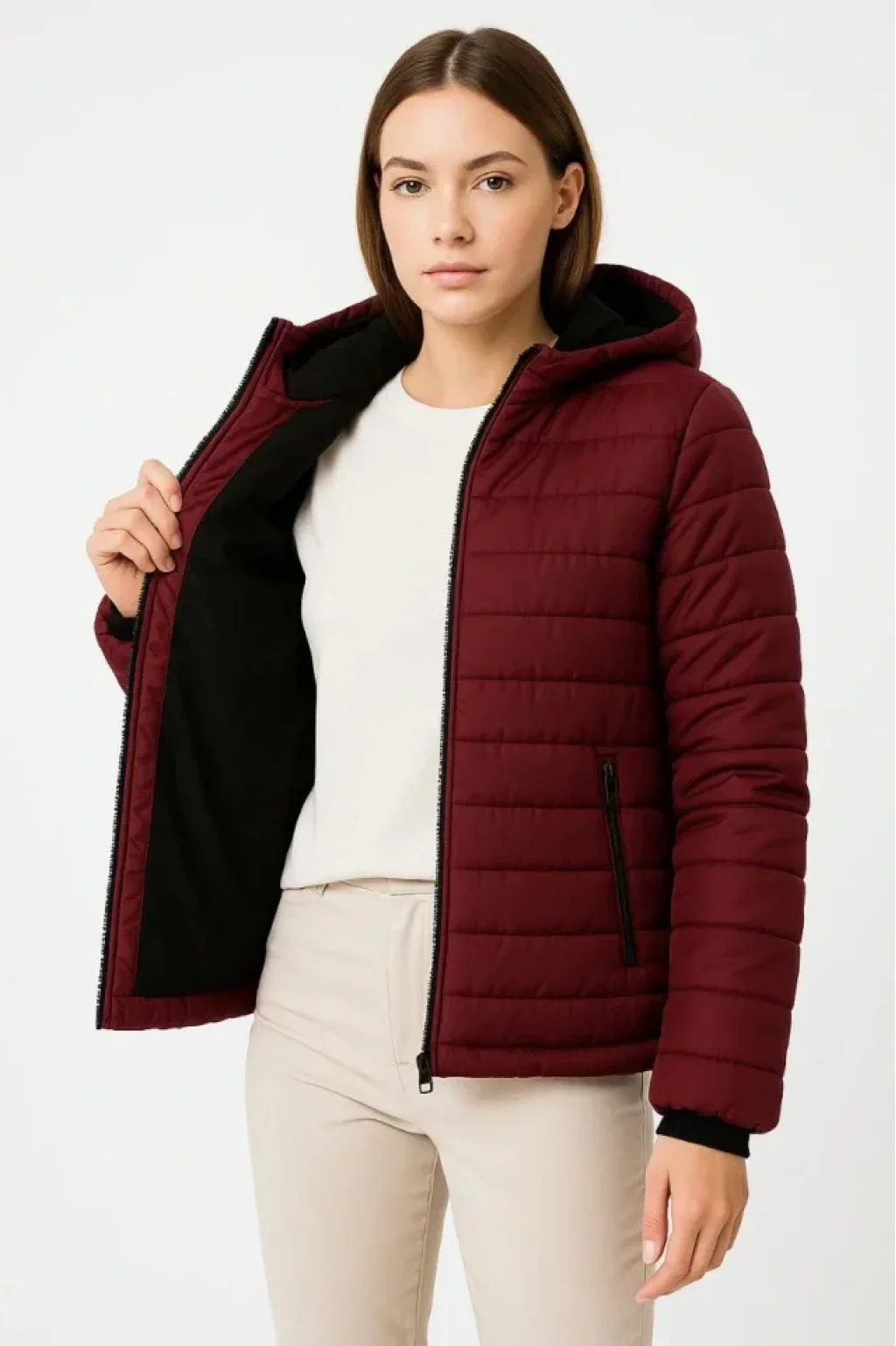 Şişme Kapüşonlu Fermuarlı Mont Su Itici Kapitone Astarlı Kumaş Cepli Kışlık Rahat Kalıp - Bordo