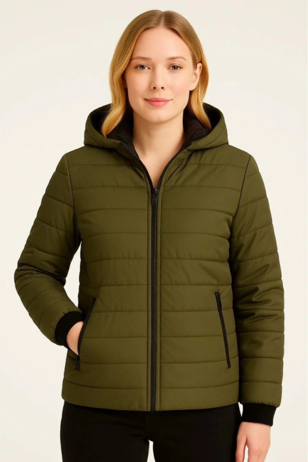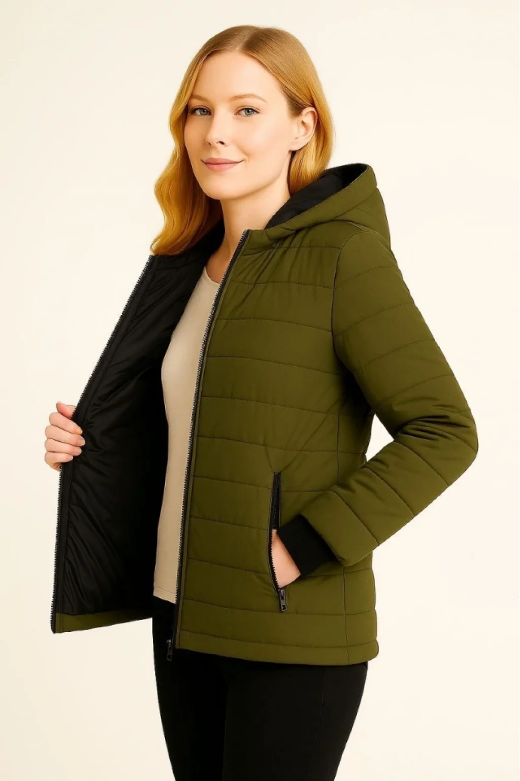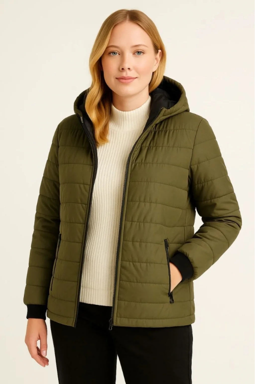 Şişme Kapüşonlu Fermuarlı Mont Su Itici Kapitone Astarlı Kumaş Cepli Kışlık Rahat Kalıp - Haki
