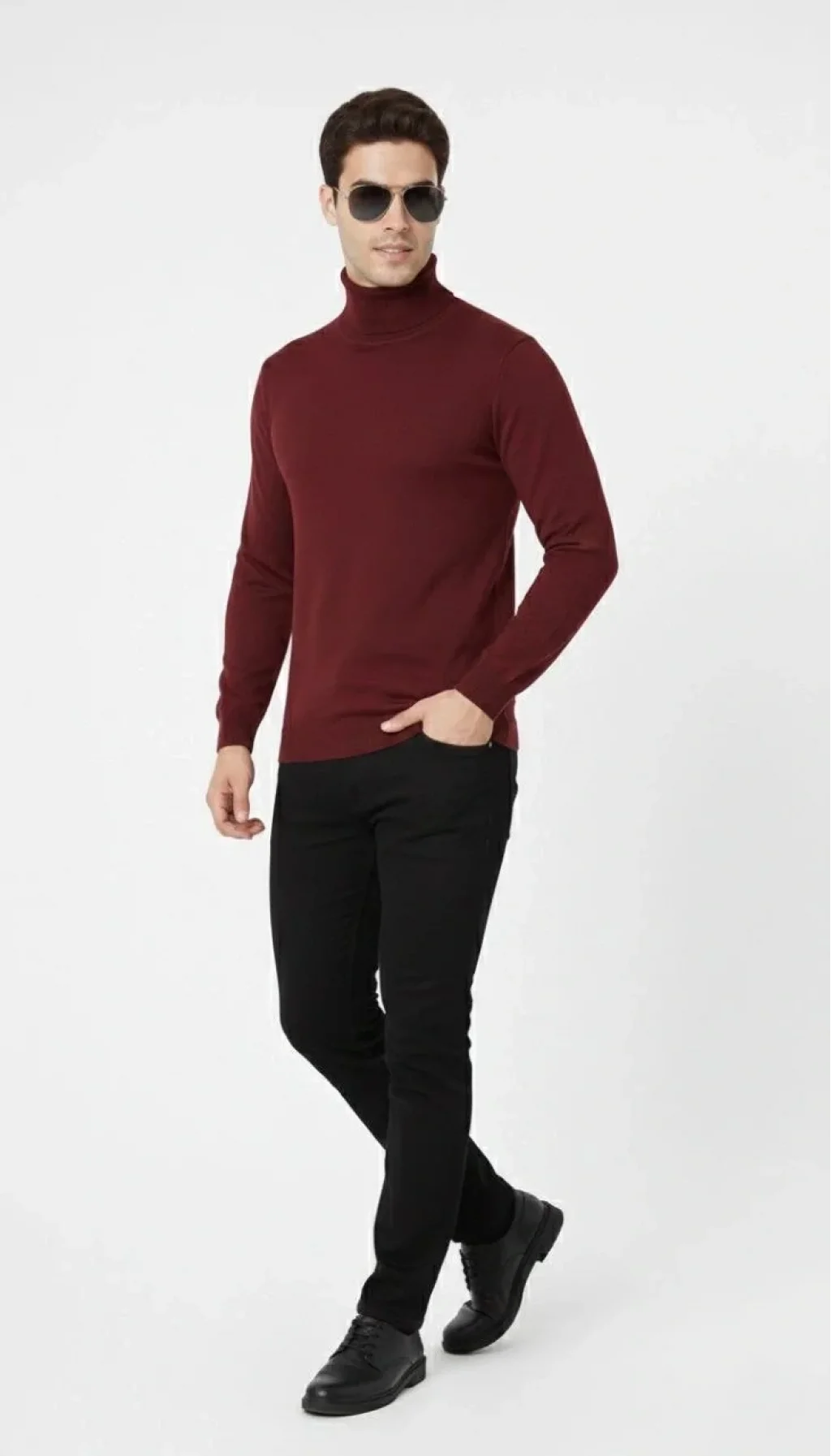 Tam Boğazlı Balıkcı Yaka Triko Kazak yumuşak dokulu Pamuklu ince Dokuma, uzun kollu Rahat Regular kalıp - Bordo