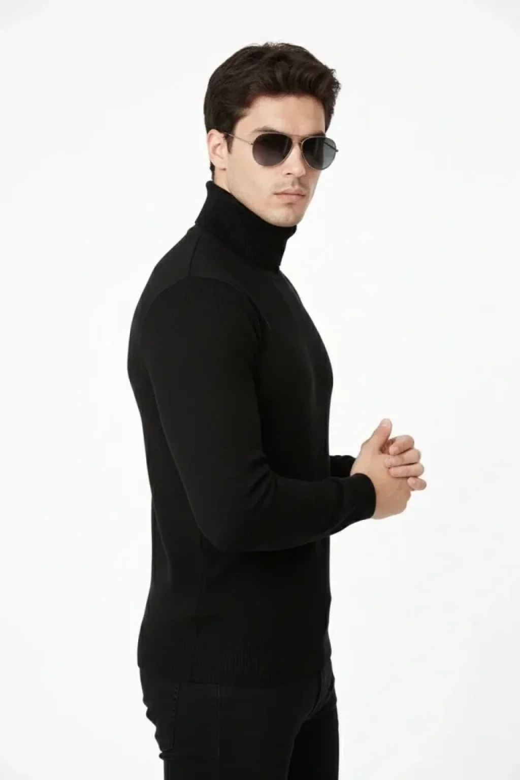 Tam Boğazlı Balıkcı Yaka Triko Kazak Yumuşak Dokulu Pamuklu Ince Dokuma, Uzun Kollu Rahat Regular Kalıp - Siyah