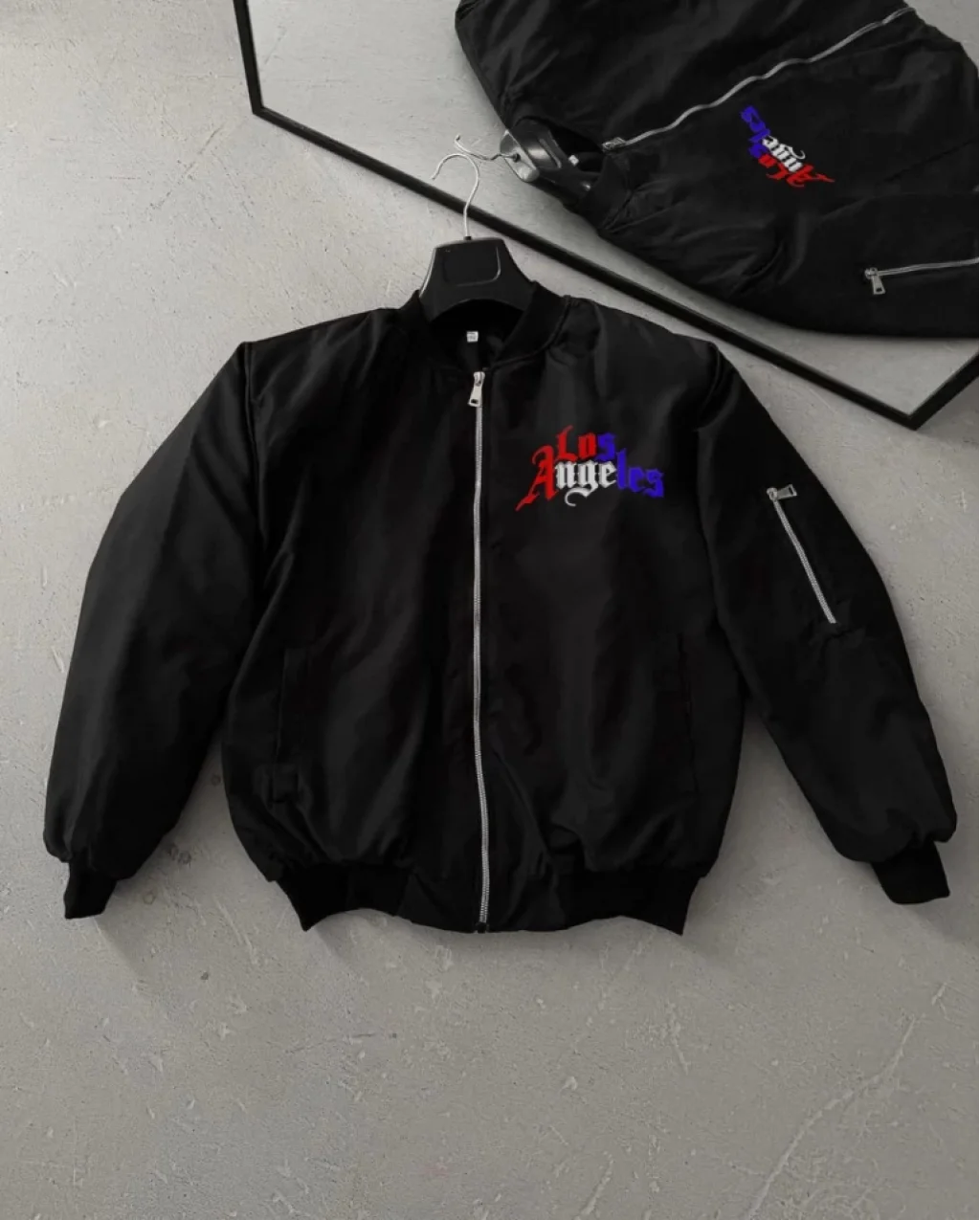 Tam Fermuarlı Uzun Kol Baskılı Bomber Ceket - Siyah