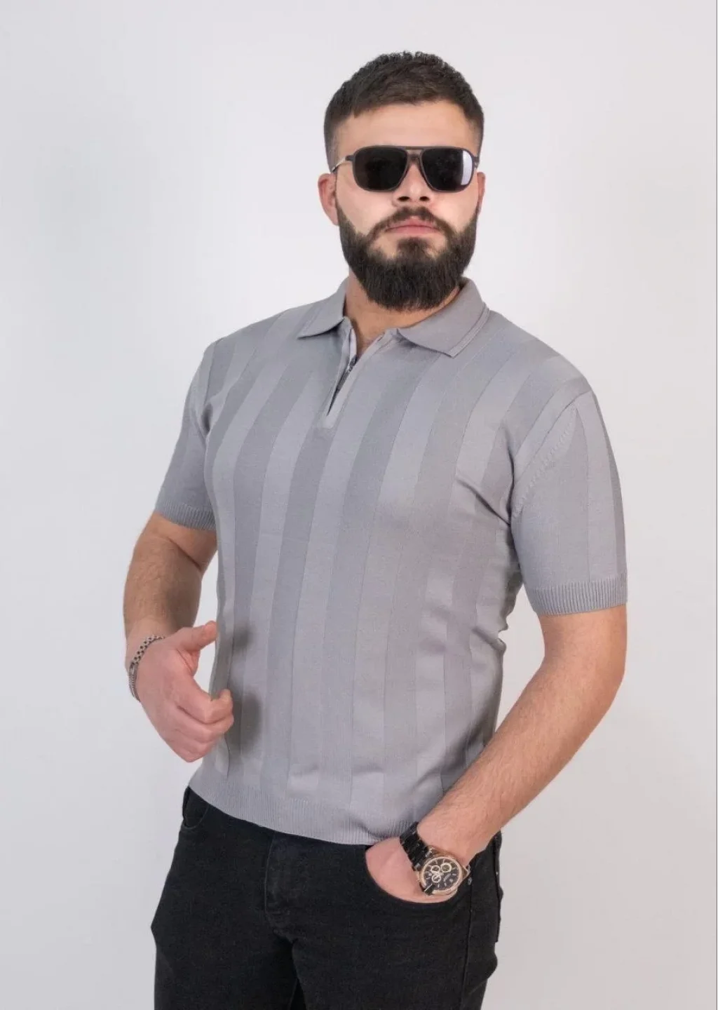 Triko Dokuma Yarım Fermuarlı Yakalı T-shirt - Gri