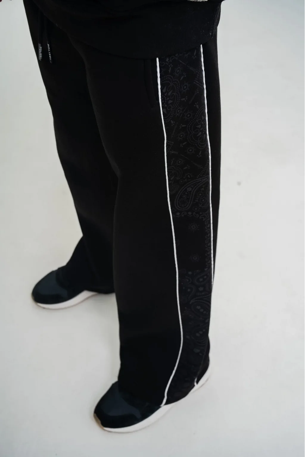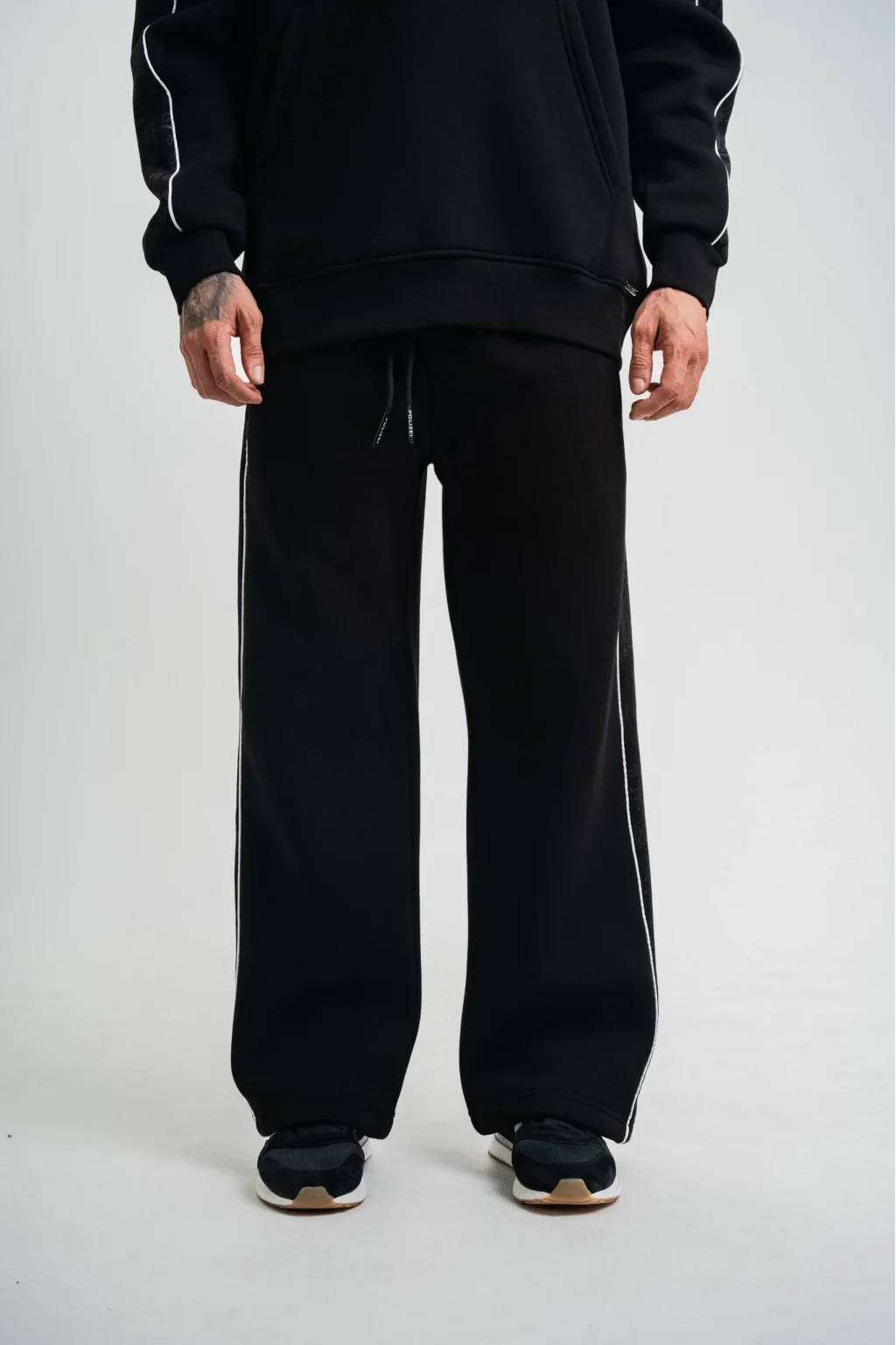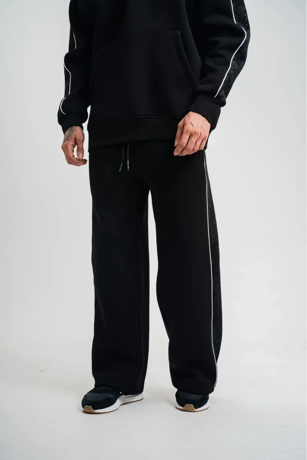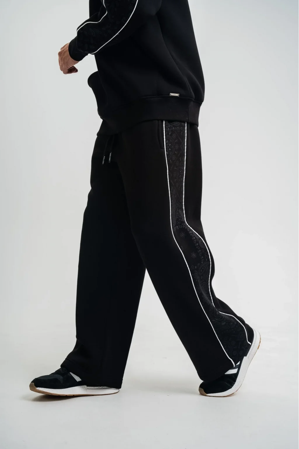 Üç İplik İçi Pamuklu Ara Biyeli Baskılı Baggy Eşofman Pantolon - Siyah
