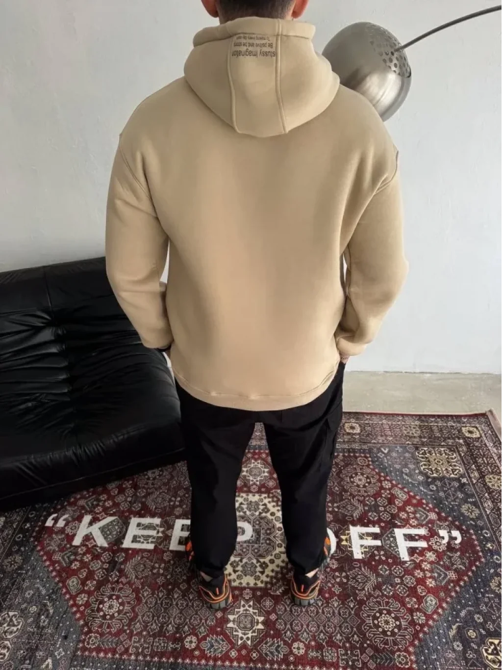 Üç İplik Kapşonlu Baskılı SweatShirt - Bej