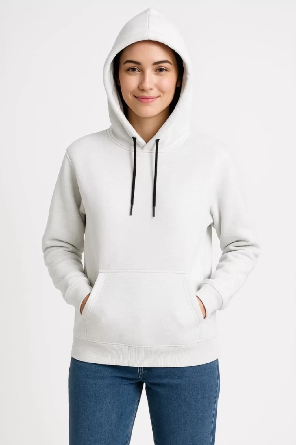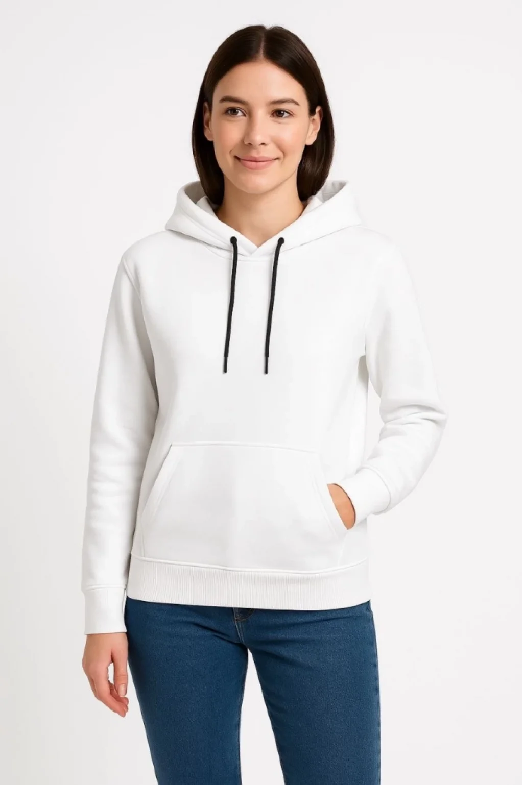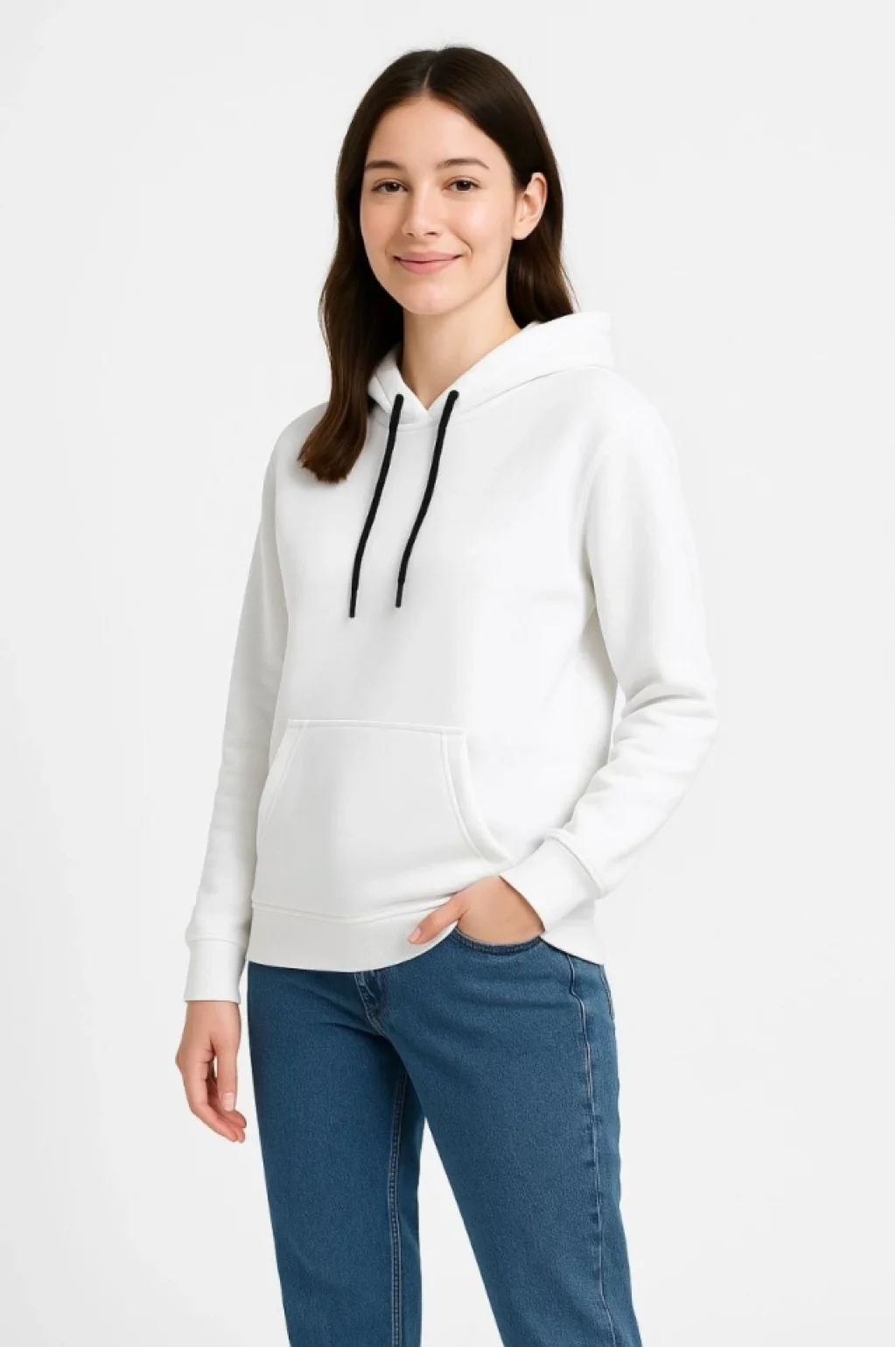 Üç İplik Kapüşonlu Kanguru Çepli SweatShirt Hoodie - Beyaz