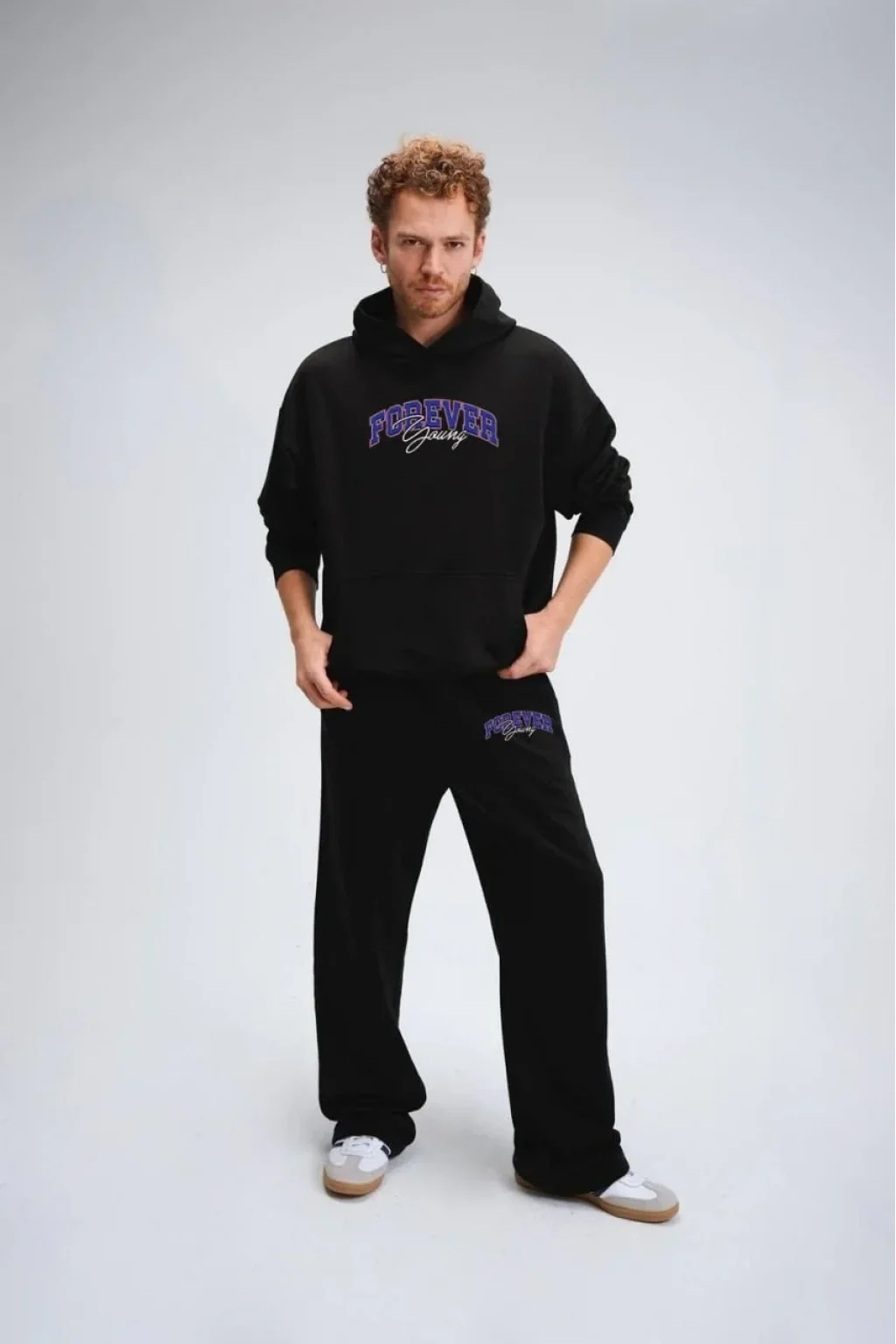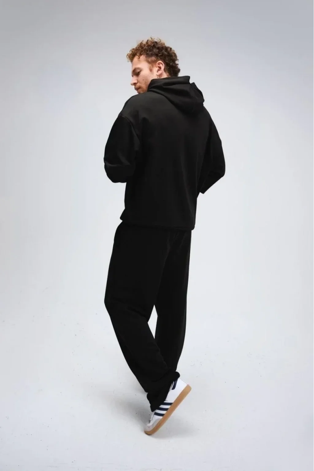 Üç İplik Oversize Kapüşonlu Boru Paça Baskılı Eşofman Takım - Siyah