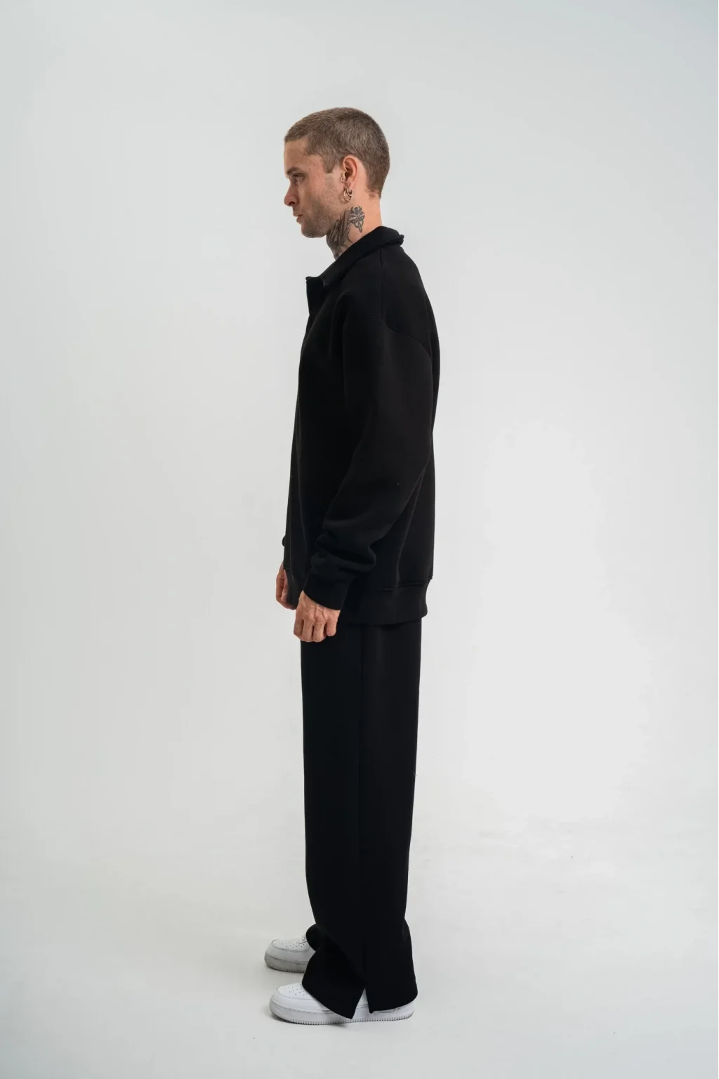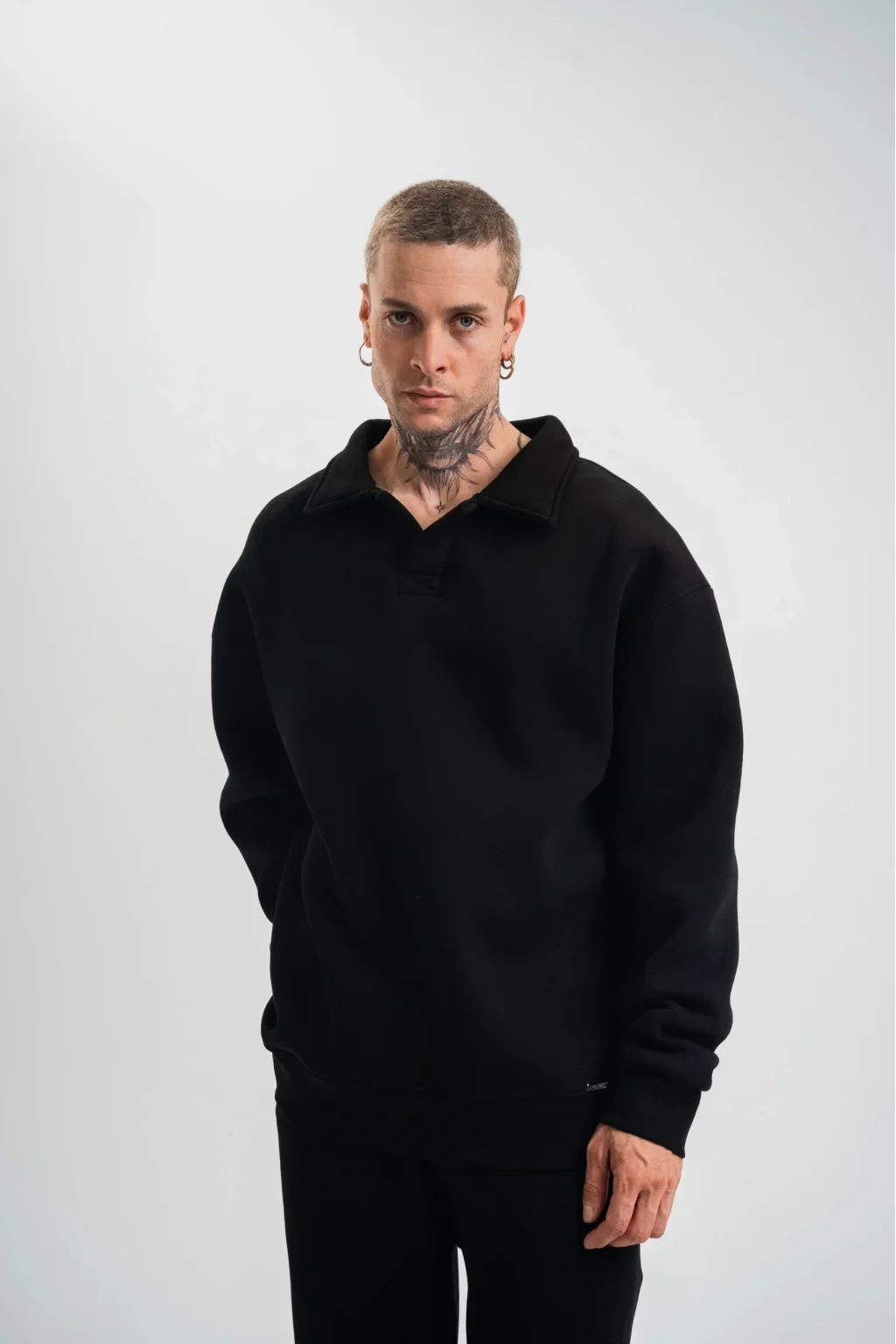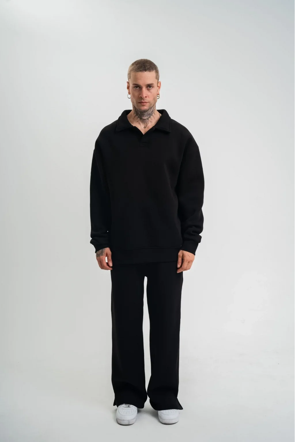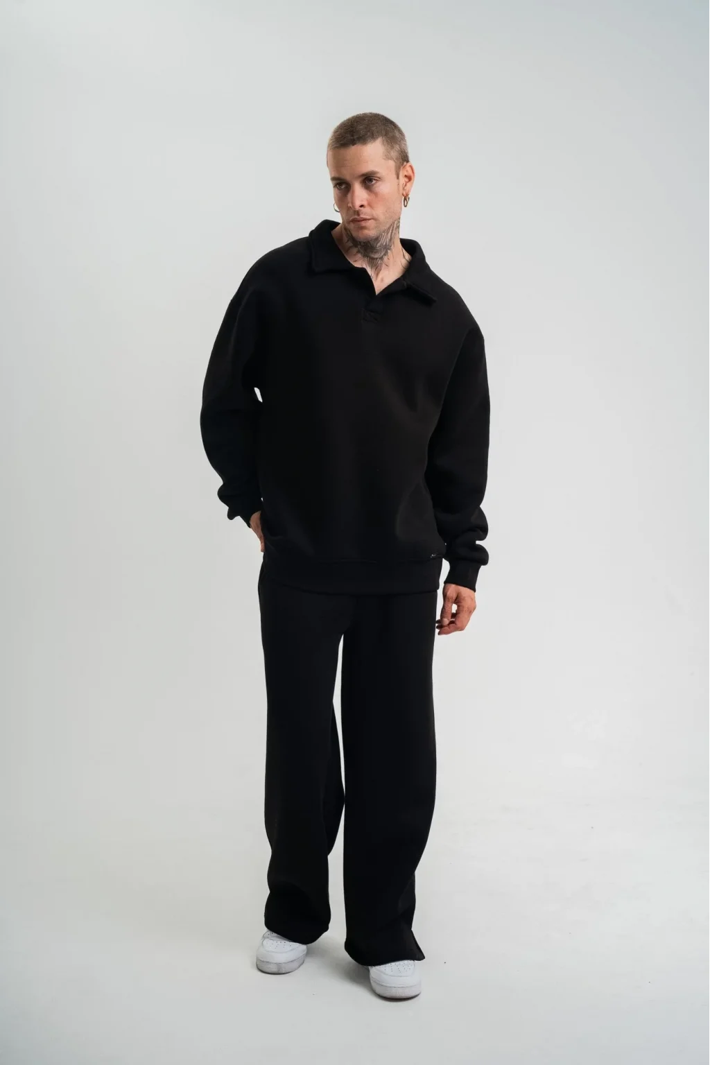 Üç İplik Uzun Kol Yakalı Eşofman Takım - Siyah
