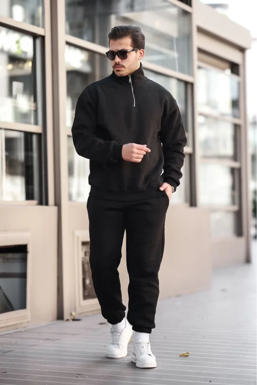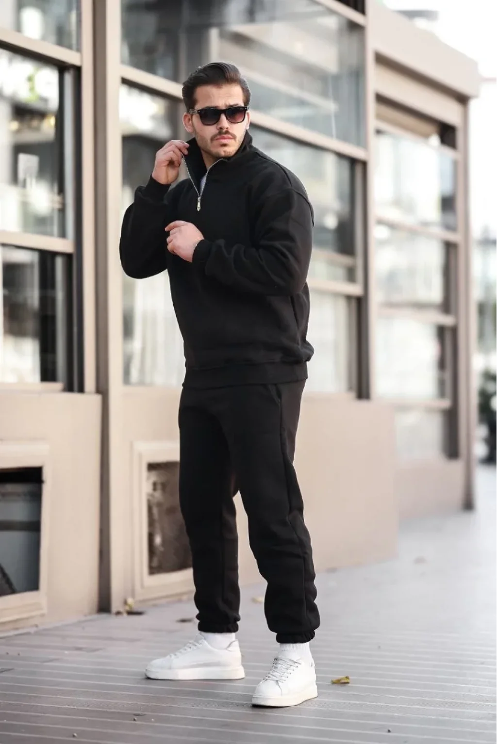 Üç İplik Yarım Fermuarlı Eşofman Takım - Siyah