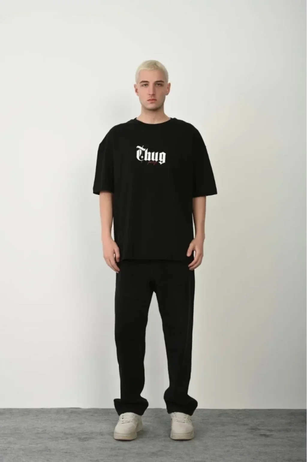 Unisex Baskılı Bisiklet Yaka Oversize T-Shirt - Siyah