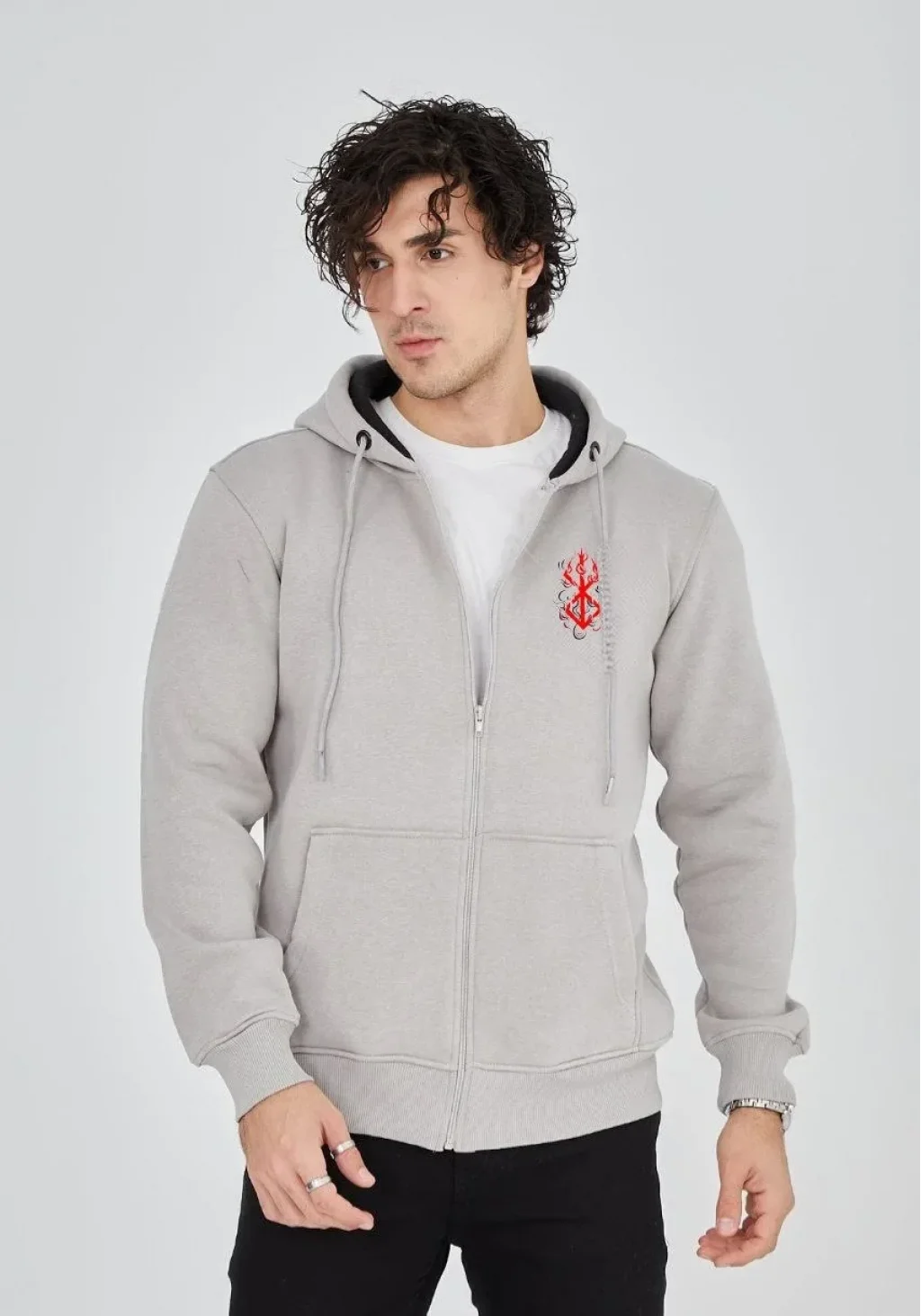 Unisex Baskılı Tam Fermuarlı Kapşonlu SweatShirt - Boyalı Gri